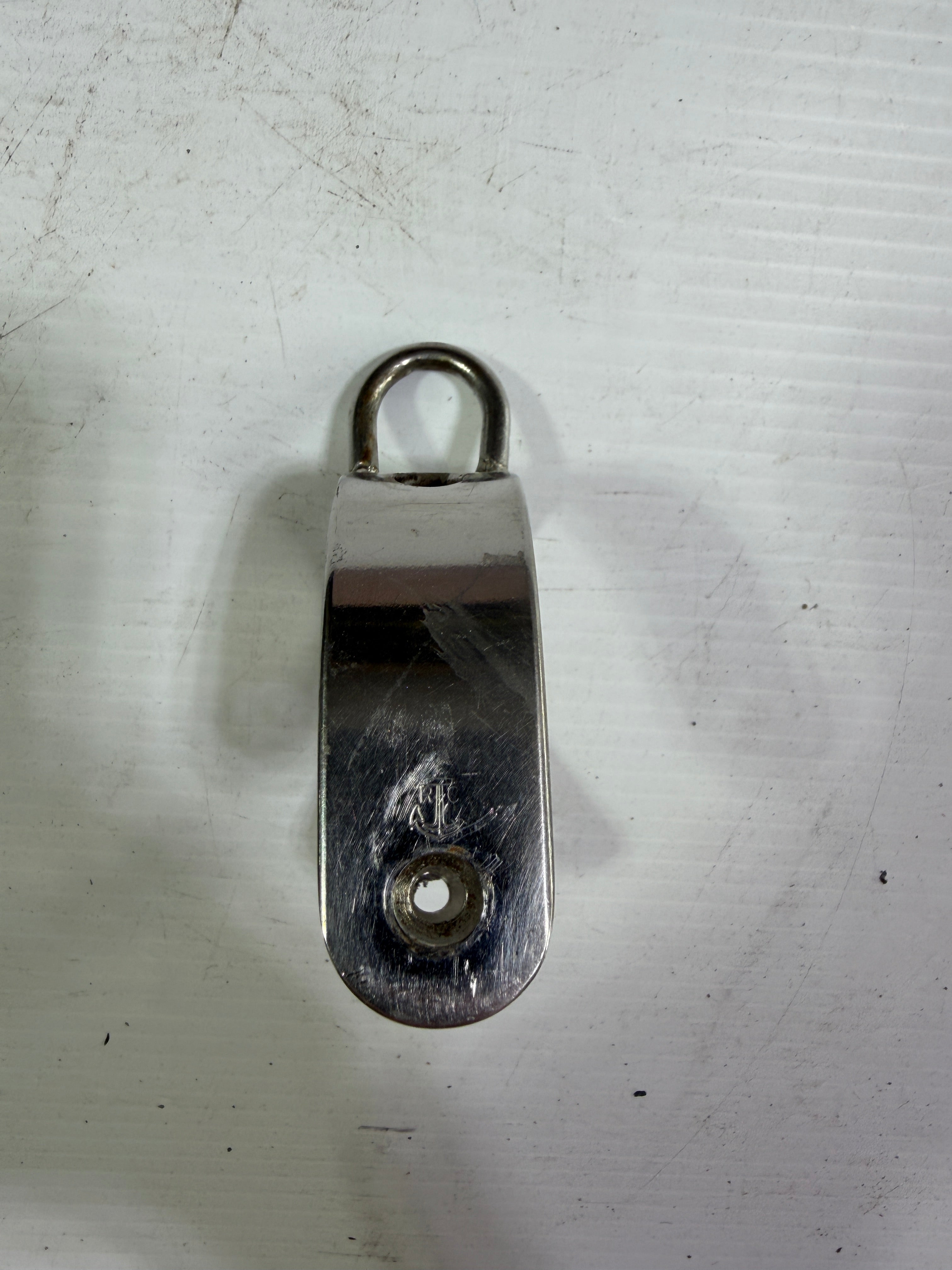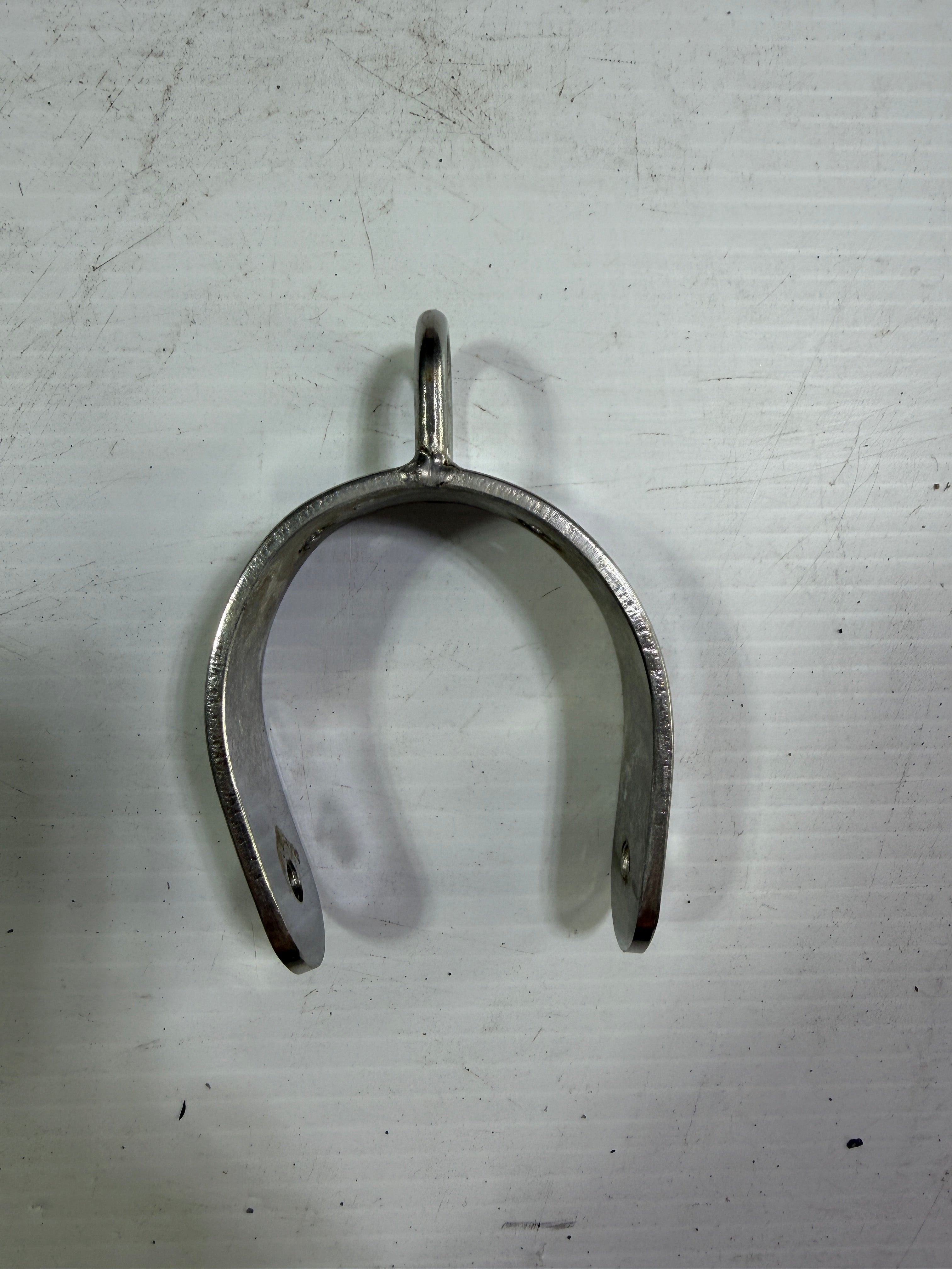 2 1/4" inner Diameter Pole Boom Fitting. The end (tip to tip) is 1 1/2" Width. It is slightly angled. Top eye is a 1/2" x 3/4"