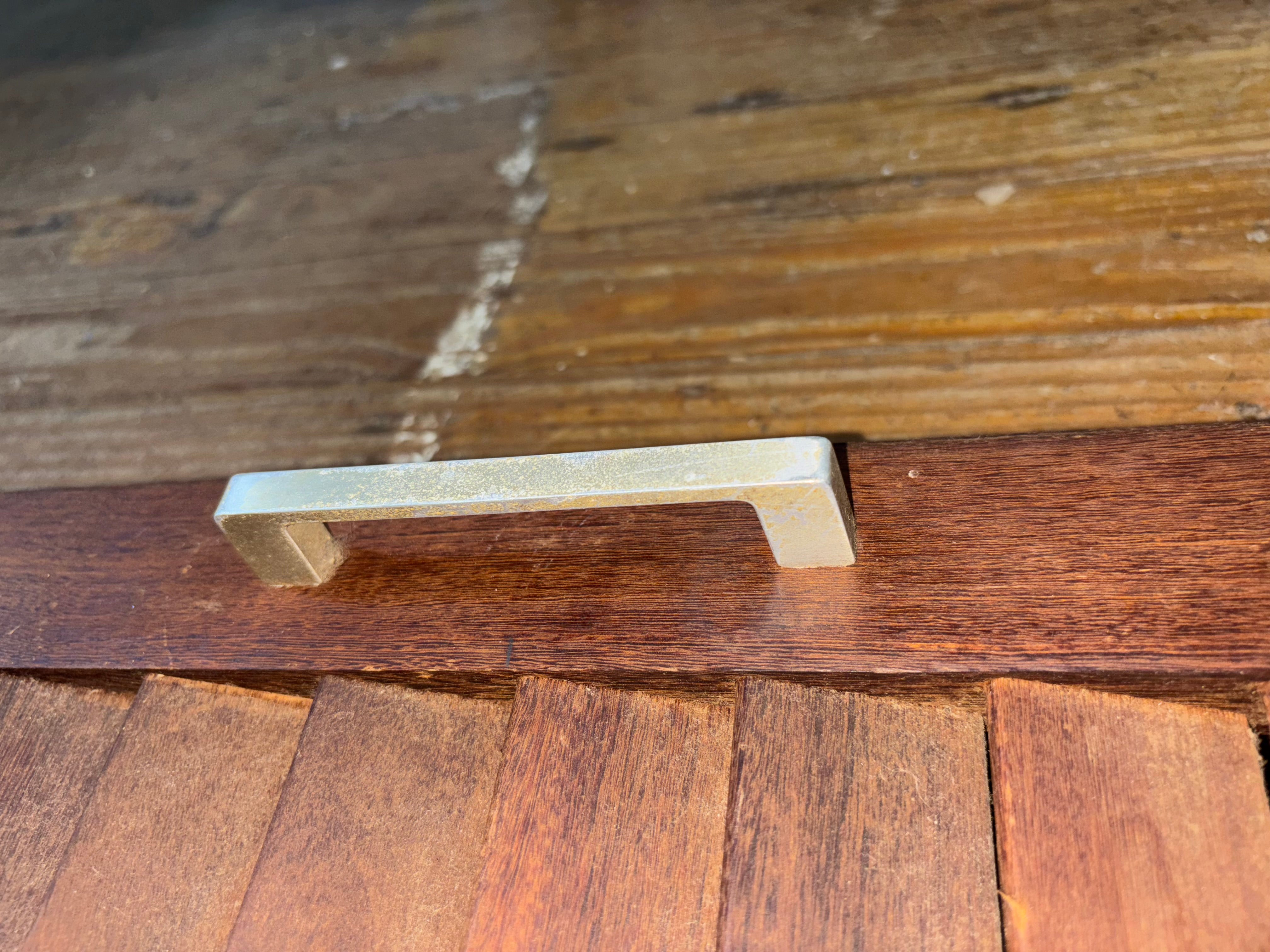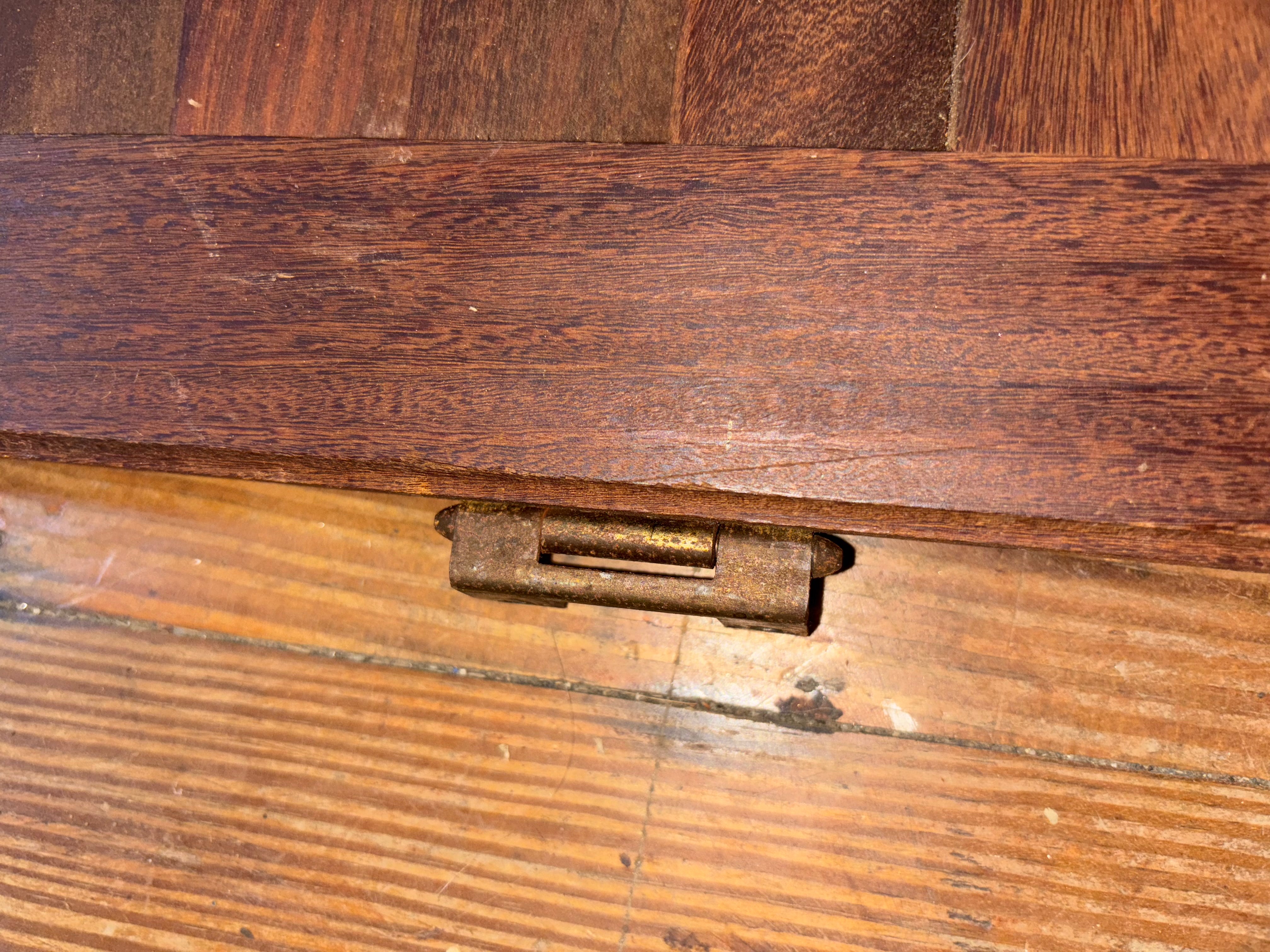 This long interior louvered door was removed off a silver ton 32 boat. This door is in good condition, there is a small crack to it in the one close up louvered photo, it is minor. The hinges are slightly rusting but work. The handle is in good condition. The door measures 40" long x 9" wide.