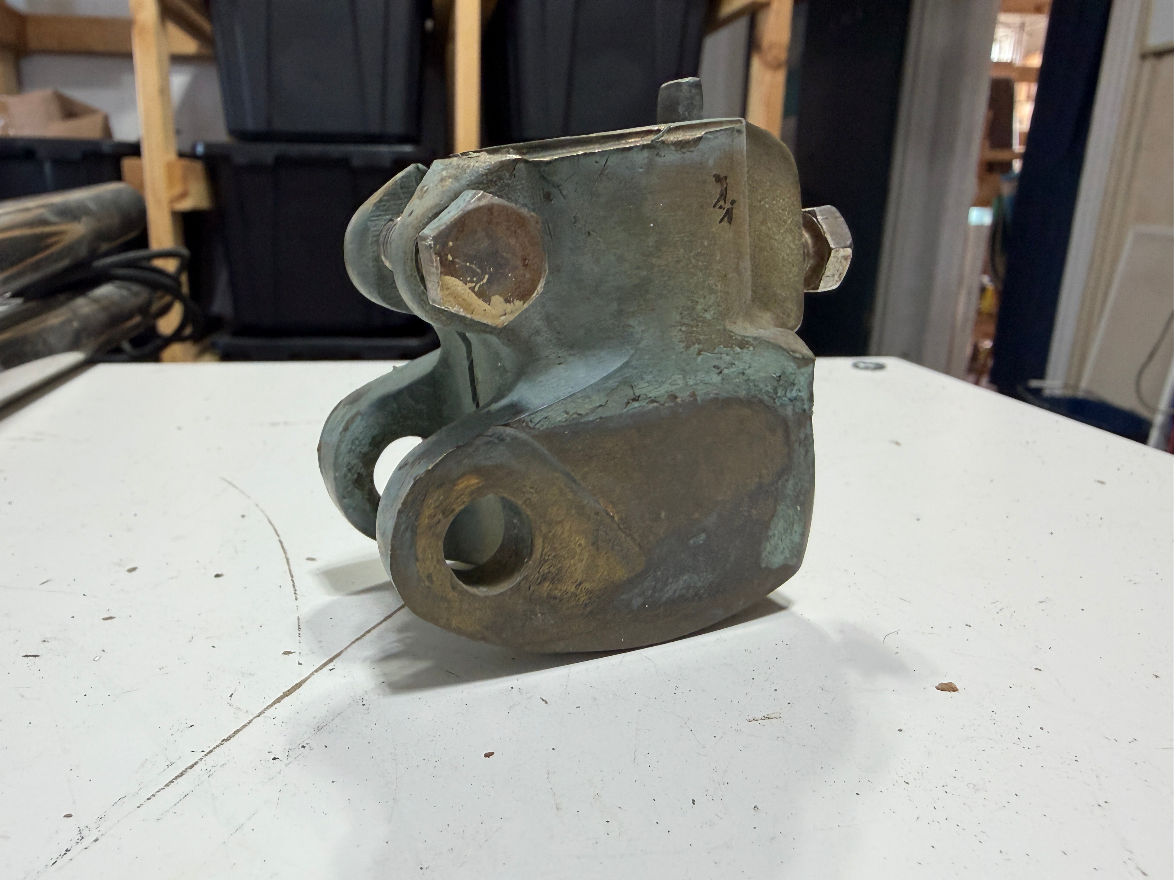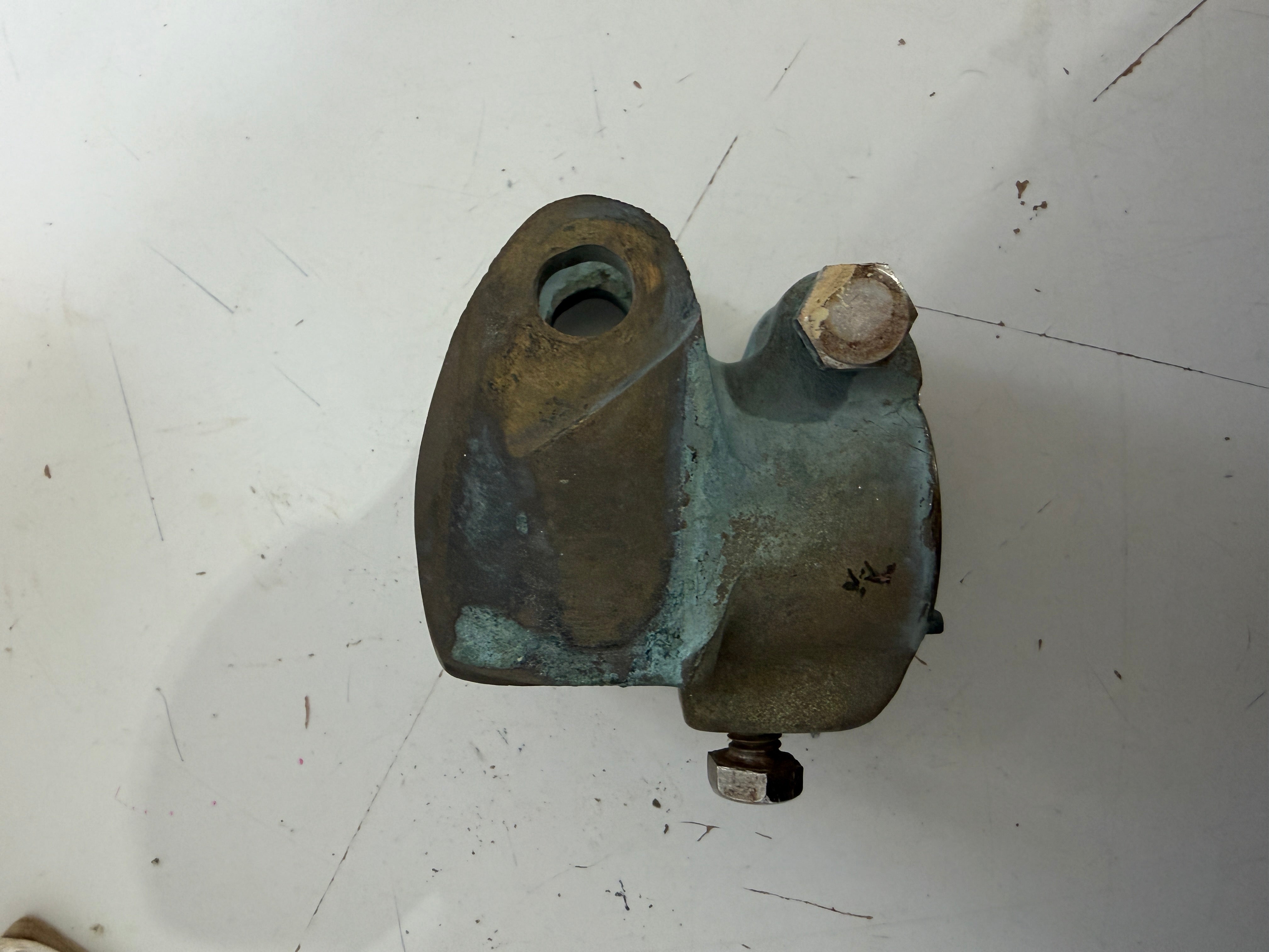 Vintage Bronze Rudder Tiller Cap. Has a 1 3/16" diameter keyed post hole. The width to be attached to tiller is 3/4" with a 1/2" diameter pin.