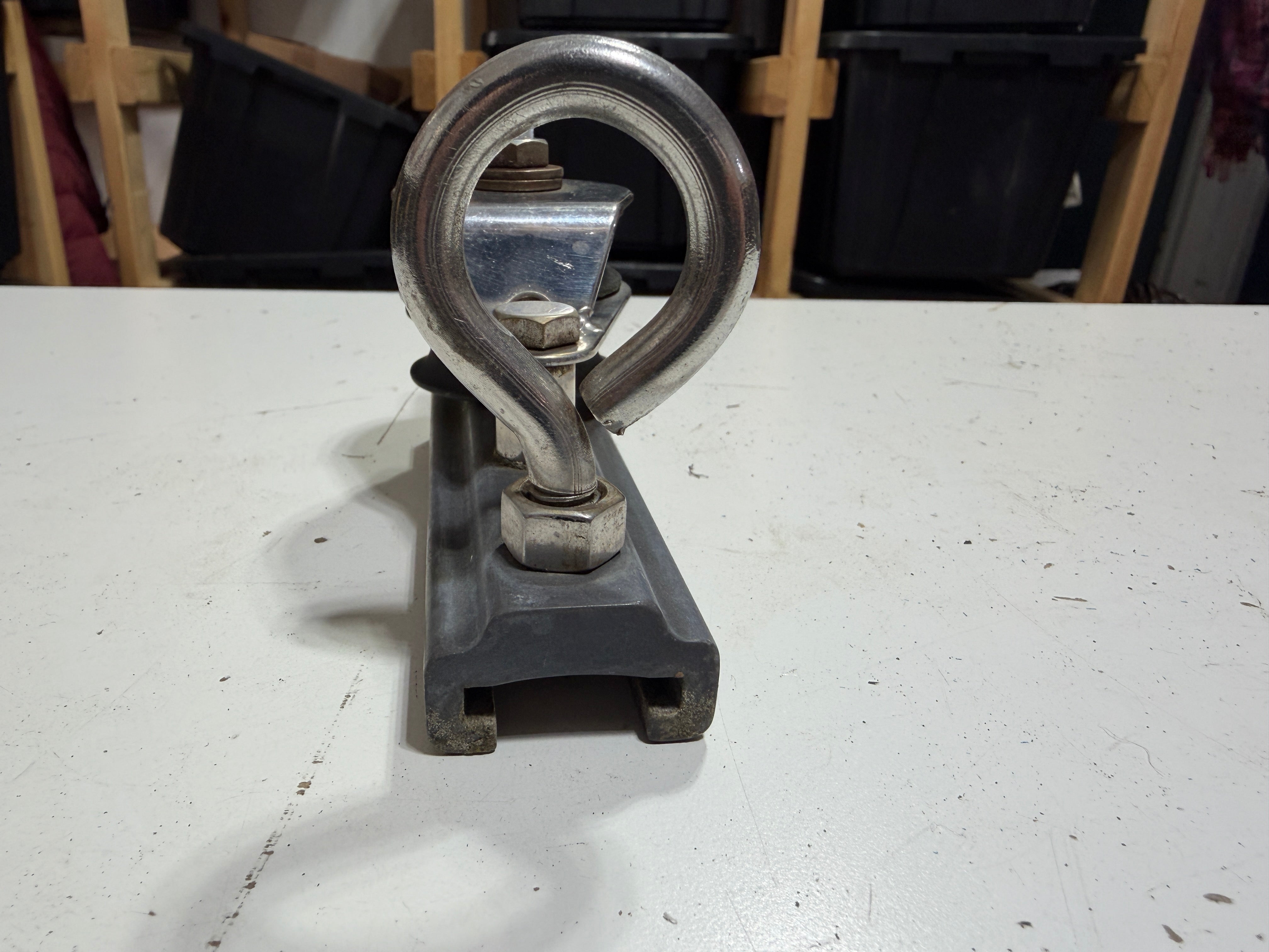 Fits a 1" track size. Double Sheave Track Car it has a 1 7/8" diameter sheave and fits max 3/8" Line diameter. The area to where it twists is a bolt situation - looks handmade done so it's just an easy way to be turned. The track car length is 4 1/2". Stands 2 1/2" total length.