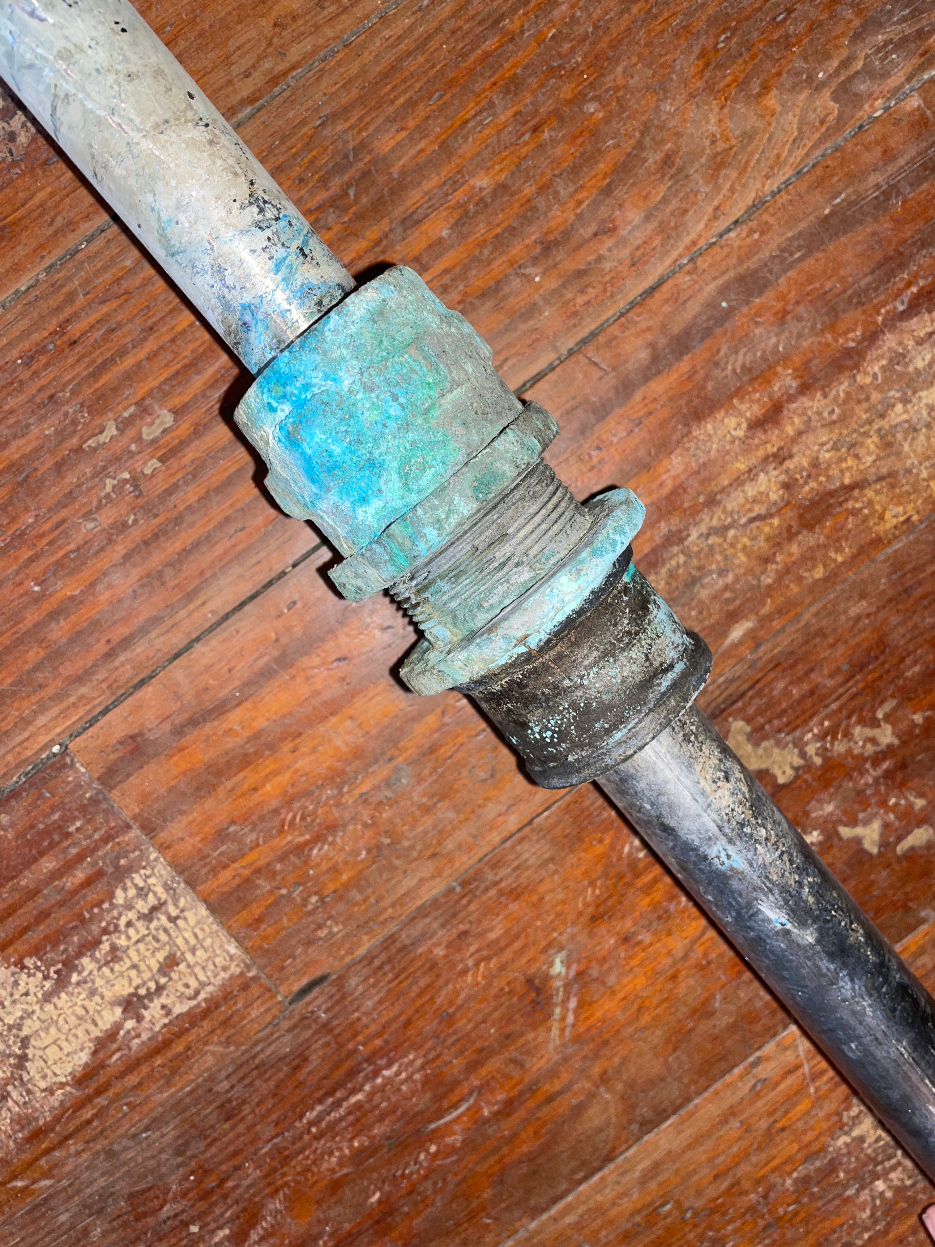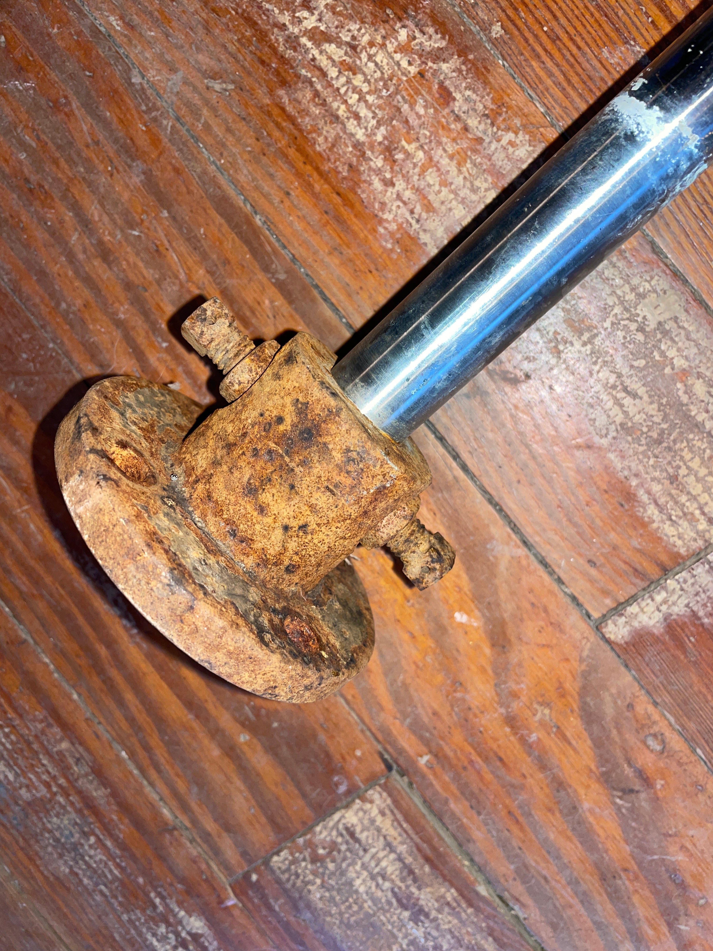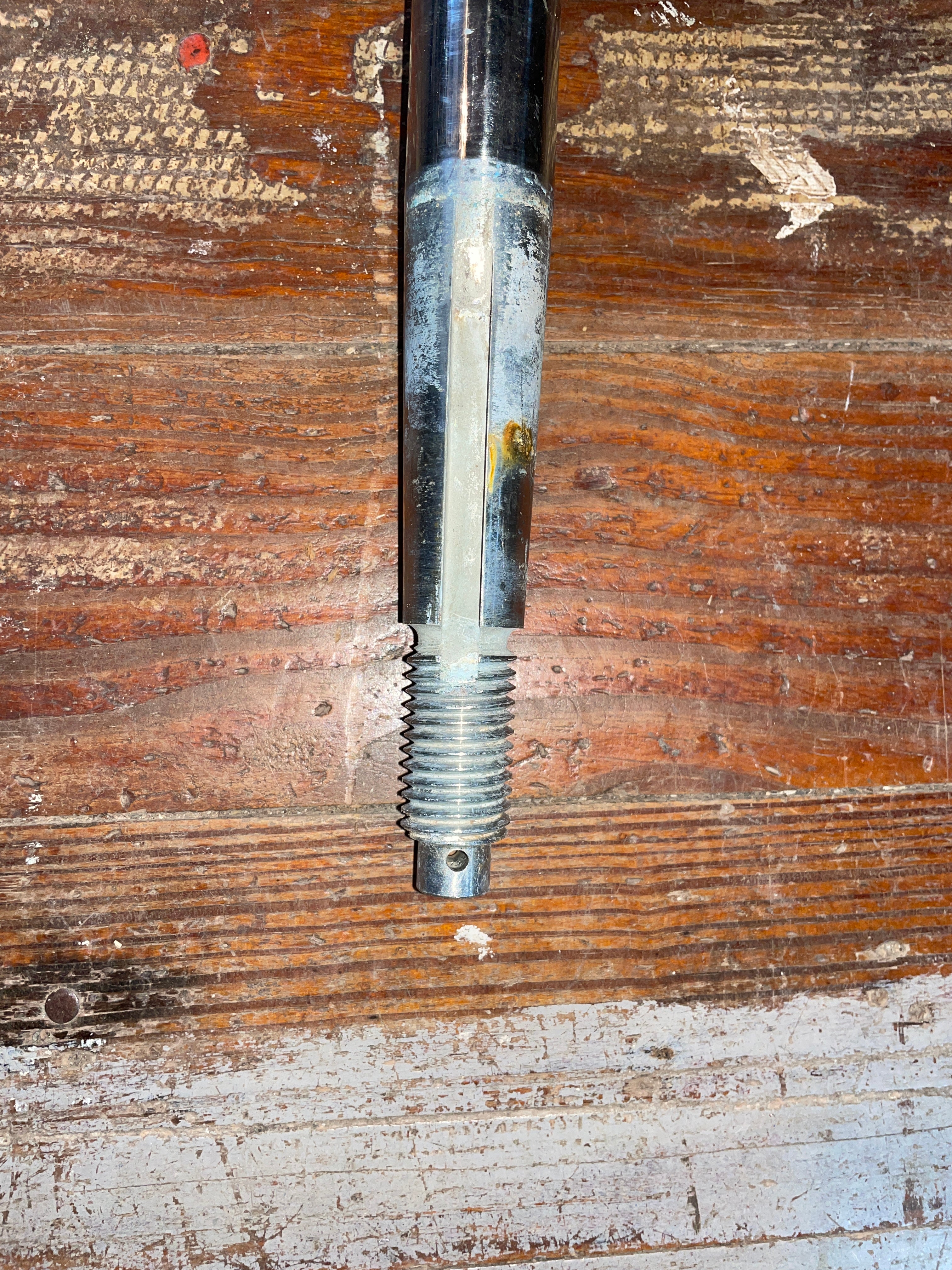 This SS propeller shaft is 1” and tapers at the top. Has a spot for a 1/4” x 3” key. The shaft is 4’ 7/16” total length.