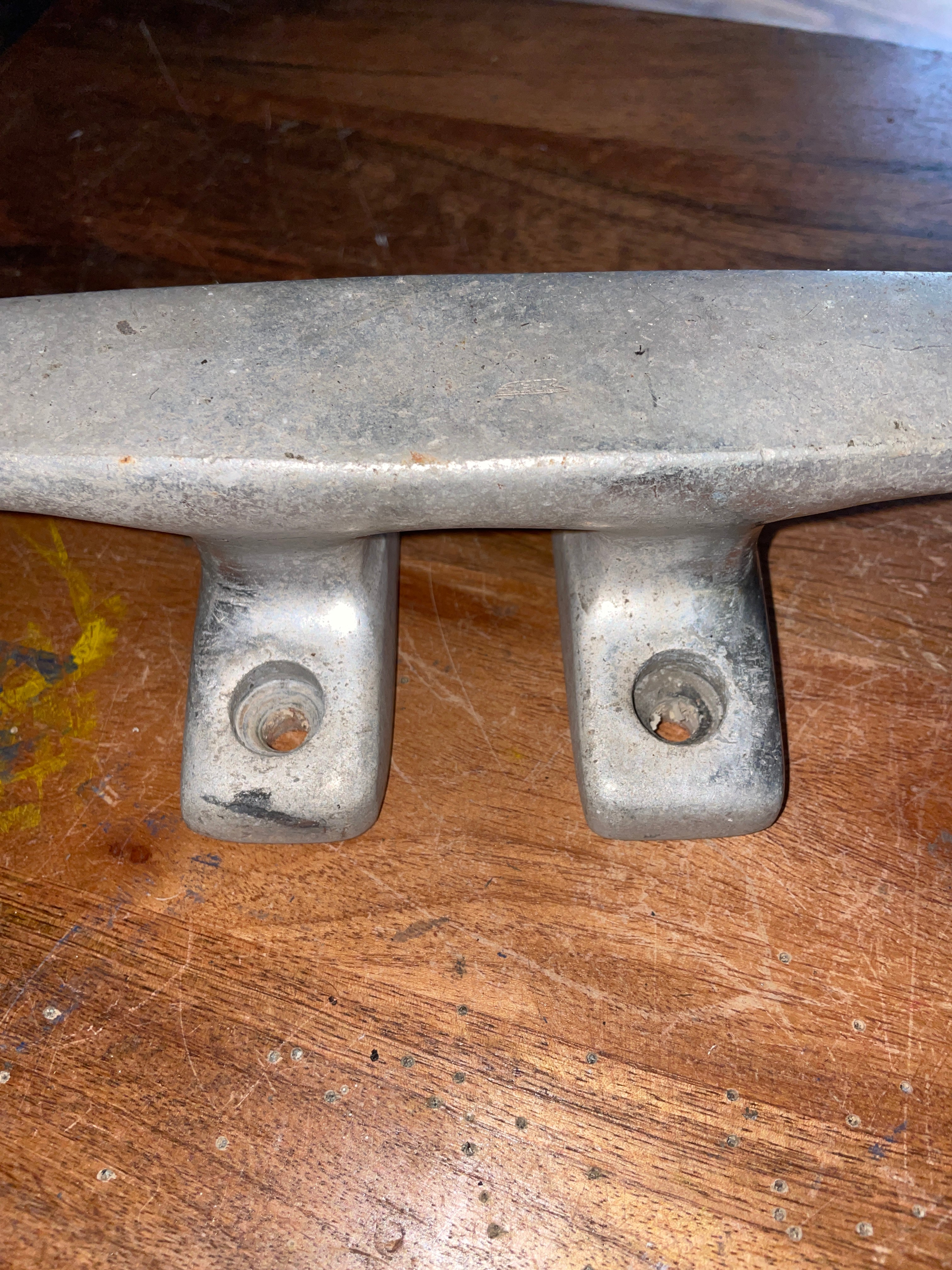 This heavy duty aluminum cleat is in good condition, has the usual scratching from years of use. This cleat is 10 1/4” total length. There are 2 feet, each foot has 2 bolt mounting. The feet measure 4 1/4” long x 1 1/2” wide. The 2 bolt install is 2 3/4” apart. This cleat stands 2 1/2” tall.