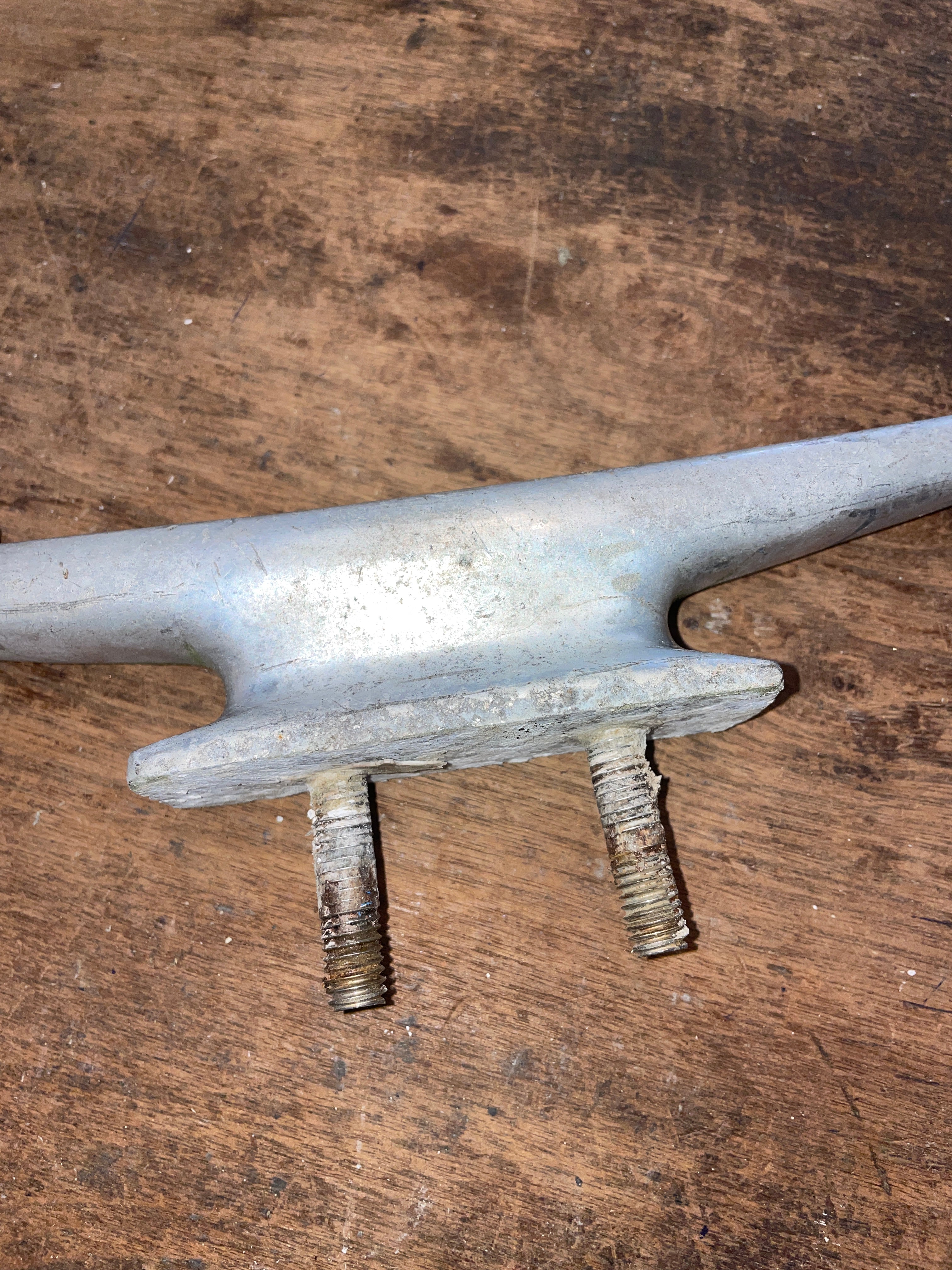 This 10” YS England aluminum cleat is in good condition. Usual surface scratches. 2 center through bolts are 1 3/4” apart. Has bolts but could be replaced with new. The base is 4” long x 1 1/2” wide. Stands 1 3/4” tall.