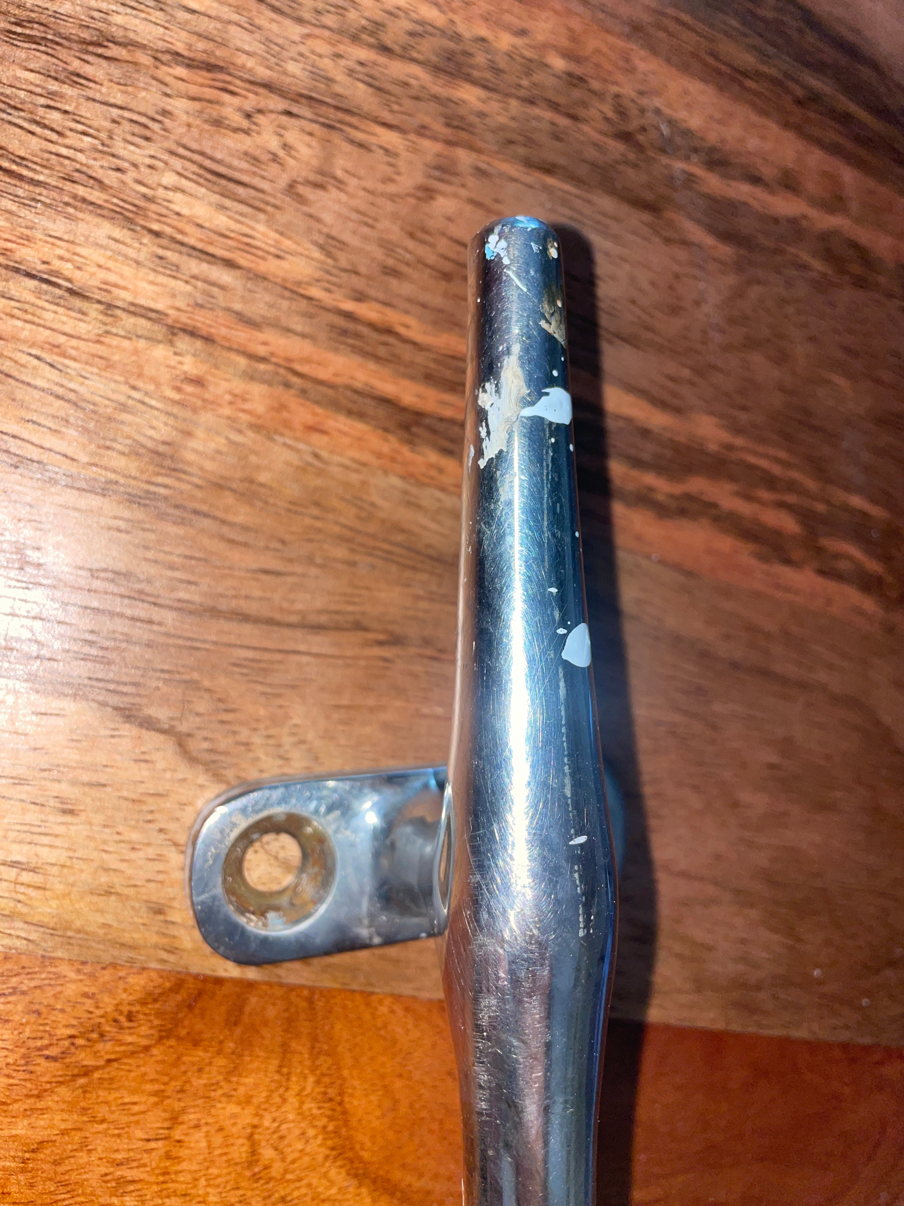 This stainless steel deck cleat is in great condition. It does have some scratching put would polish up good. It is 10” long with 2 feet. It is 4 screw install that is 1 3/4” apart side x side. Stands 2” at the tallest point. Width between base is 3 1/8”.