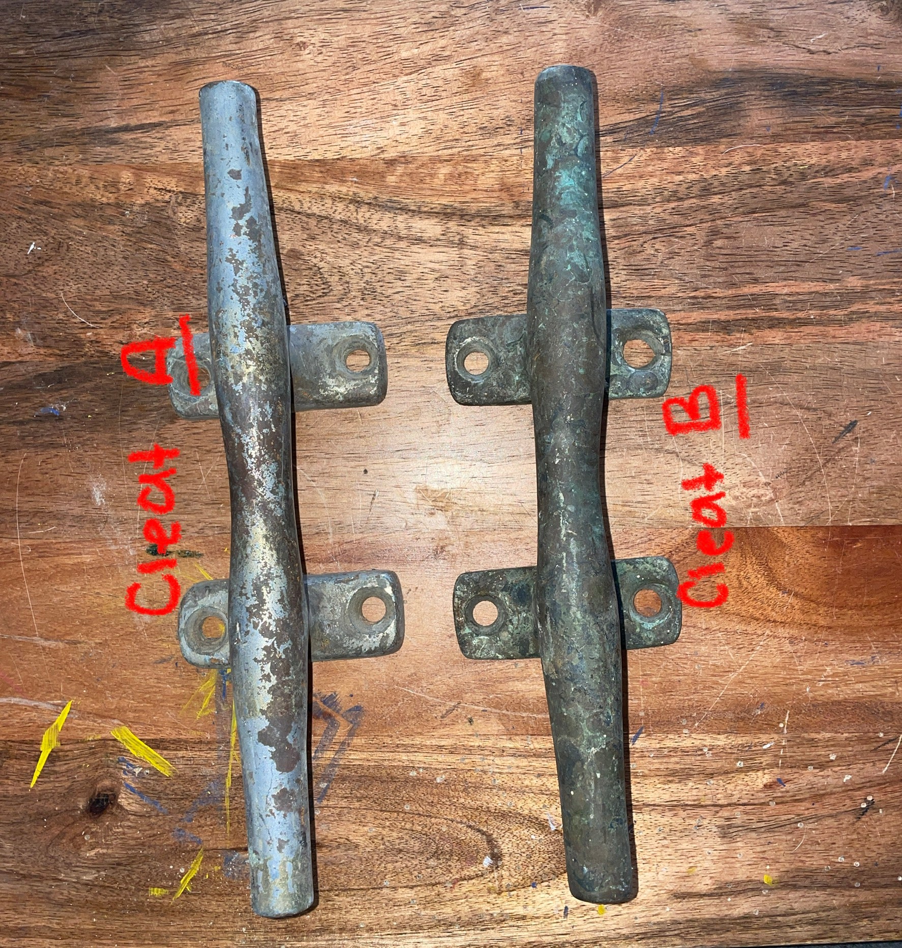 2 options available for this cleat. They are the same length and size. Slightly different in weight and base. This chromed bronze cleat is in good condition. Has usual wear and tear from years of use. The cleat is 11 1/2” total length. Second photo shows both of the cleats and they are labeled.