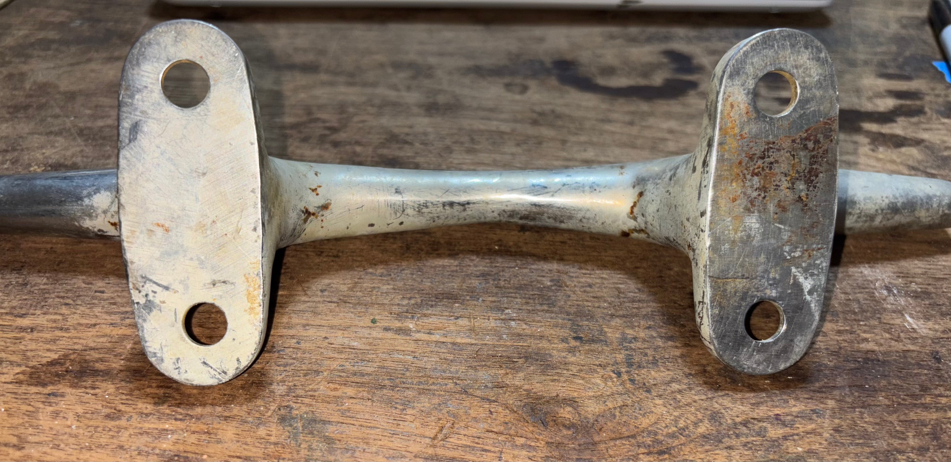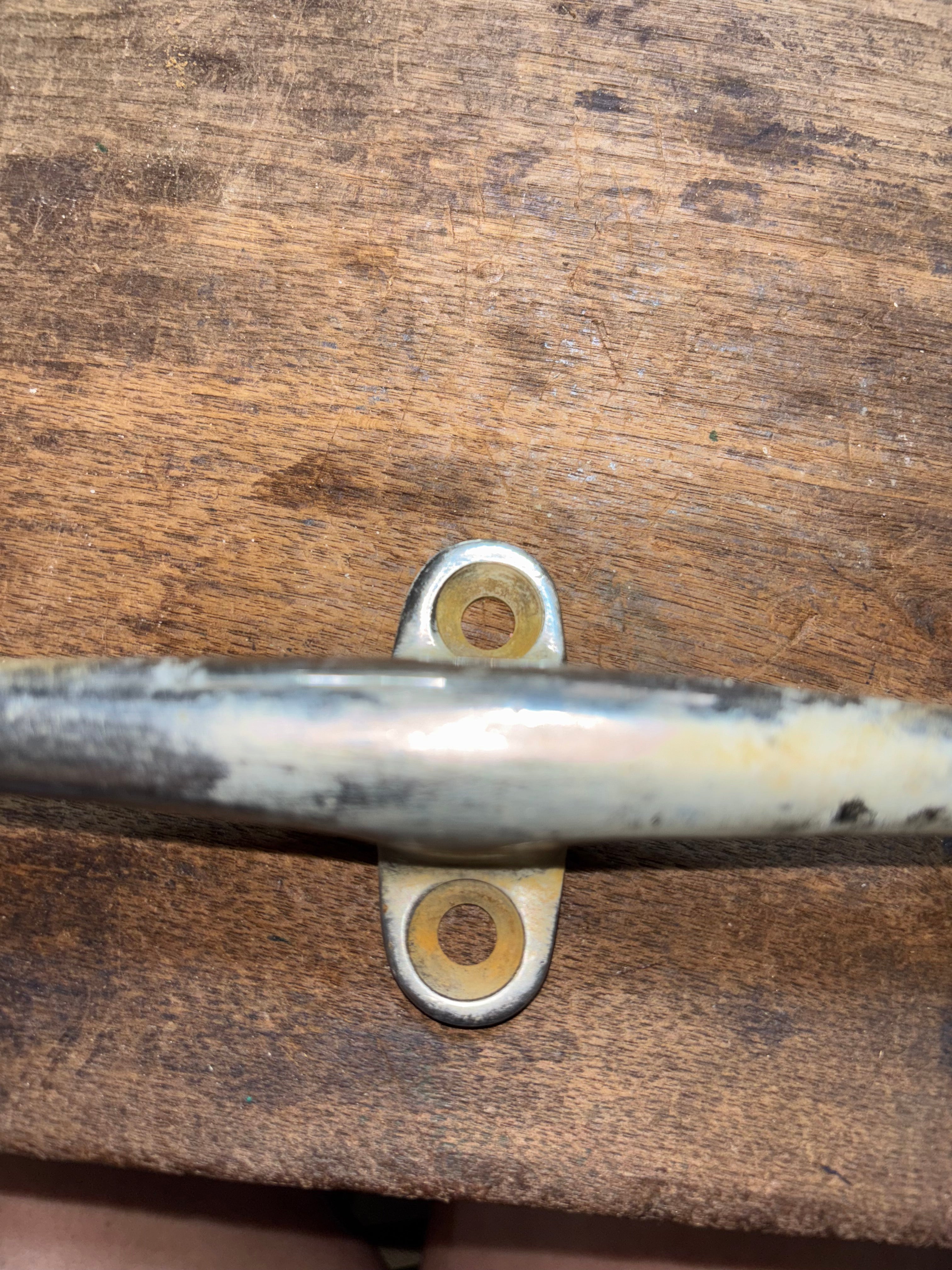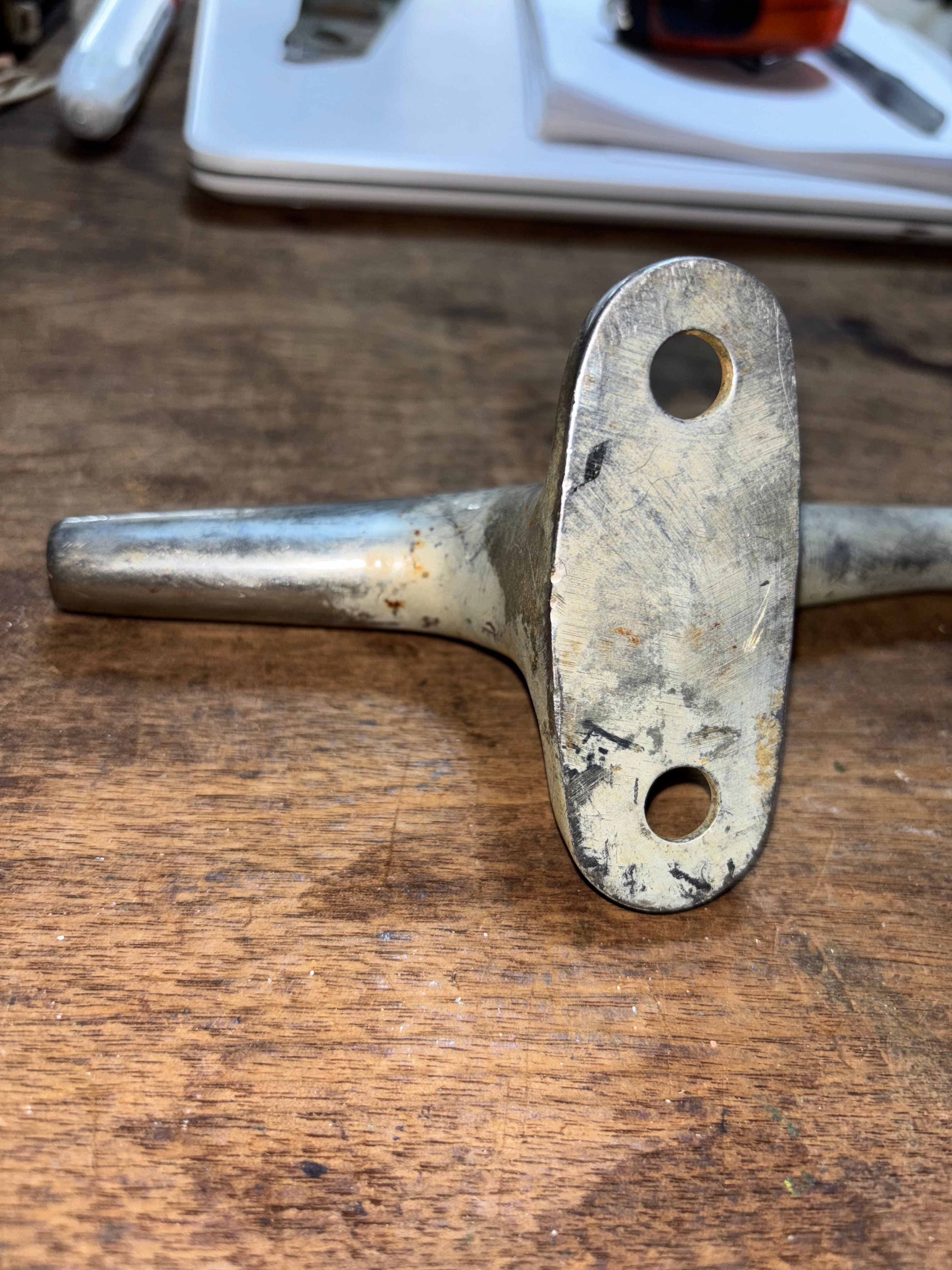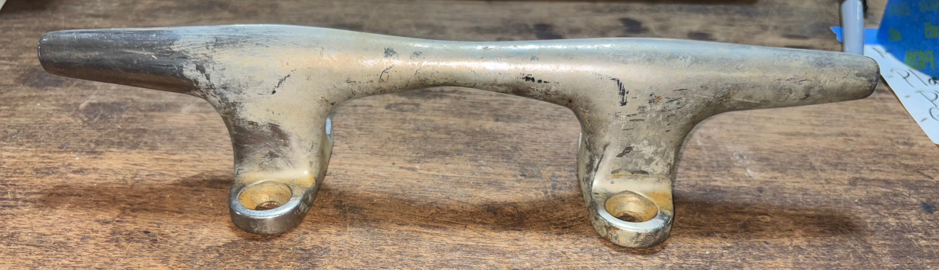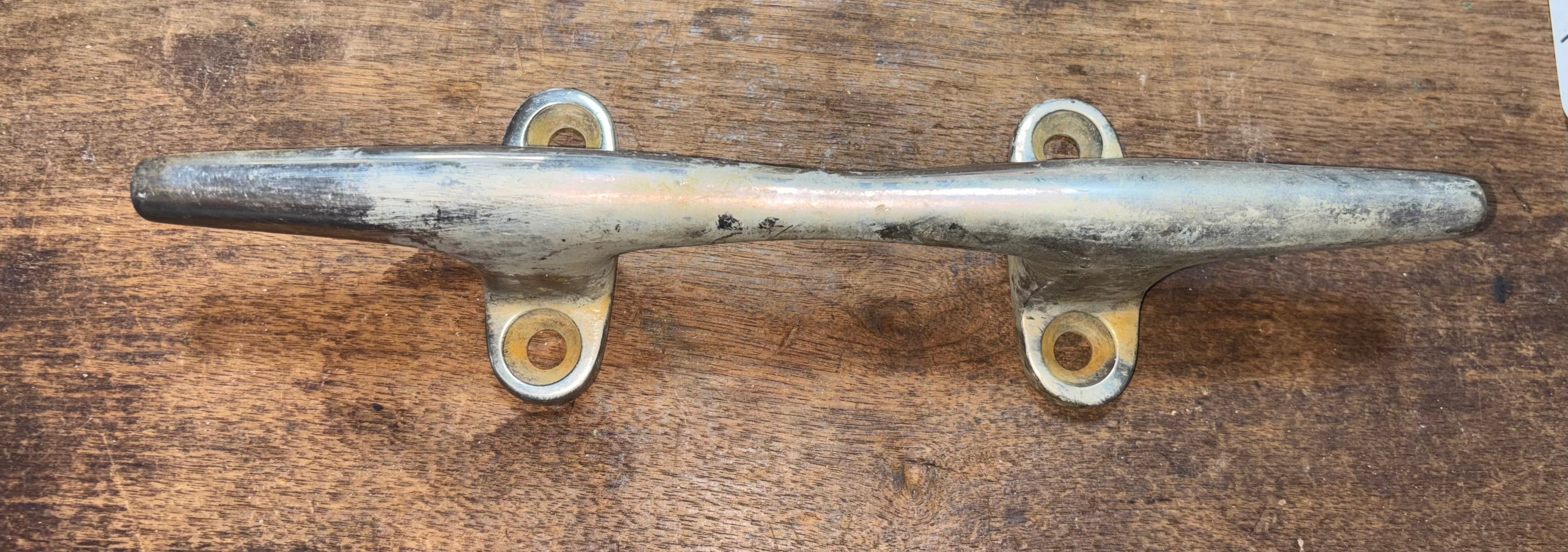 This chromed bronze cleat is in great condition. It is 12” total length. The chroming is coming off in some places. The cleat has 2 feet mounting with 4 screw install. The mounting is 5 1/4” long x 2 1/8” wide. This cleat stands 2 1/4” tall.