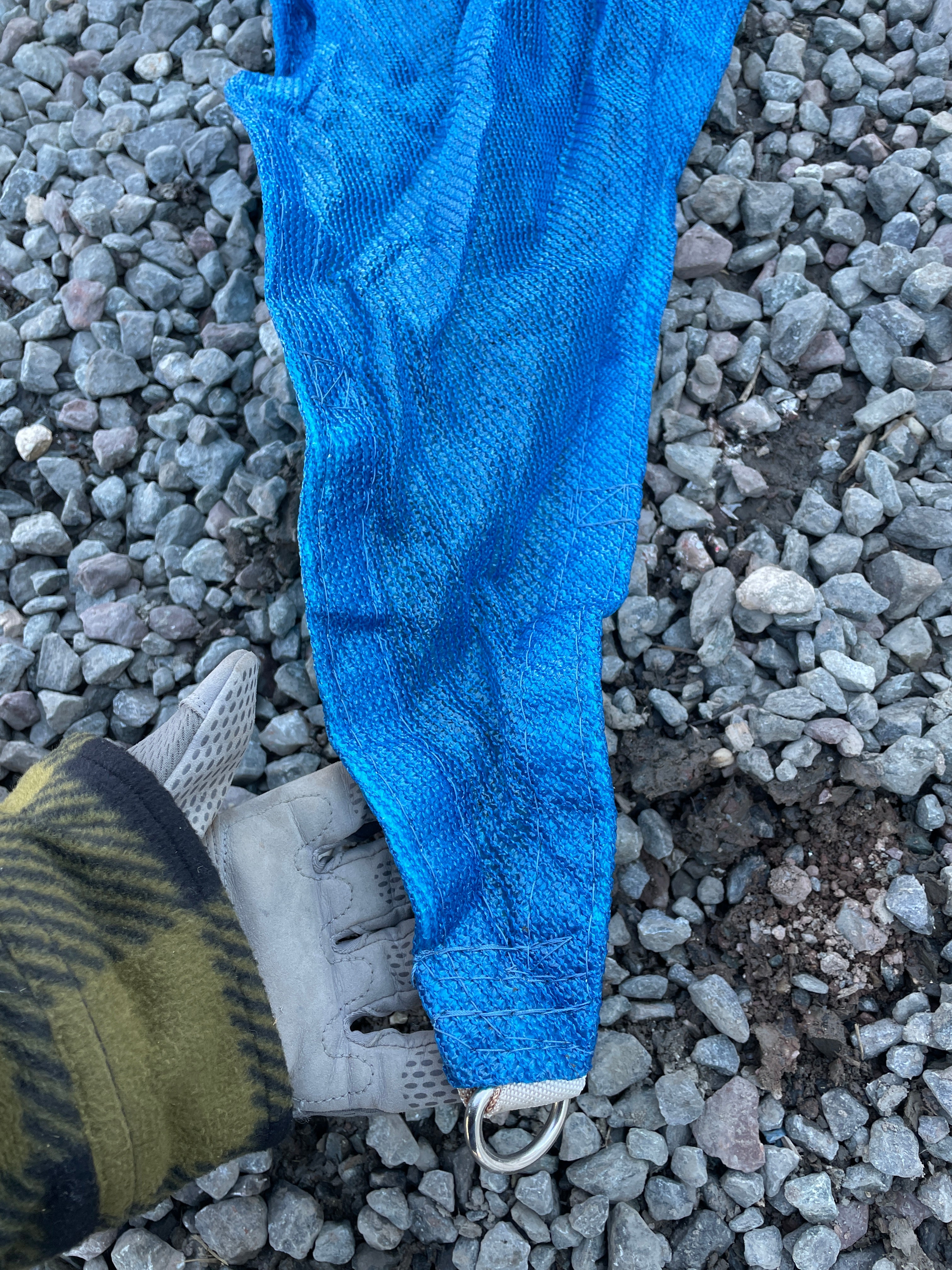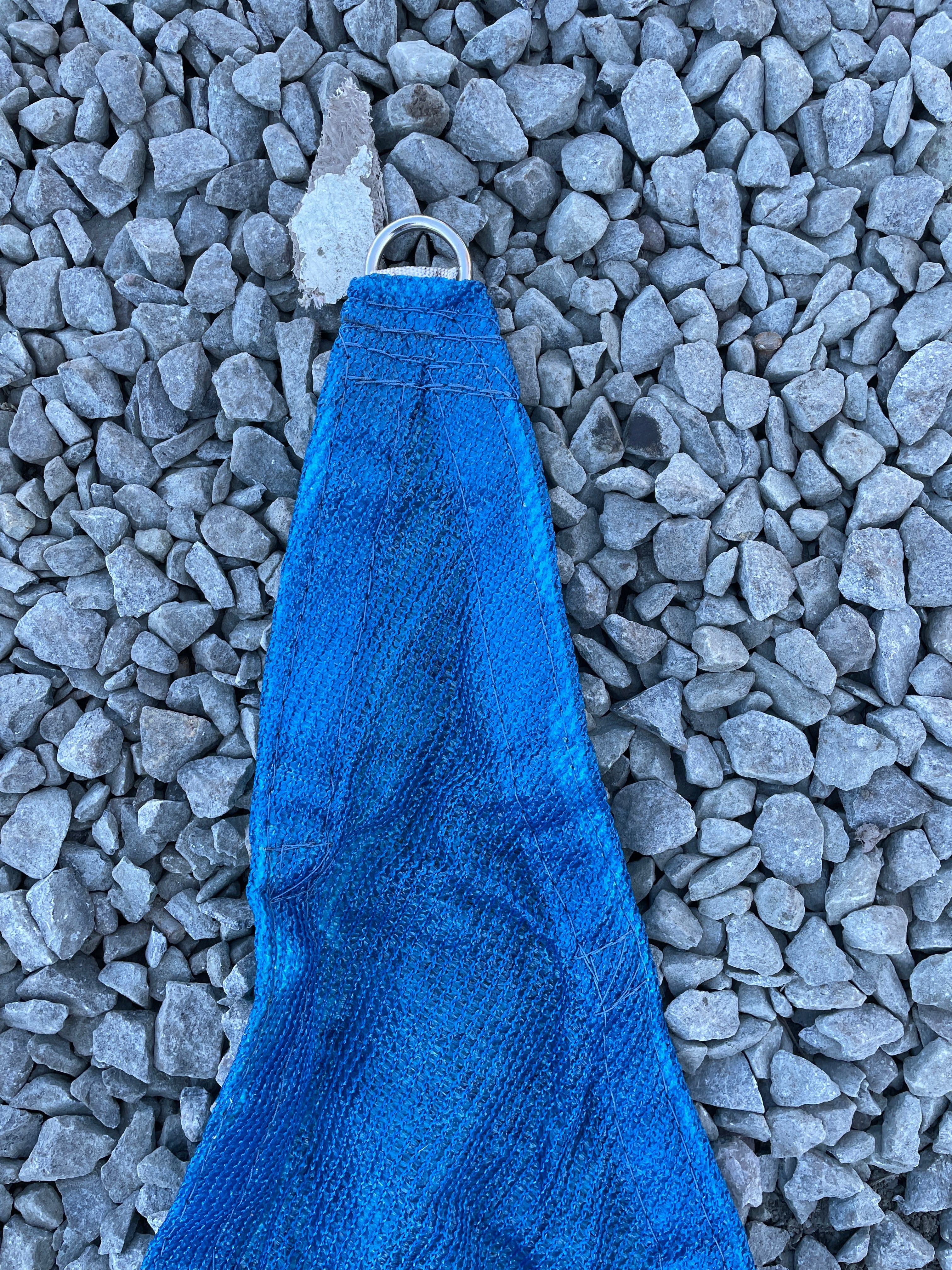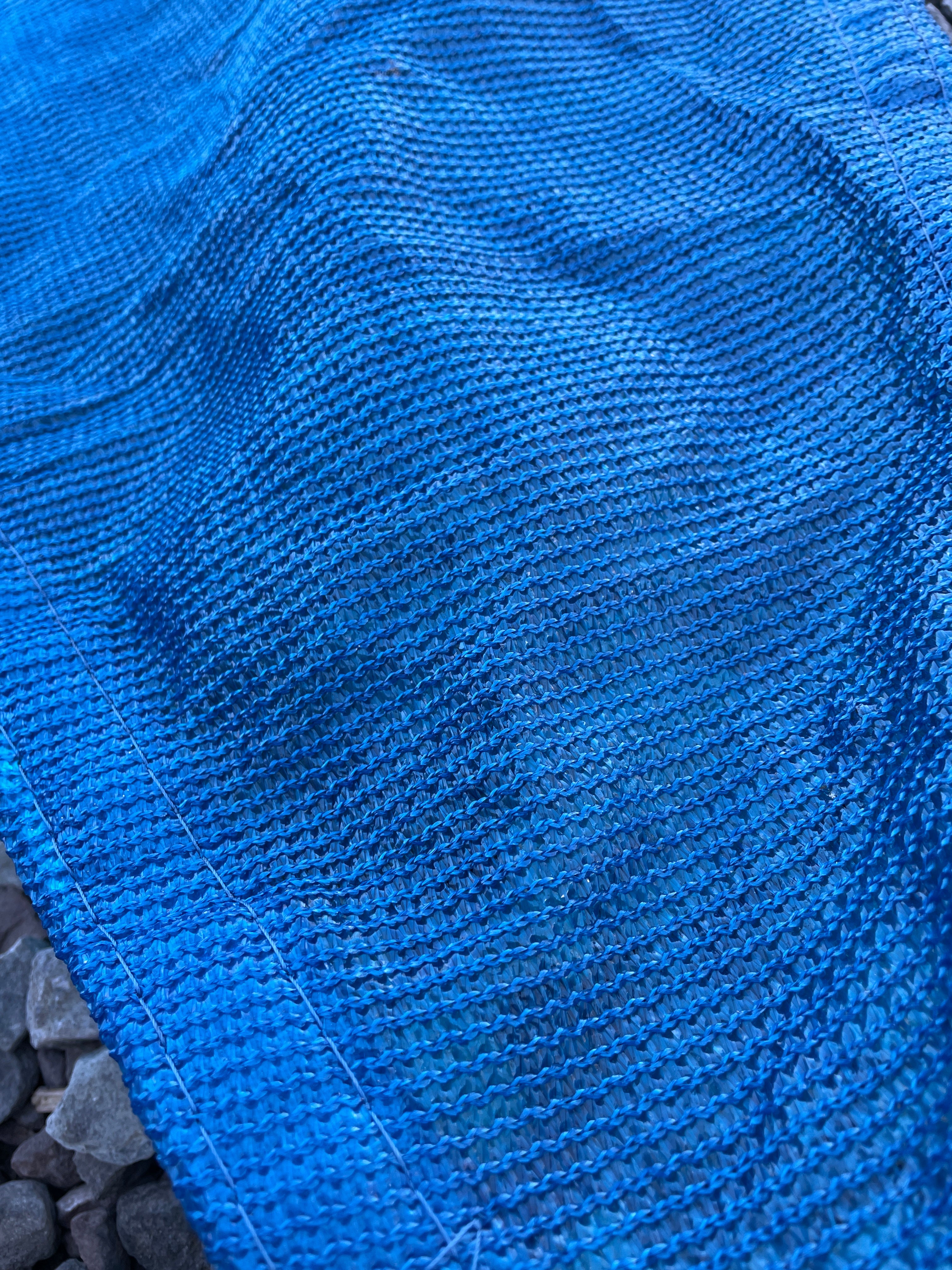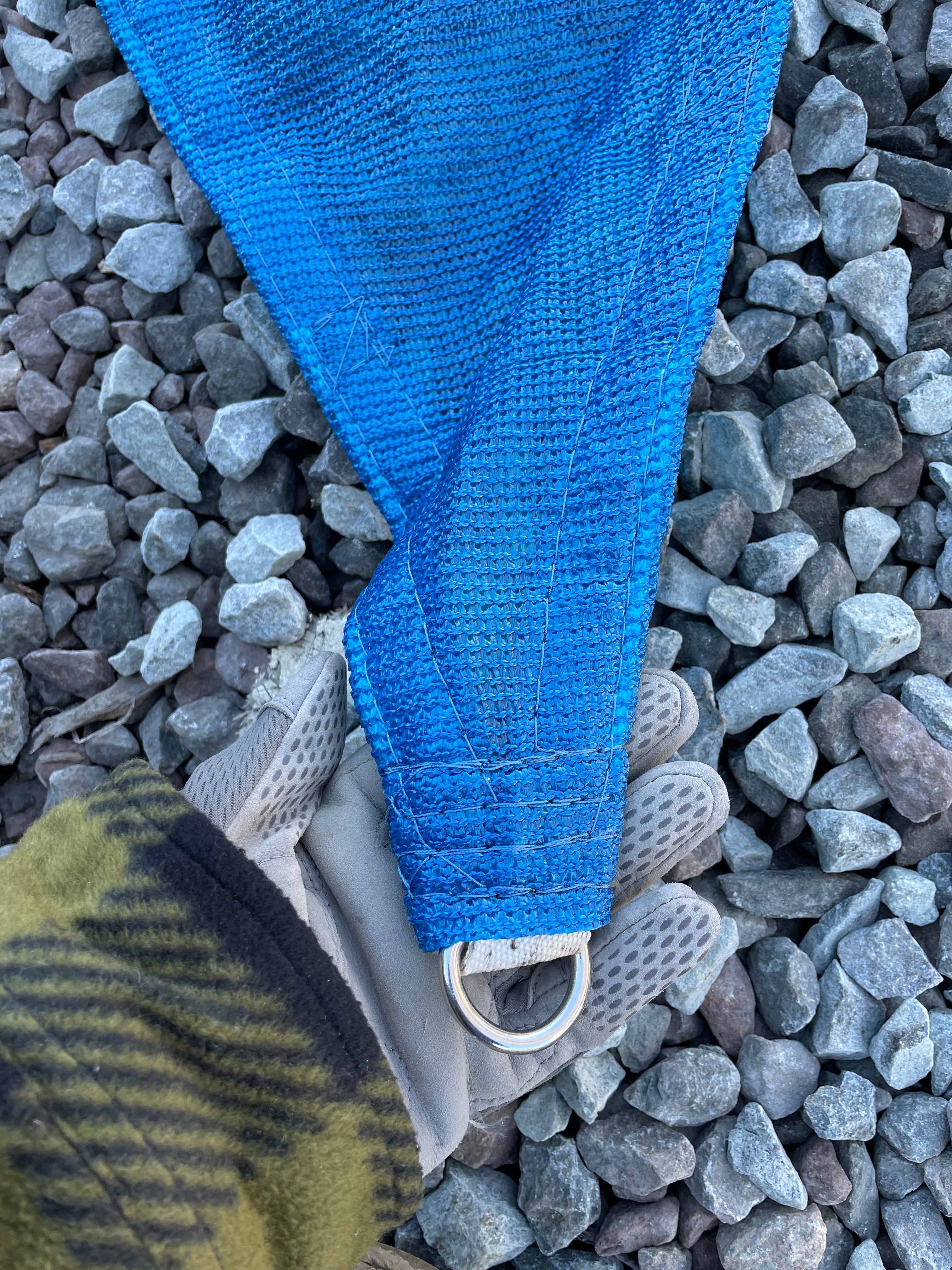 This sun shade is made out of a tarp like material. It is not solid water will go through it but is great at blocking the sun. All 3 sides are 12’ in length. Stainless steel hardware.