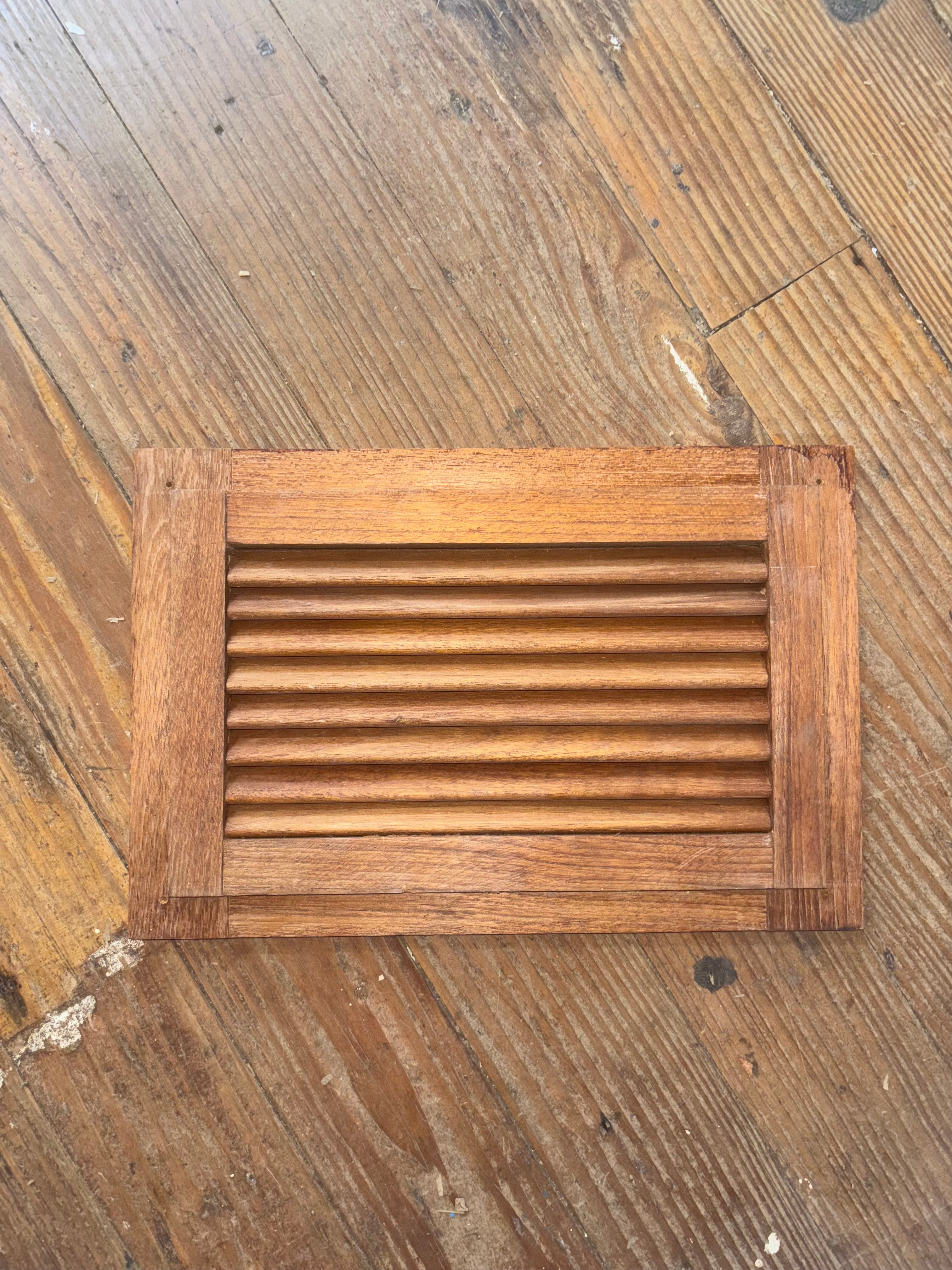 This teak louvered vent is in good condition. The outside diameter measures 12" x 8" and the interior diameter measures 10 1/2" x 6 1/2".