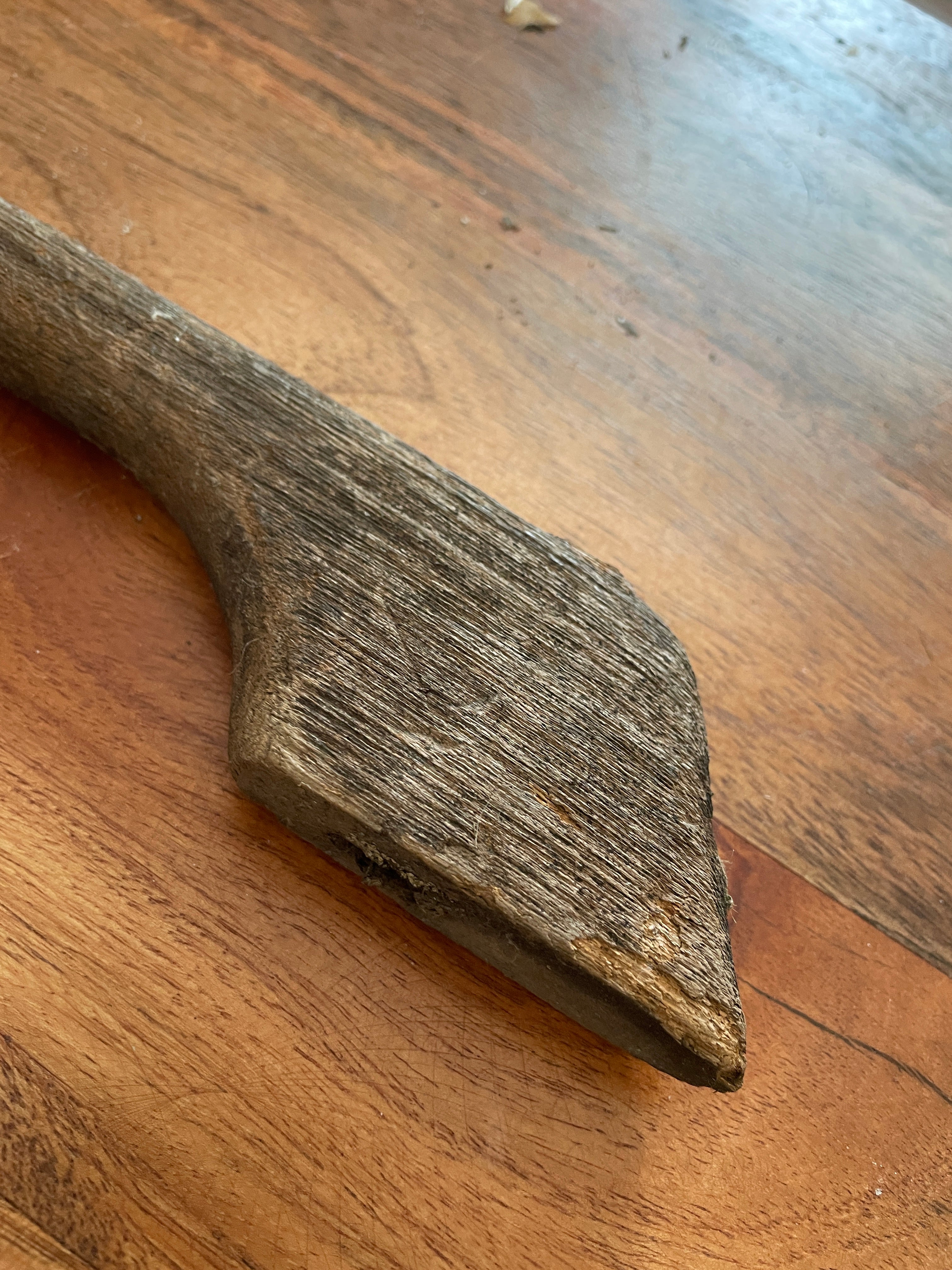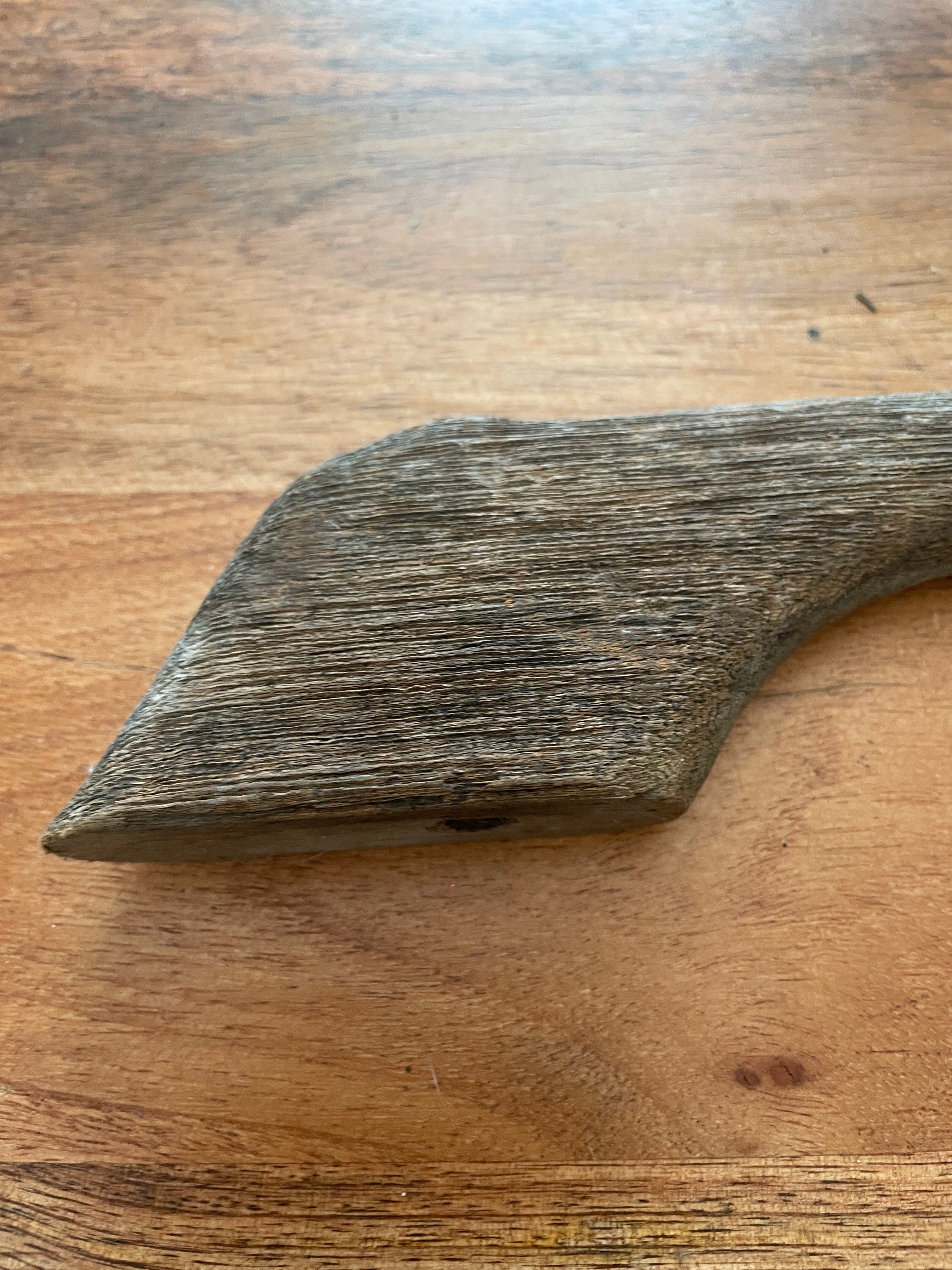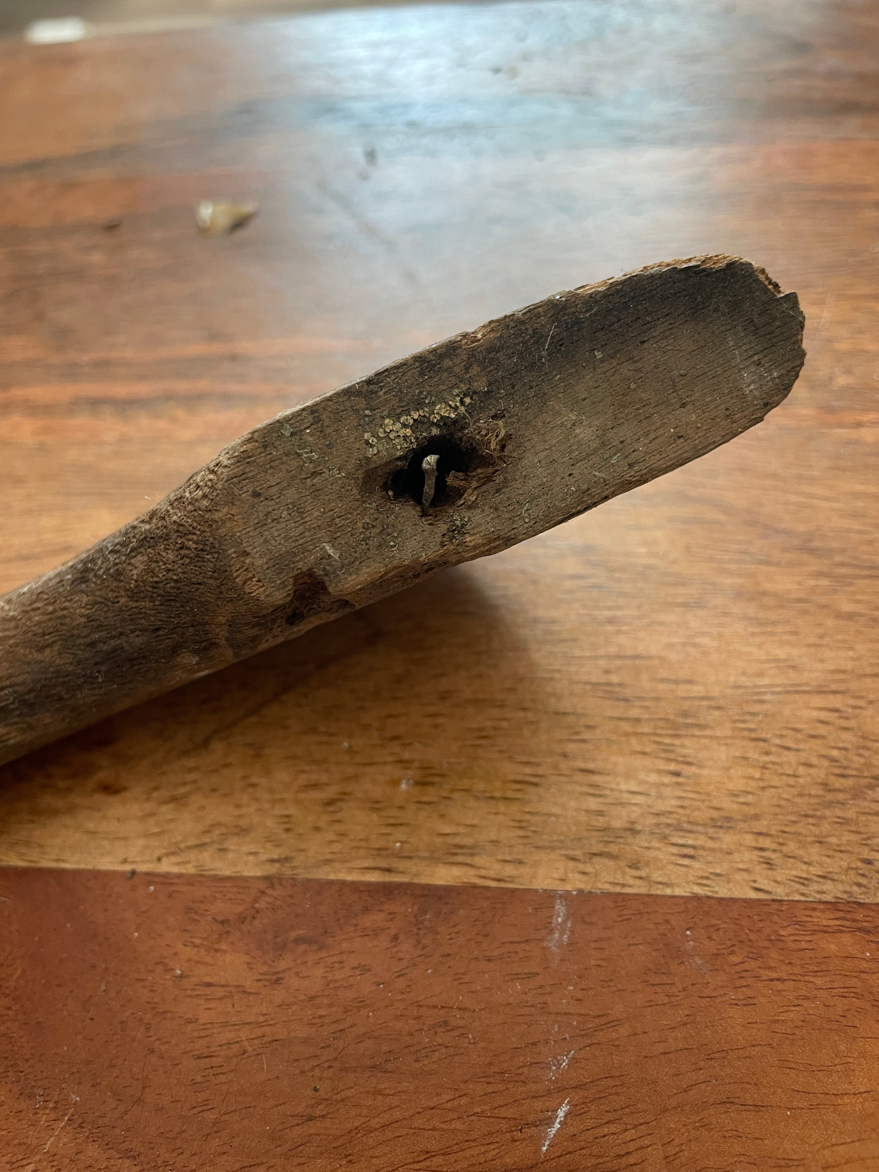 This teak grab rail does have some cosmetic issues in the wood, small chips missing here and there. Would make for a quick replacement. If sanded and refinished could hold up for a while! It is 15 1/4” total length. Has 2 through bolts that are 11 1/2” apart.