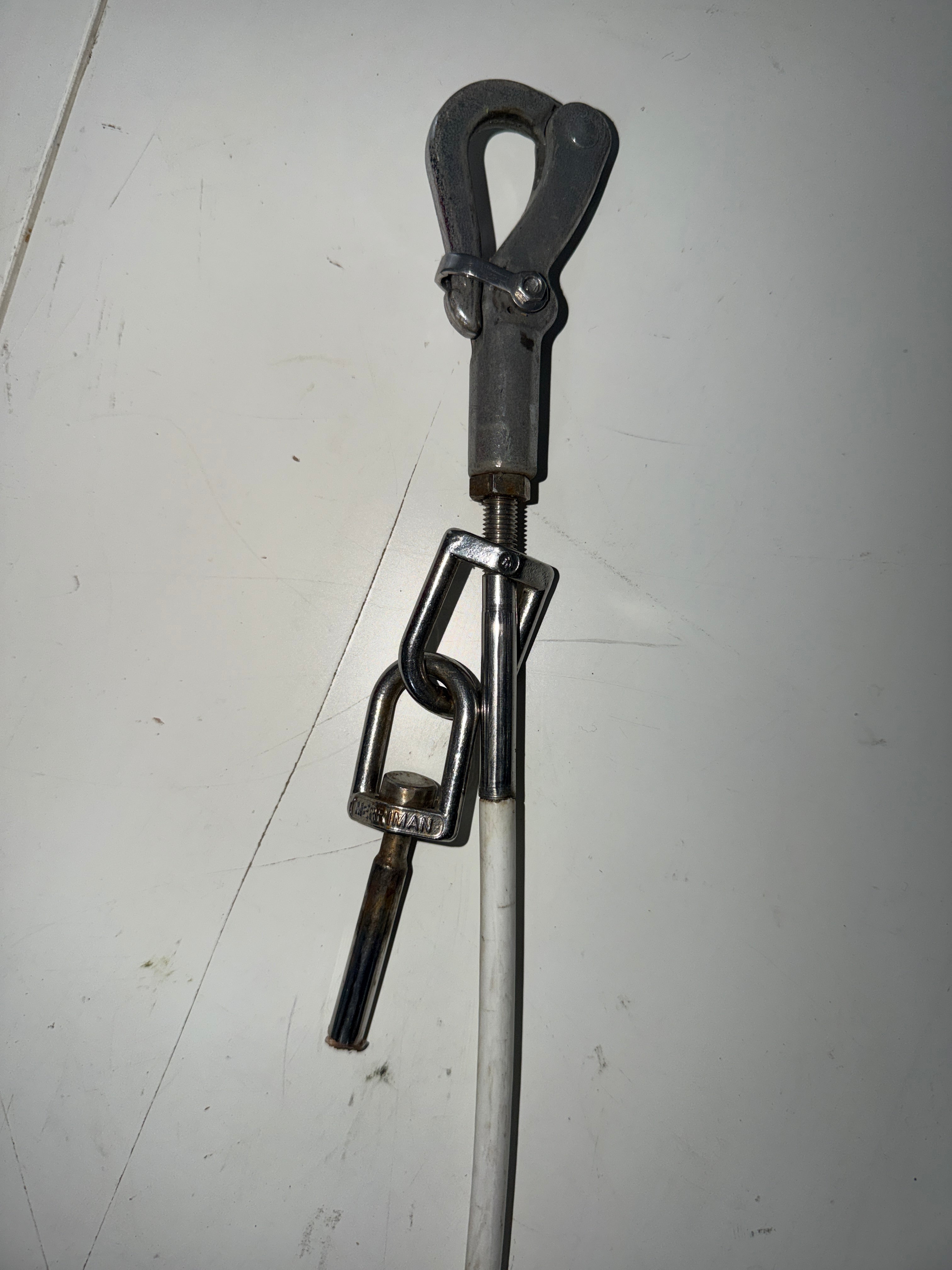 This is a 19 7/8" total length lifeline gate. Comes with a chromed bronze merriman pelican hook. The other end has a 1/2" diameter circle fitting.