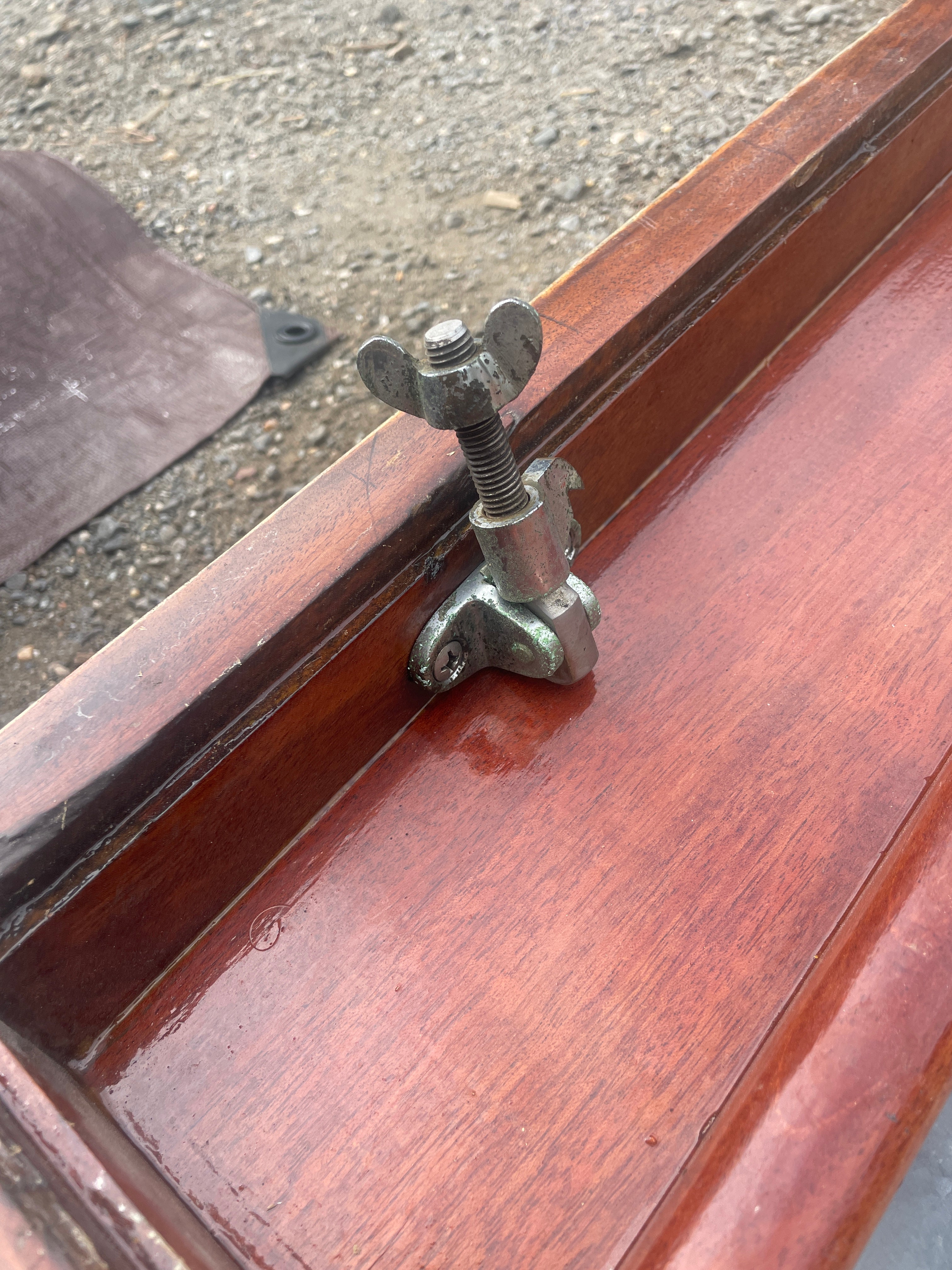 This large mahogany curved hatch was removed off a 1934 Eisenhower 50' boat. This hatch is in great condition, yes the outside is dirty however the interior part is in great condition so it will overall clean up great! This hatch overall measures 34 1/2" long x 35 1/2" wide. It has 2 - 6 1/4" bronze cleats on each side. Will come with the half set of hinges on all corners - WE DO HAVE SOME OF THE OTHER SIDE WE WILL INCLUDE BUT DO NOT EXPECT THEM TO BE COMPLETE. The plexiglass windows are 30 1/4" long x 5 1/2" wide.