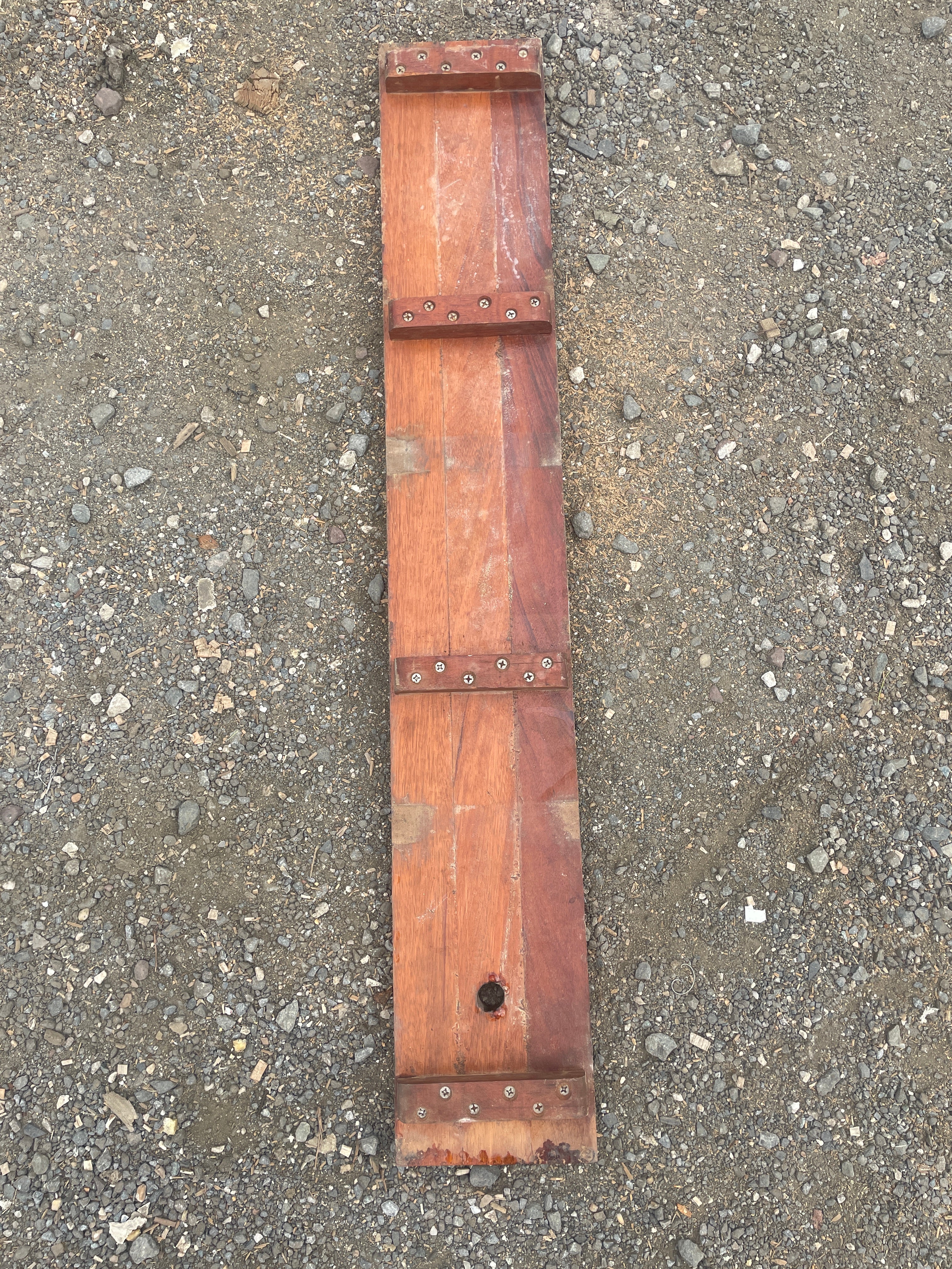 1934 Eisenhower 50' Mahogany floor board is in great condition. Very dirty but would clean up no problem. Very minimal scratching to the surface. This piece of teak measures 47 1/8" long x 7 1/2" wide x 1" thick (it is 2" thick if you count the added back boards).