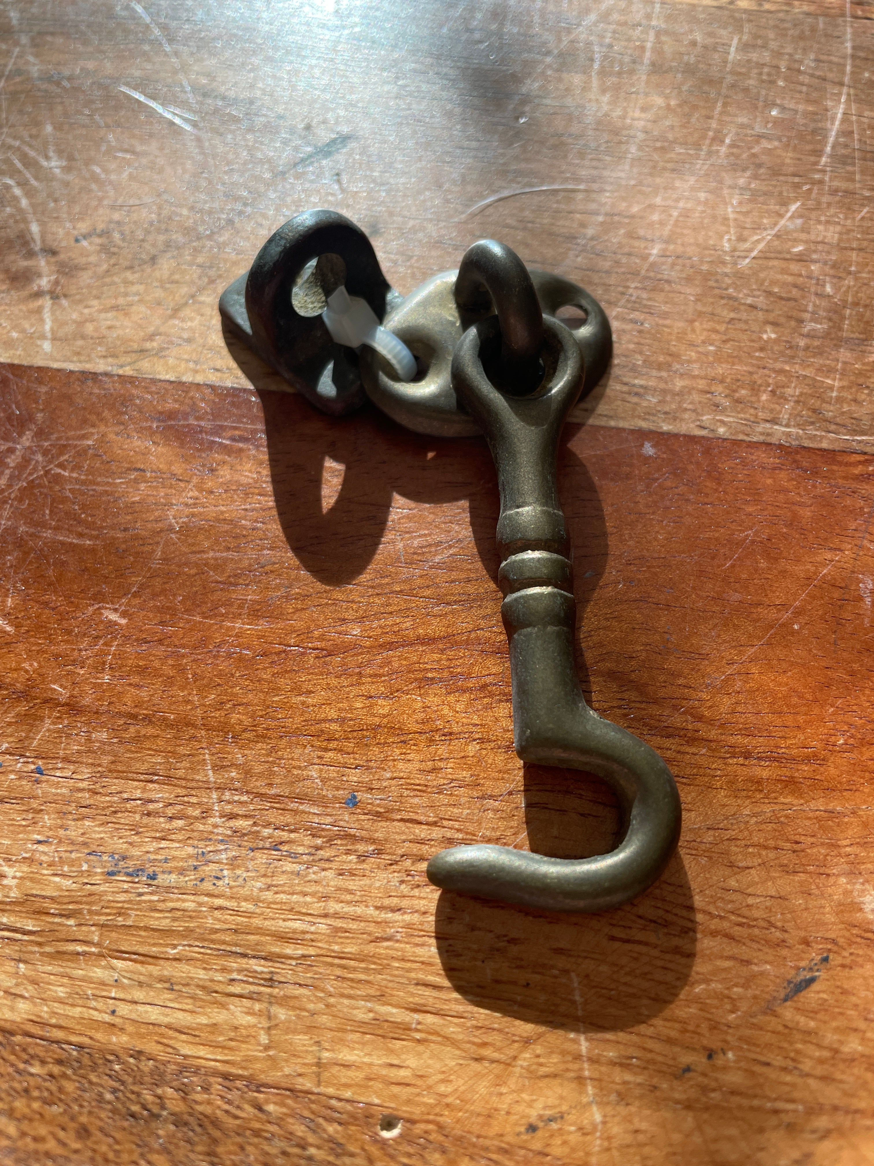 This brass door hook is in great condition. It is 2 3/4” total length. Comes with the locking hardware.
