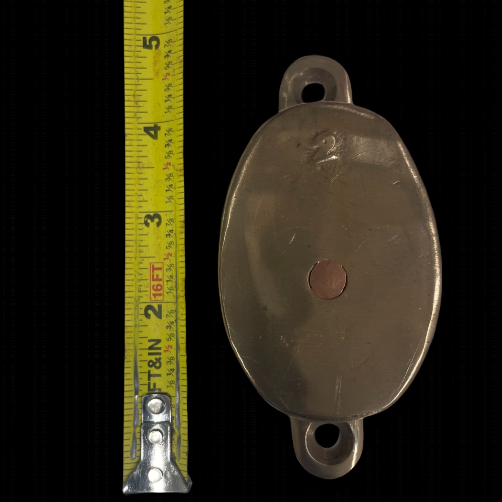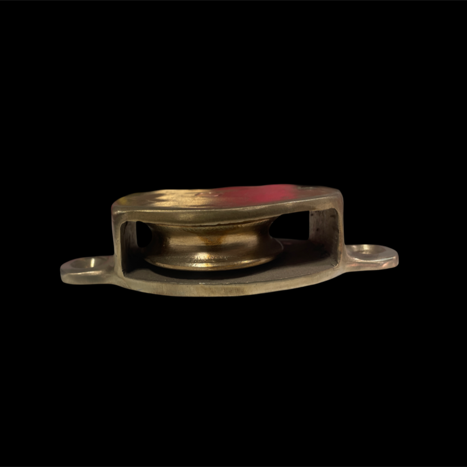 #2 Bristol Bronze Single Cheek Block. 2" sheave. Can take max 3/8" line. The base is 4 3/8" long x 1 1/8" tall. The sheave sits more towards the back, it is not centered (it is made to be like that).