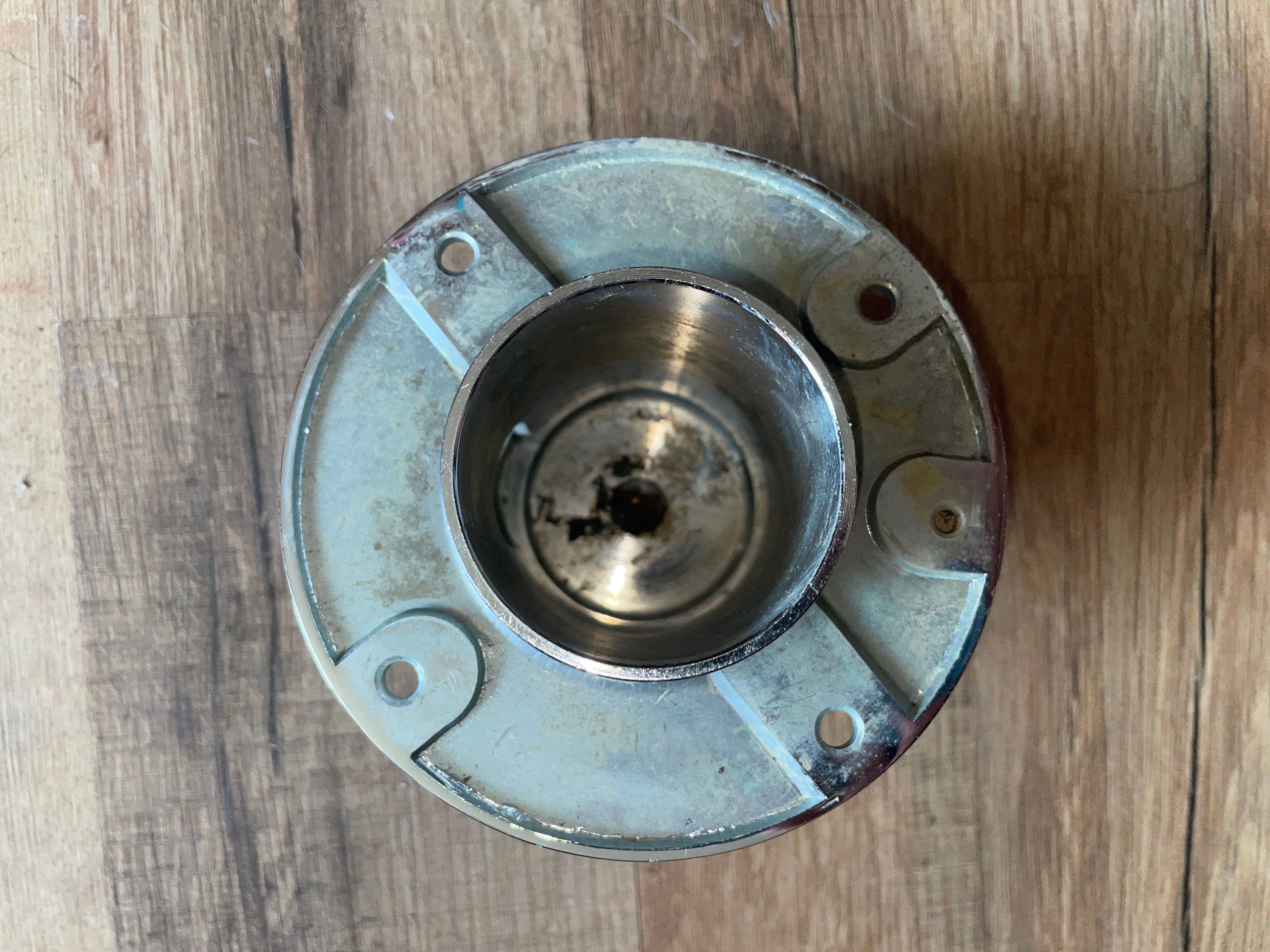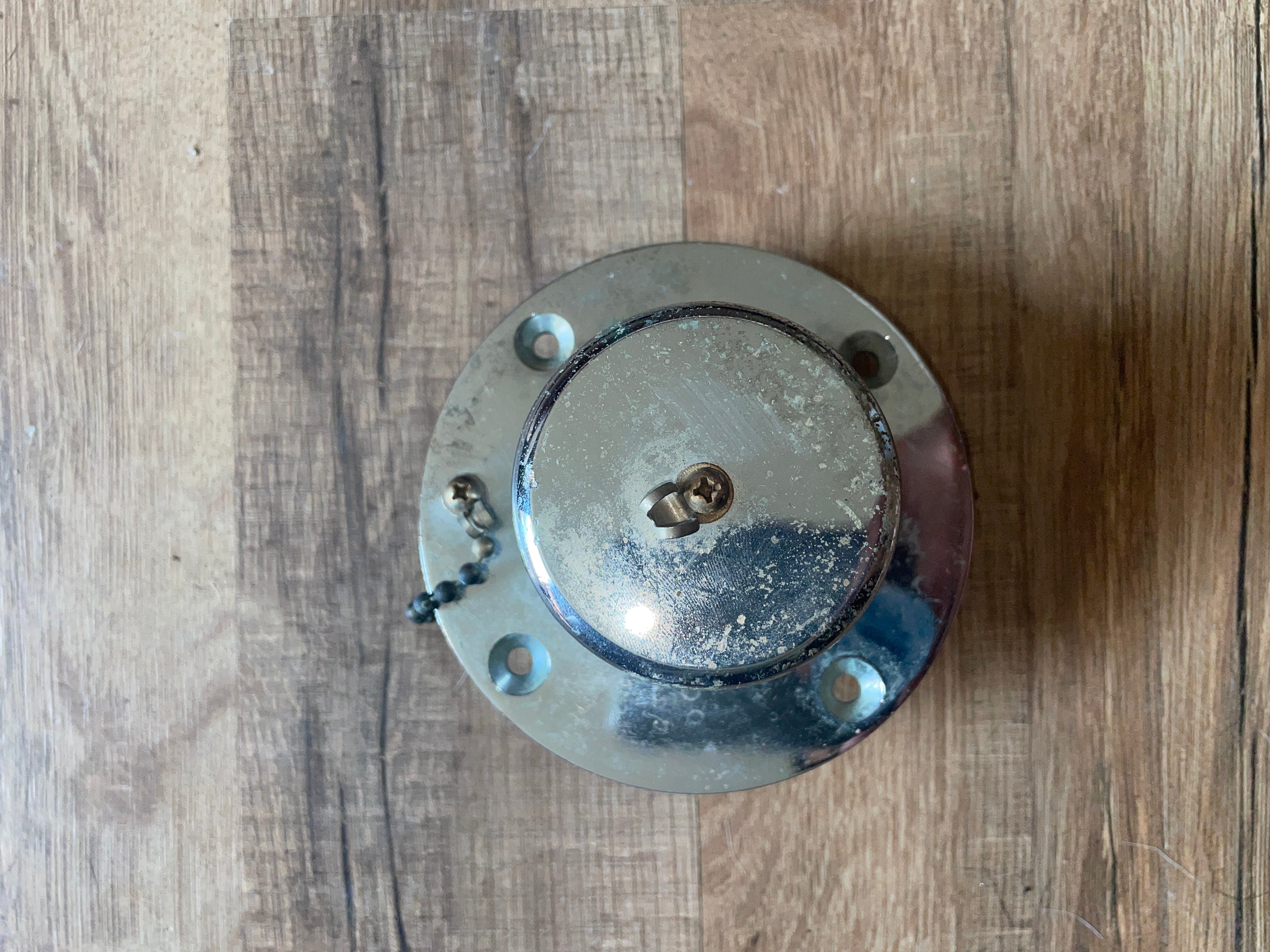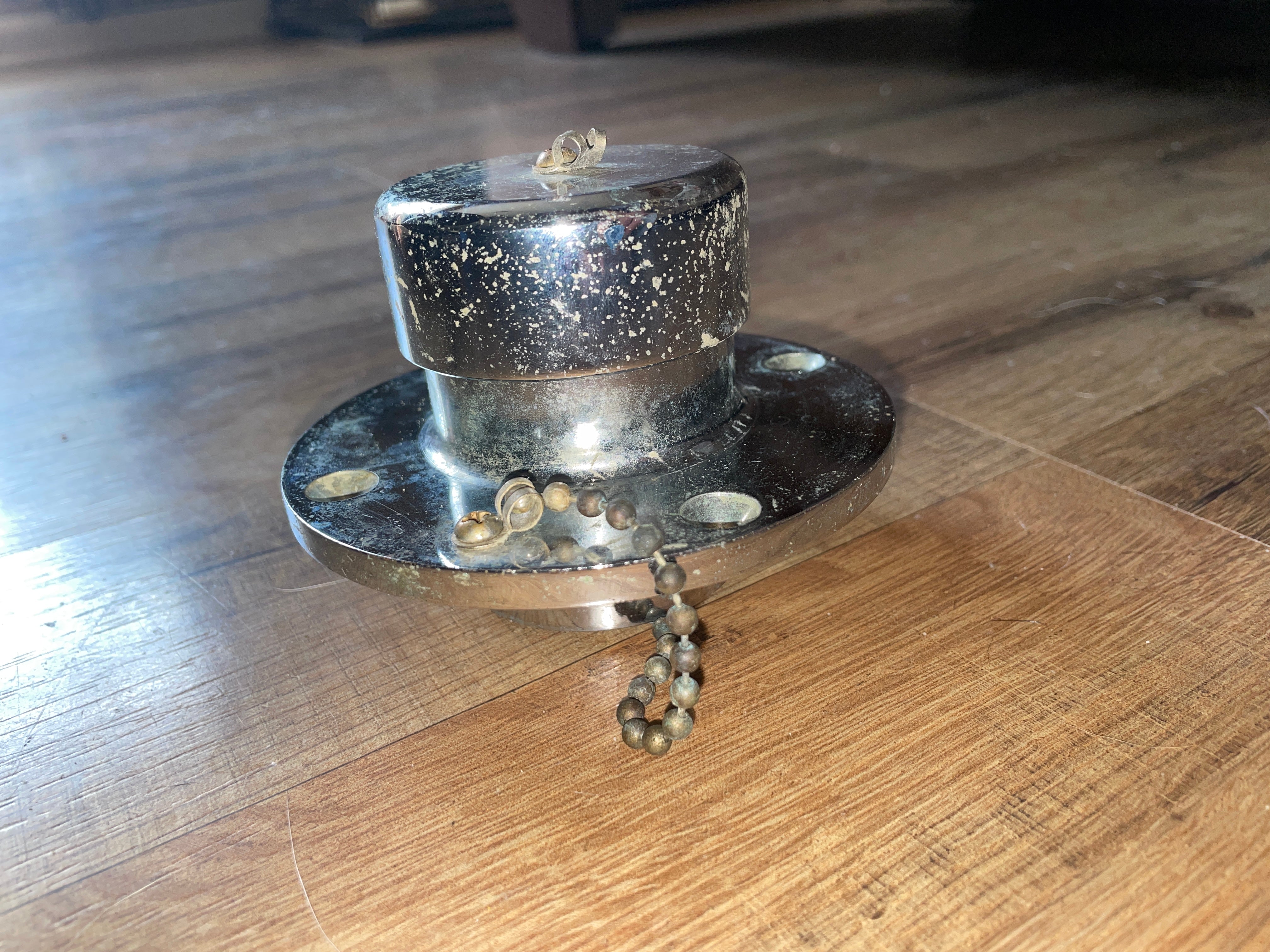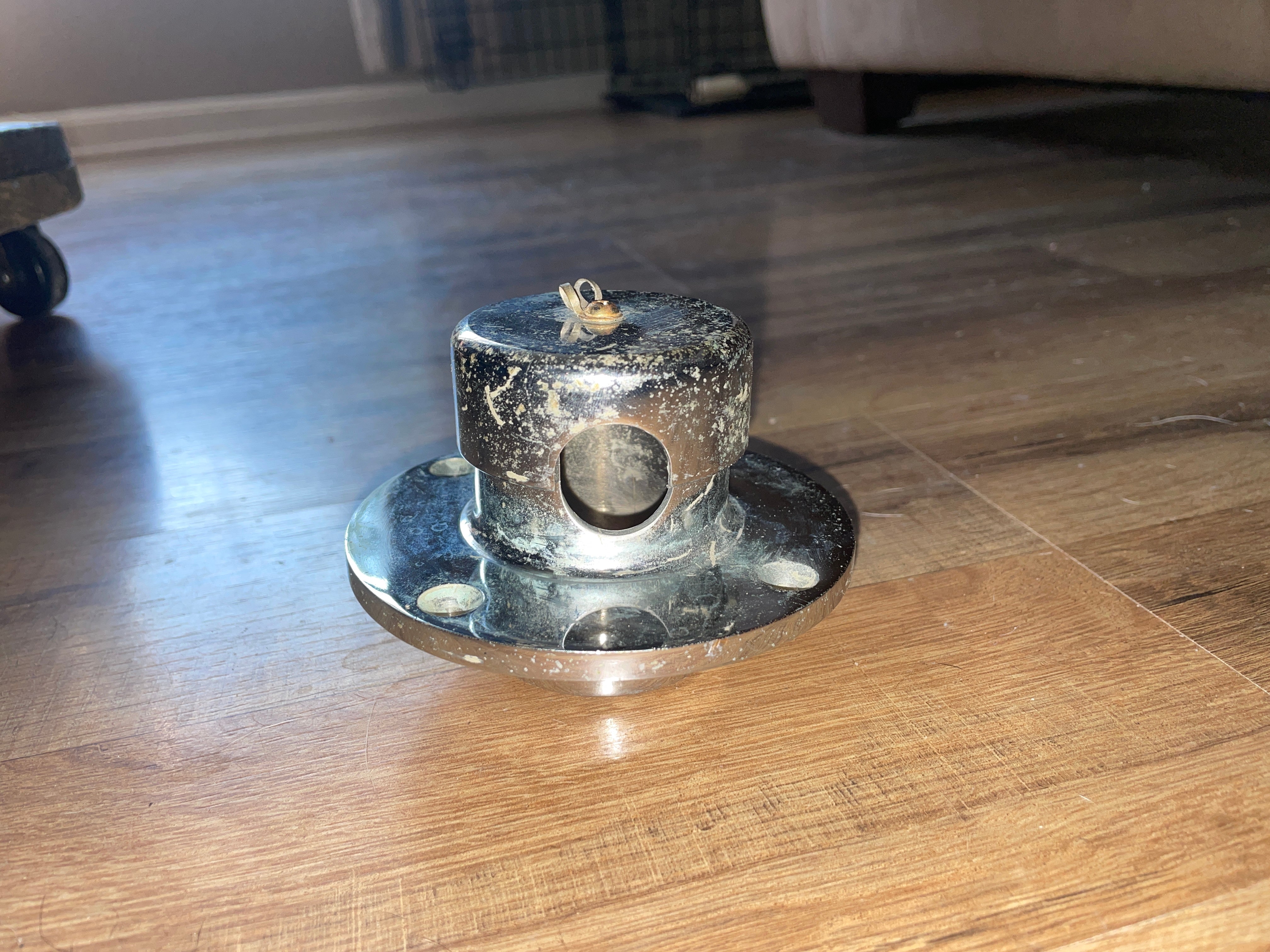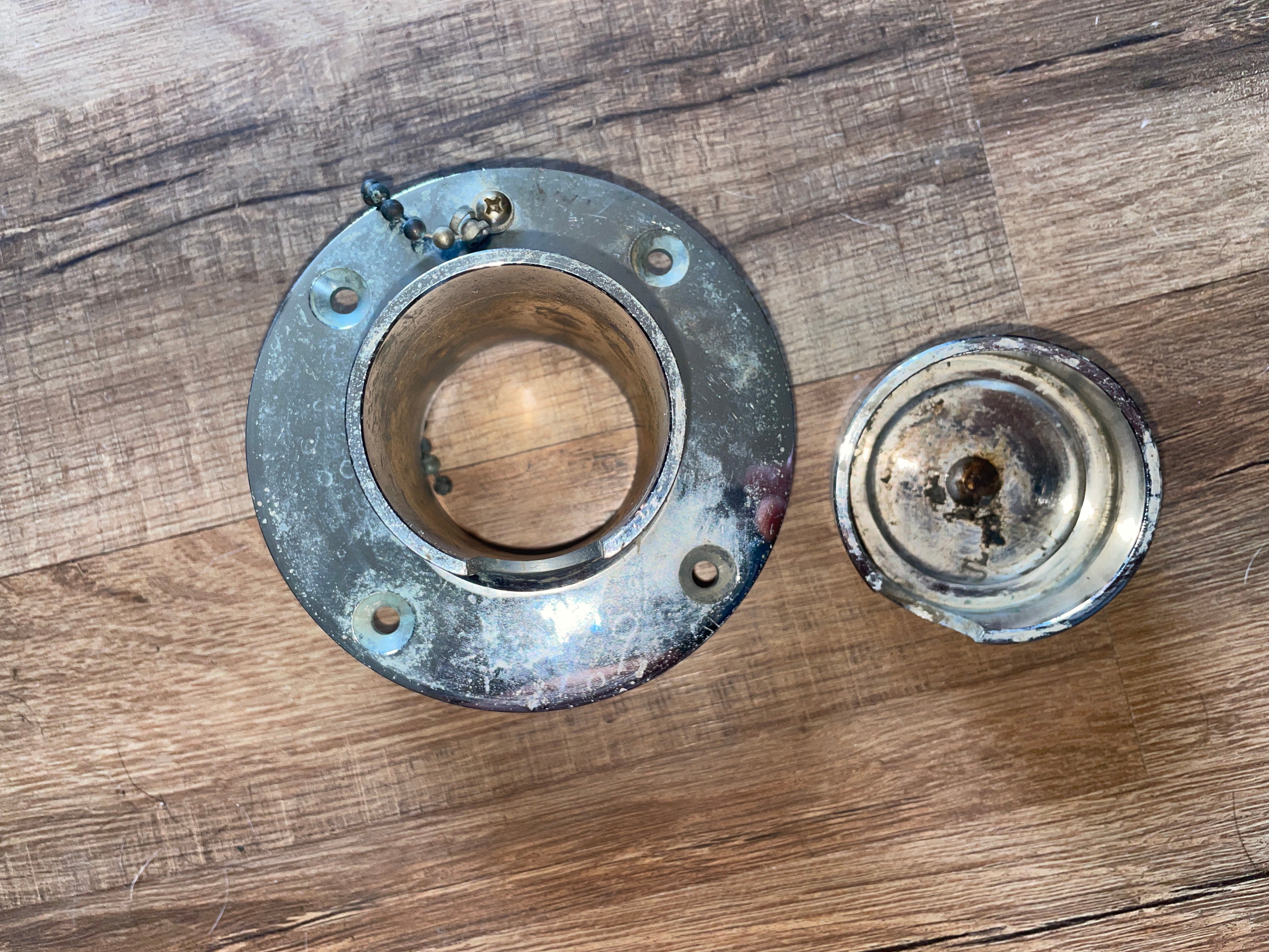 This chromed bronze anchor Hawse is in great condition. The base is 2” diameter. The overall base for install is 4” with 4 screw install that is 2 3/8” apart. The opening for line/chain is 1 3/4” wide x 1” long. Only damage is that the chain holding the top to the base has come off so that will need to be put back on. Stands 1 7/8” tall.