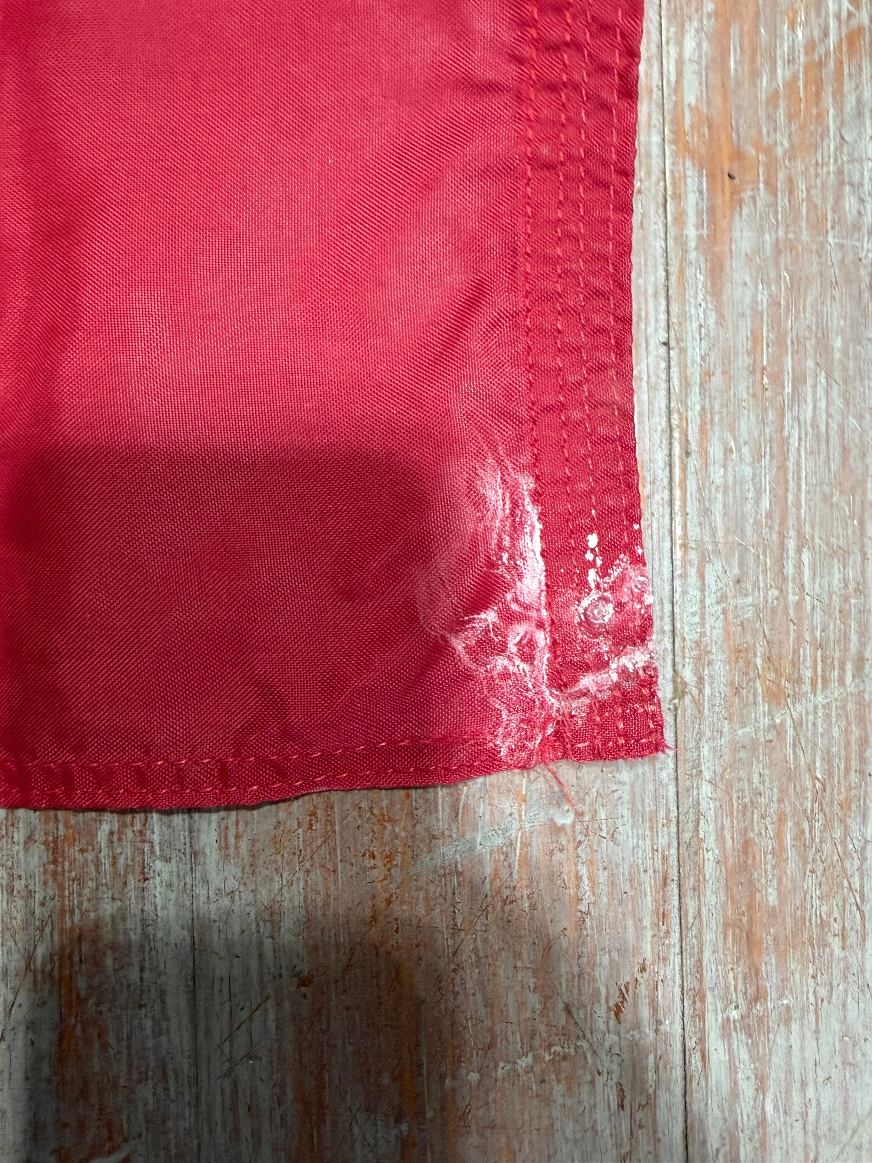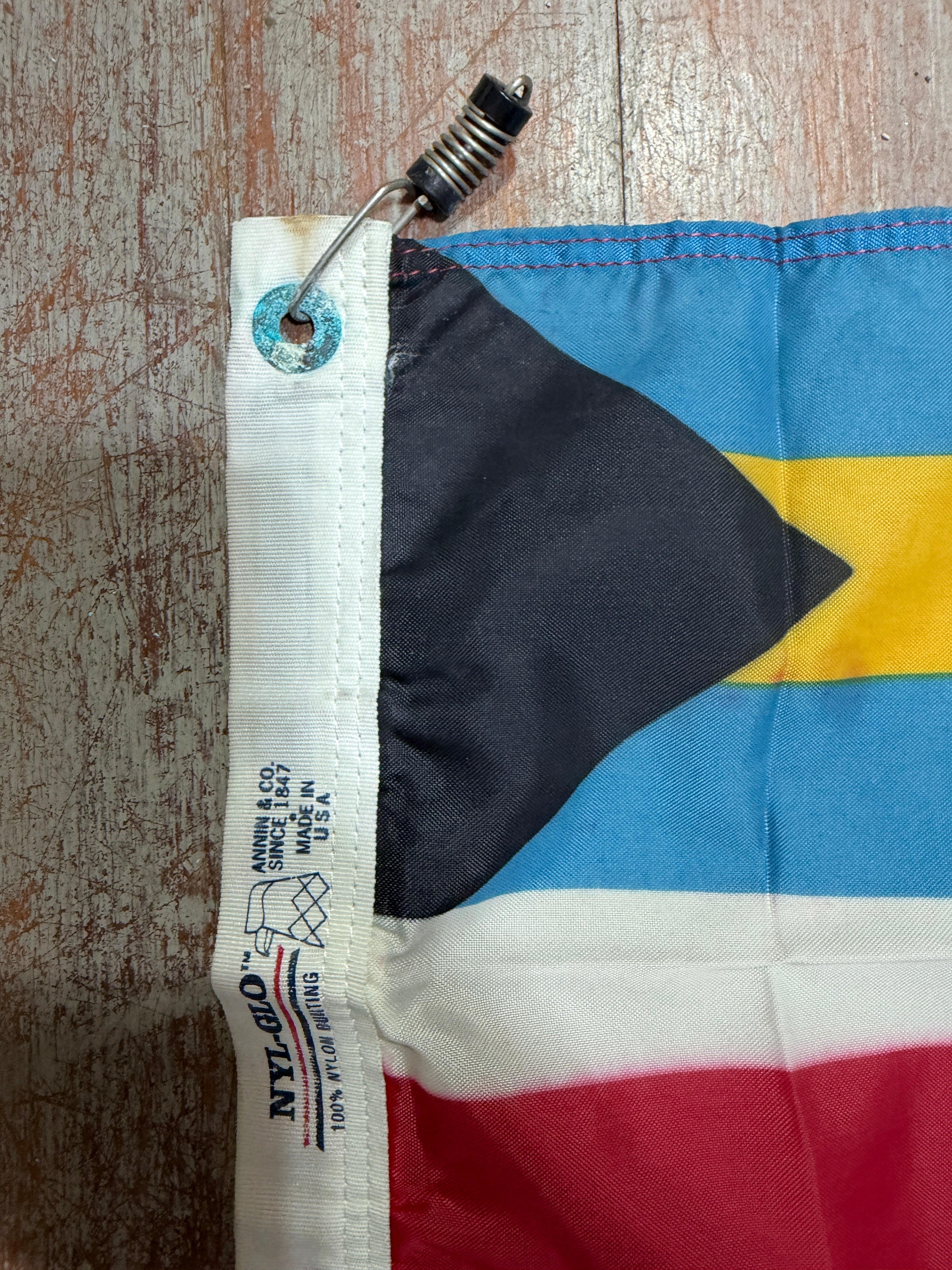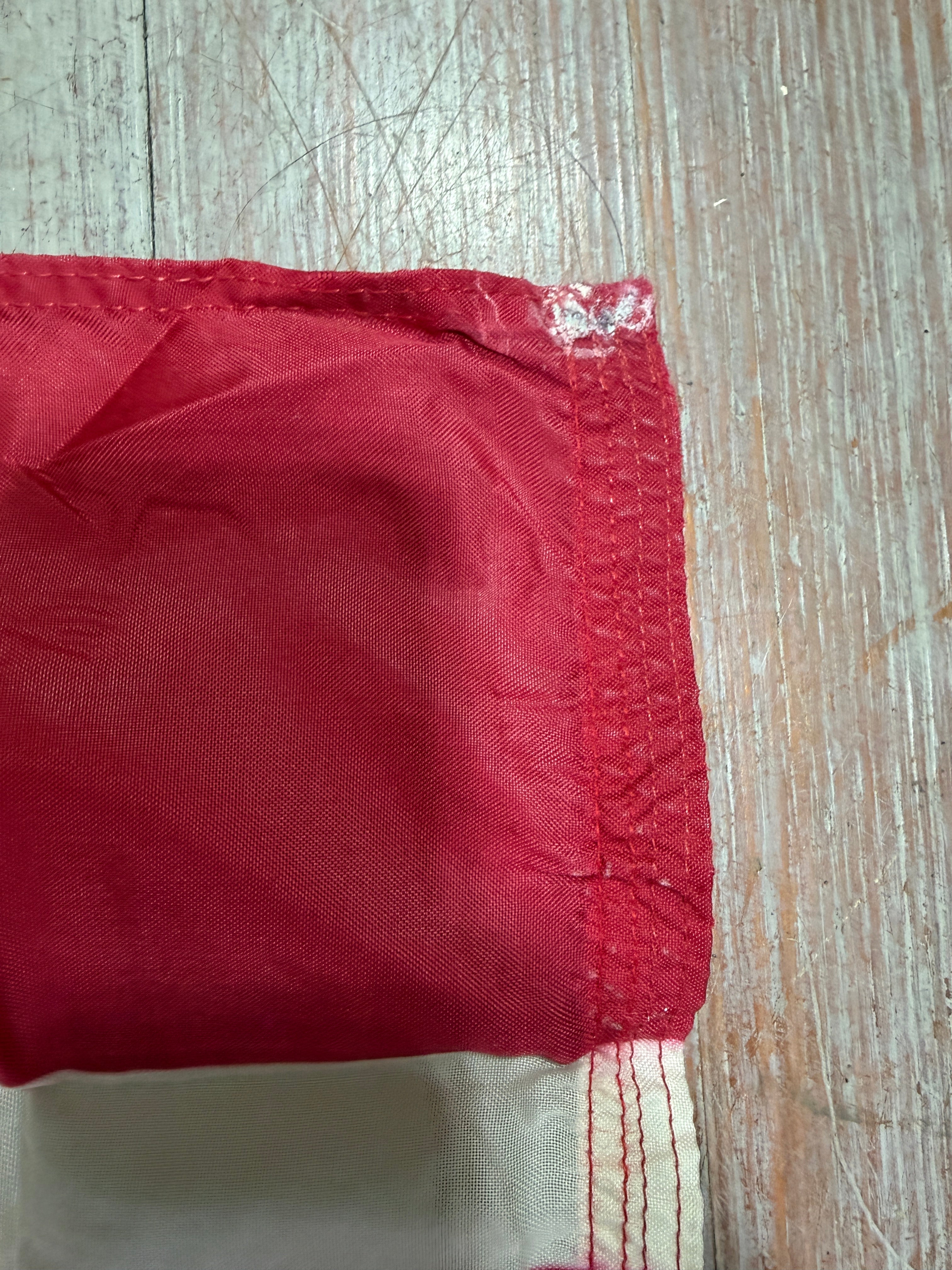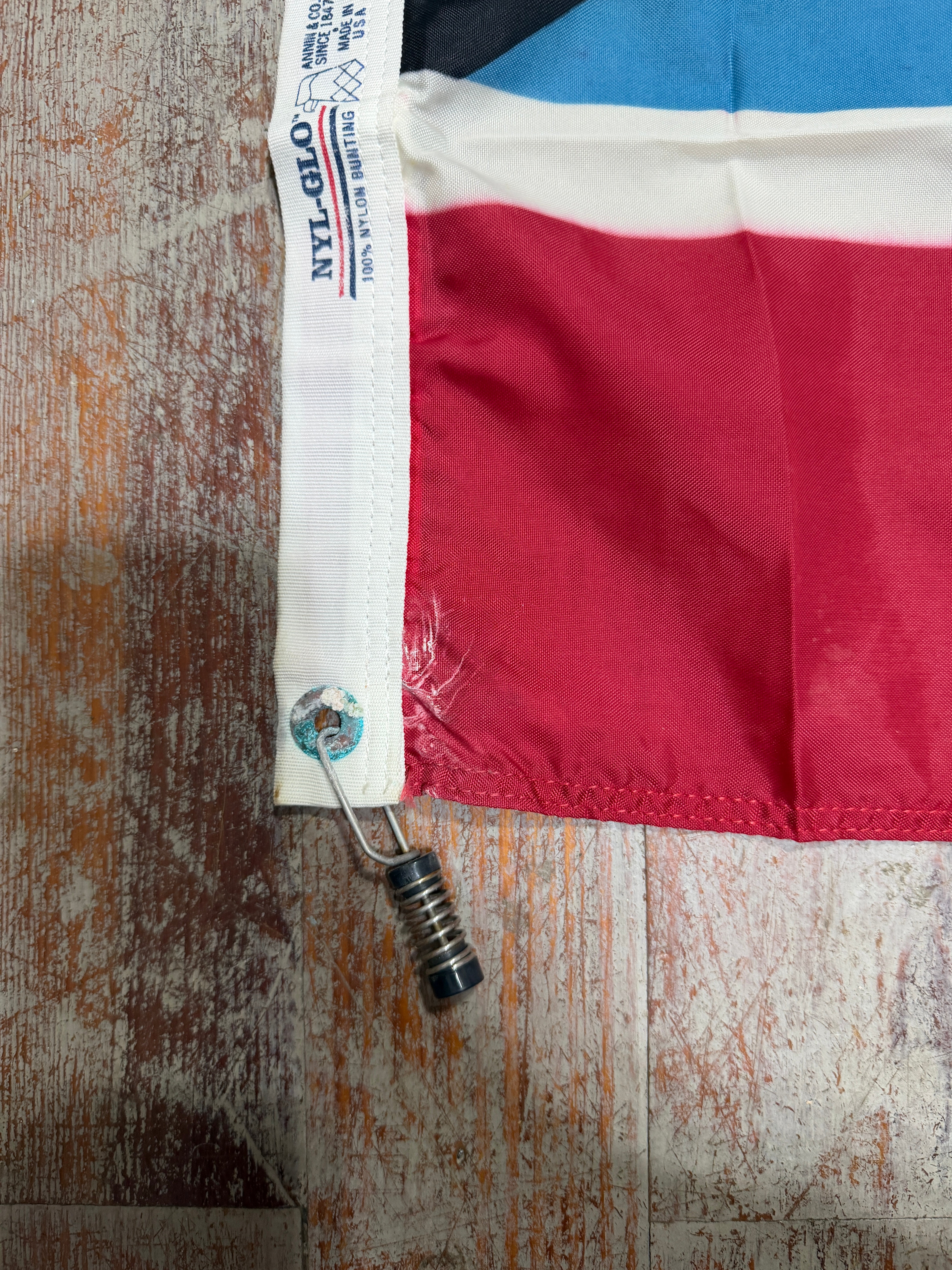 This flag is in decent condition. It measures 20" x 12". There are some imperfections on the corners from it being folded onto the corroded eyelets.