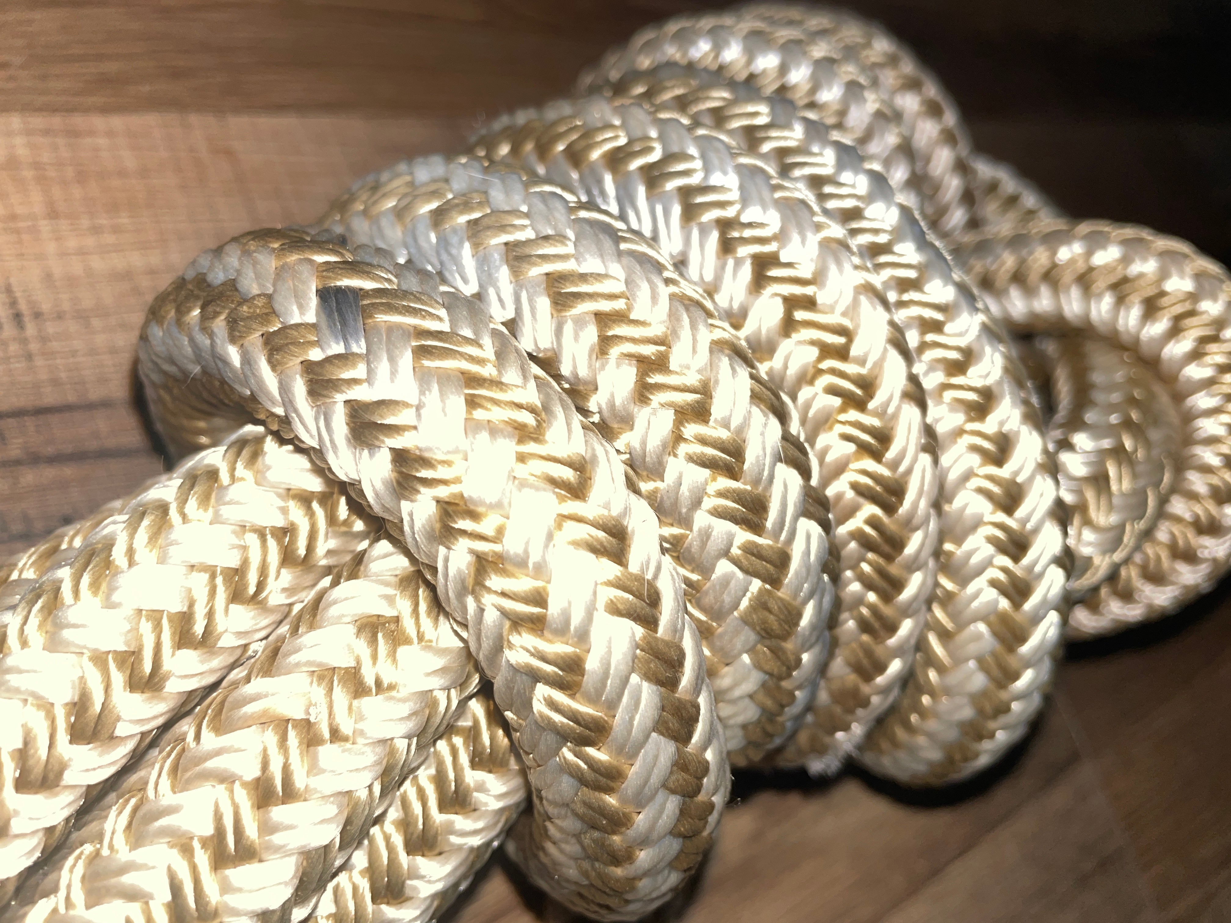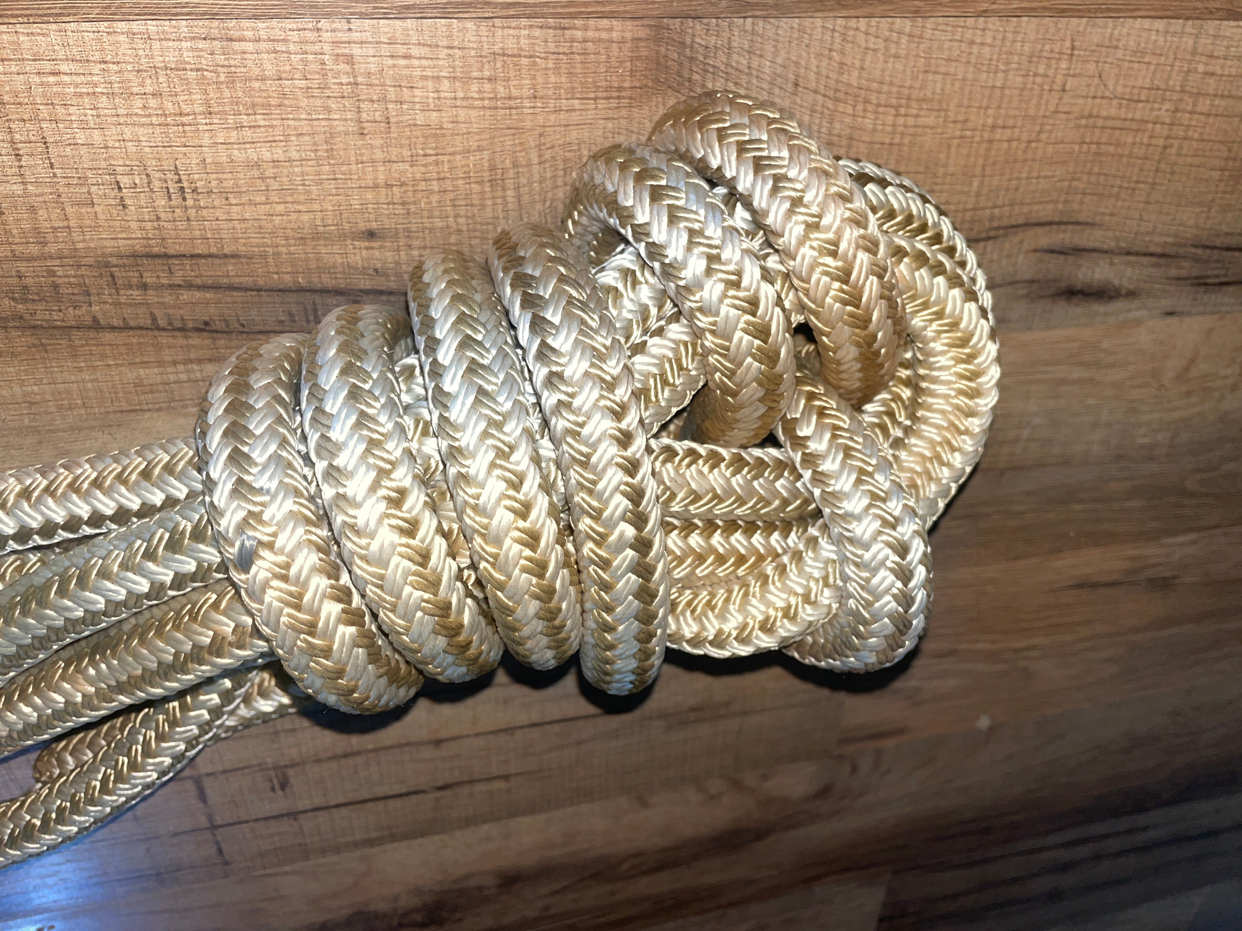 This gold and white braided dock line is in great condition. It is 22 feet total length and is 3/4” thick. Don’t see any sort of rub areas or Nics to the line.