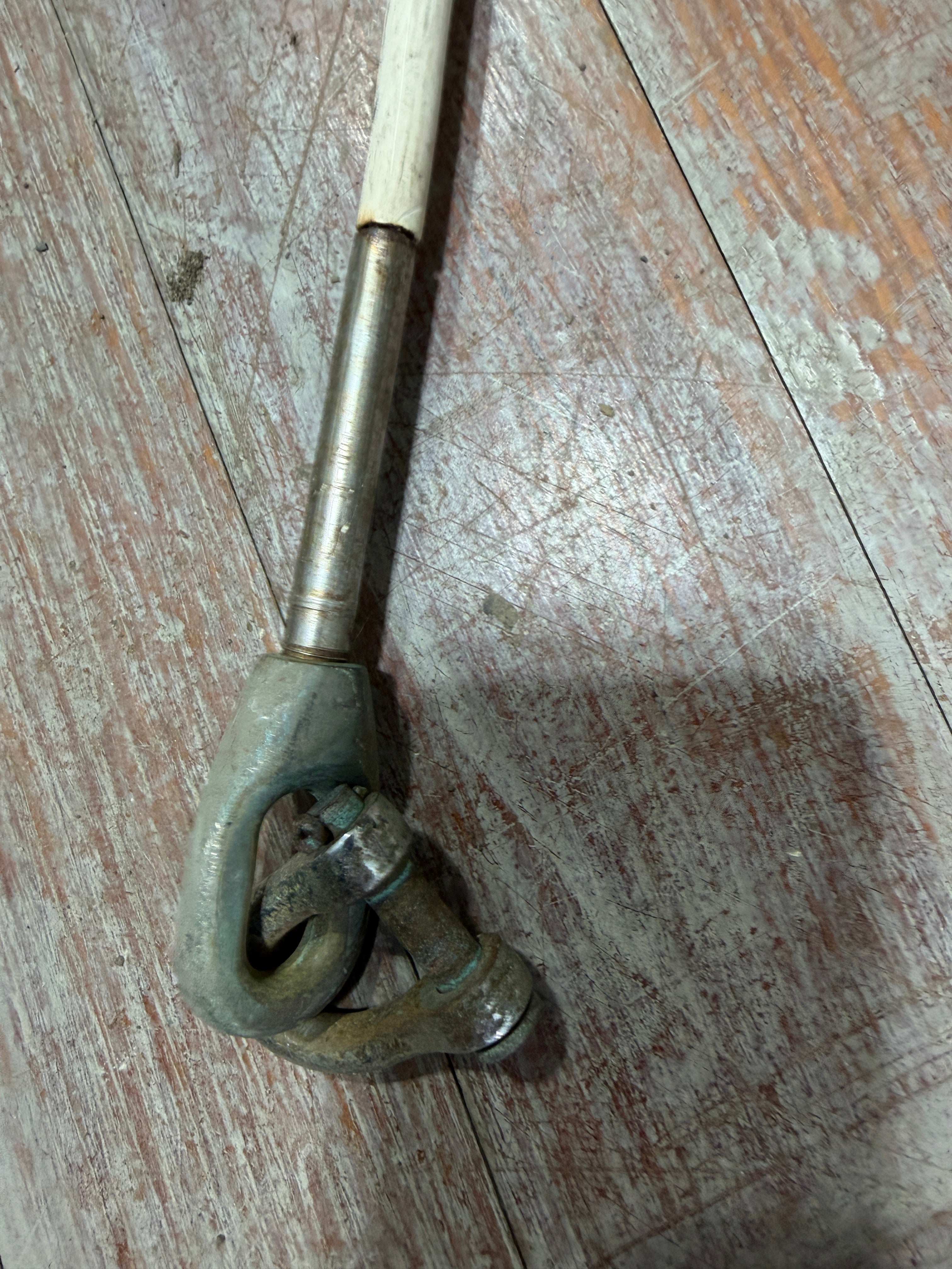 This life line gate is 24" in length. Chromed bronze pelican hook. The other end fitting is bronze and has a shackle attached. The cable is 3/8" diameter and it is intact just dirty.