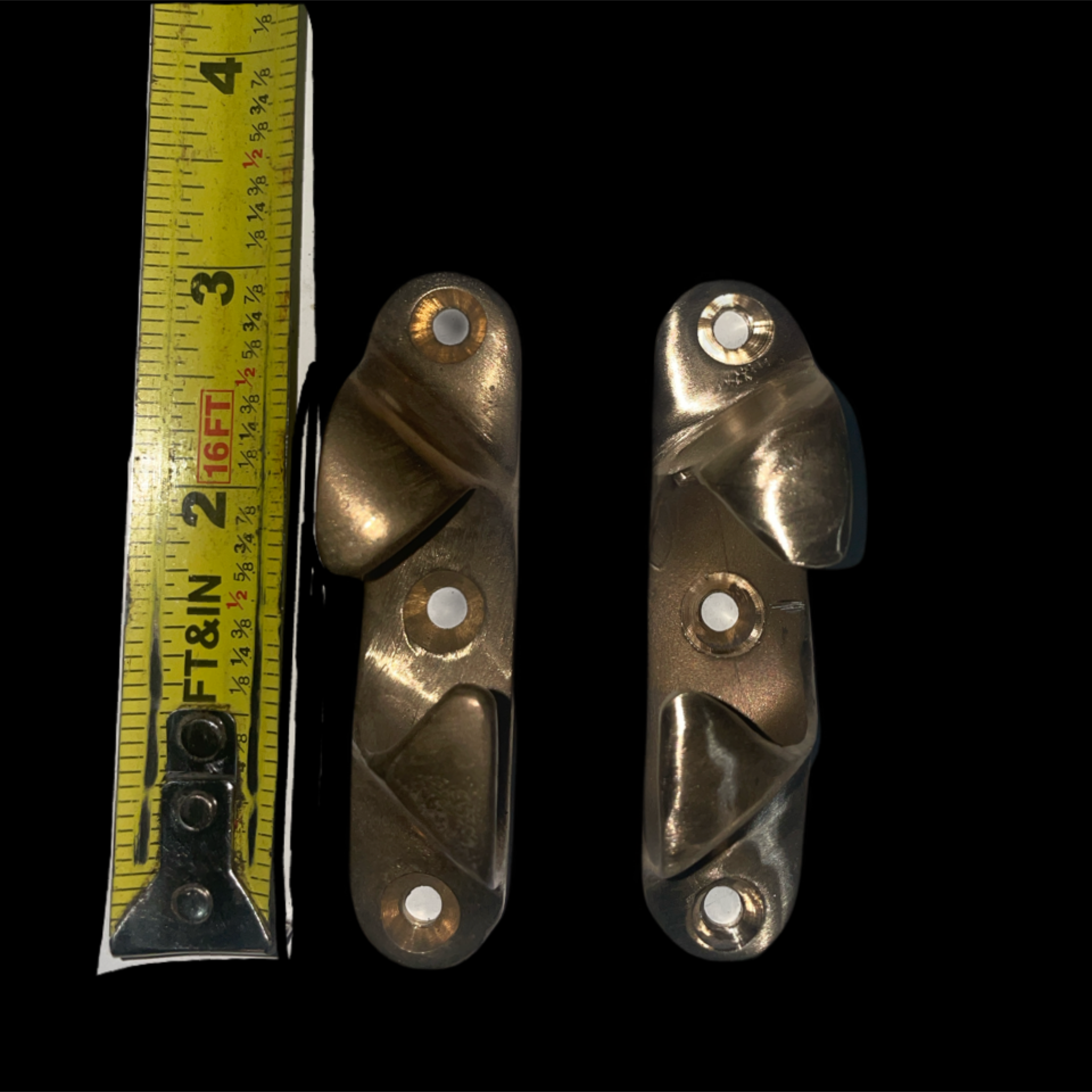 Solid bronze PORT & STARBOARD side small skeene open chock cleat. This cleat is only 3 1/4" in length. 3 screw mounting. Fits 1/2" line width. WILL COME AS A PAIR.