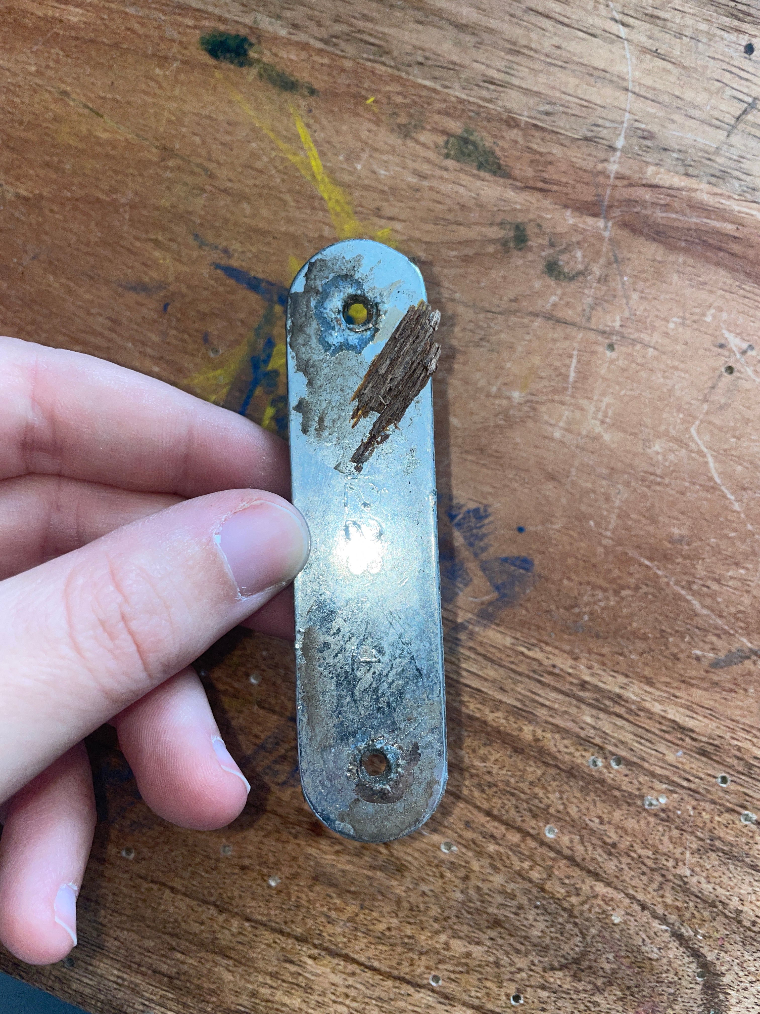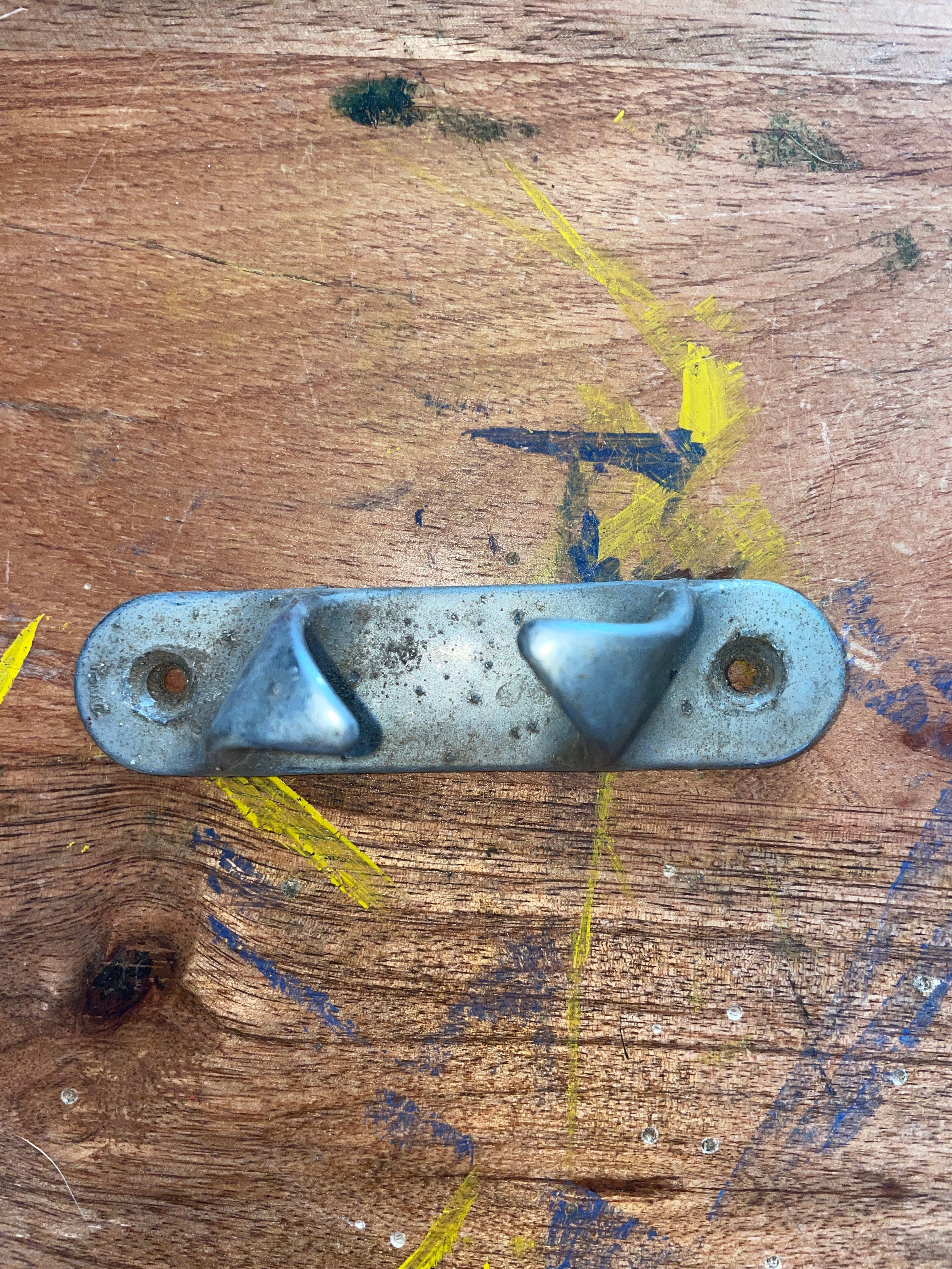 This small aluminum chock cleat is in good condition. It does have some minor pitting to the surface. The cleat overall is 3 3/8” in length x 7/8” wide. The width for line is 5/8” diameter.