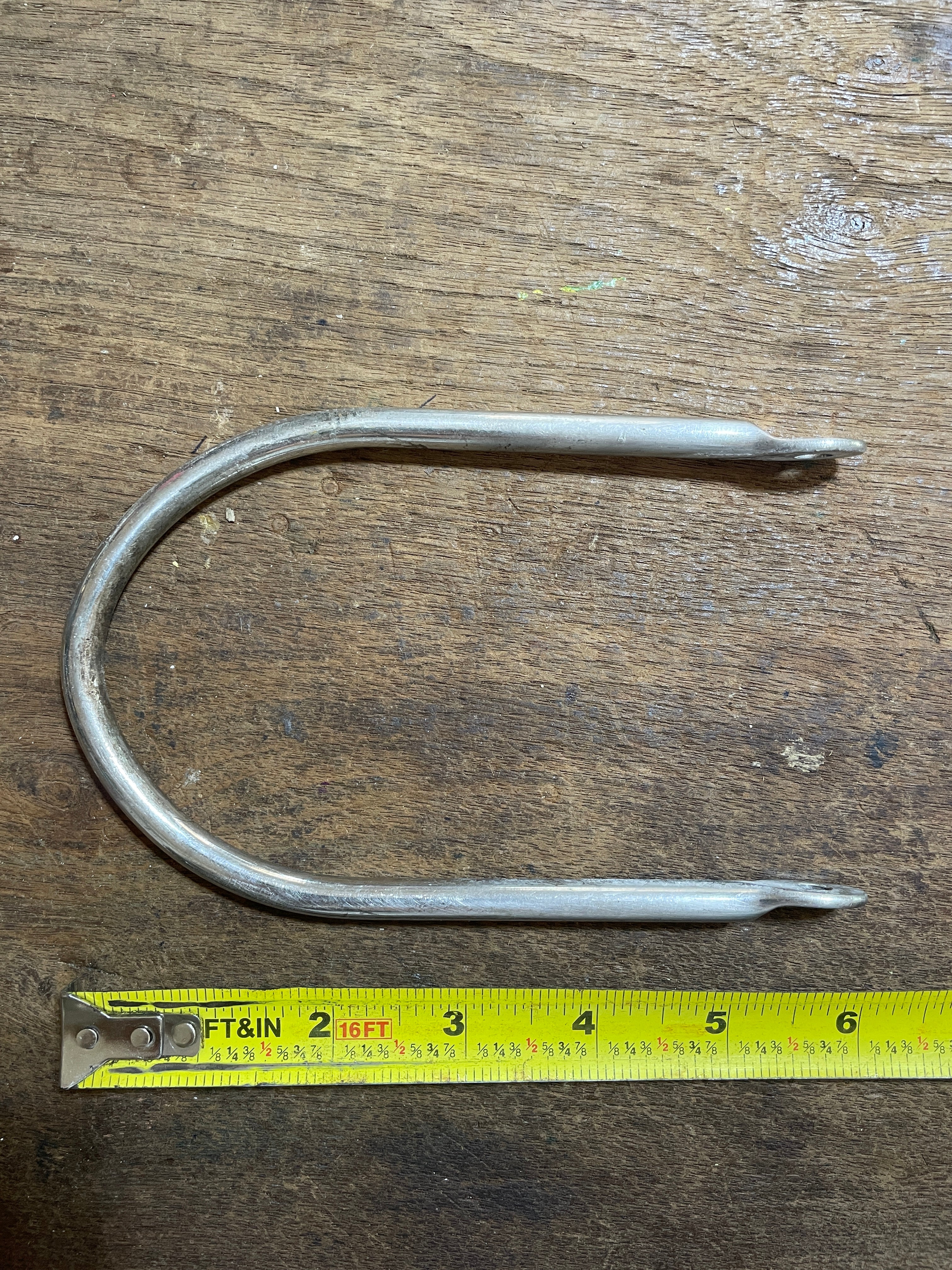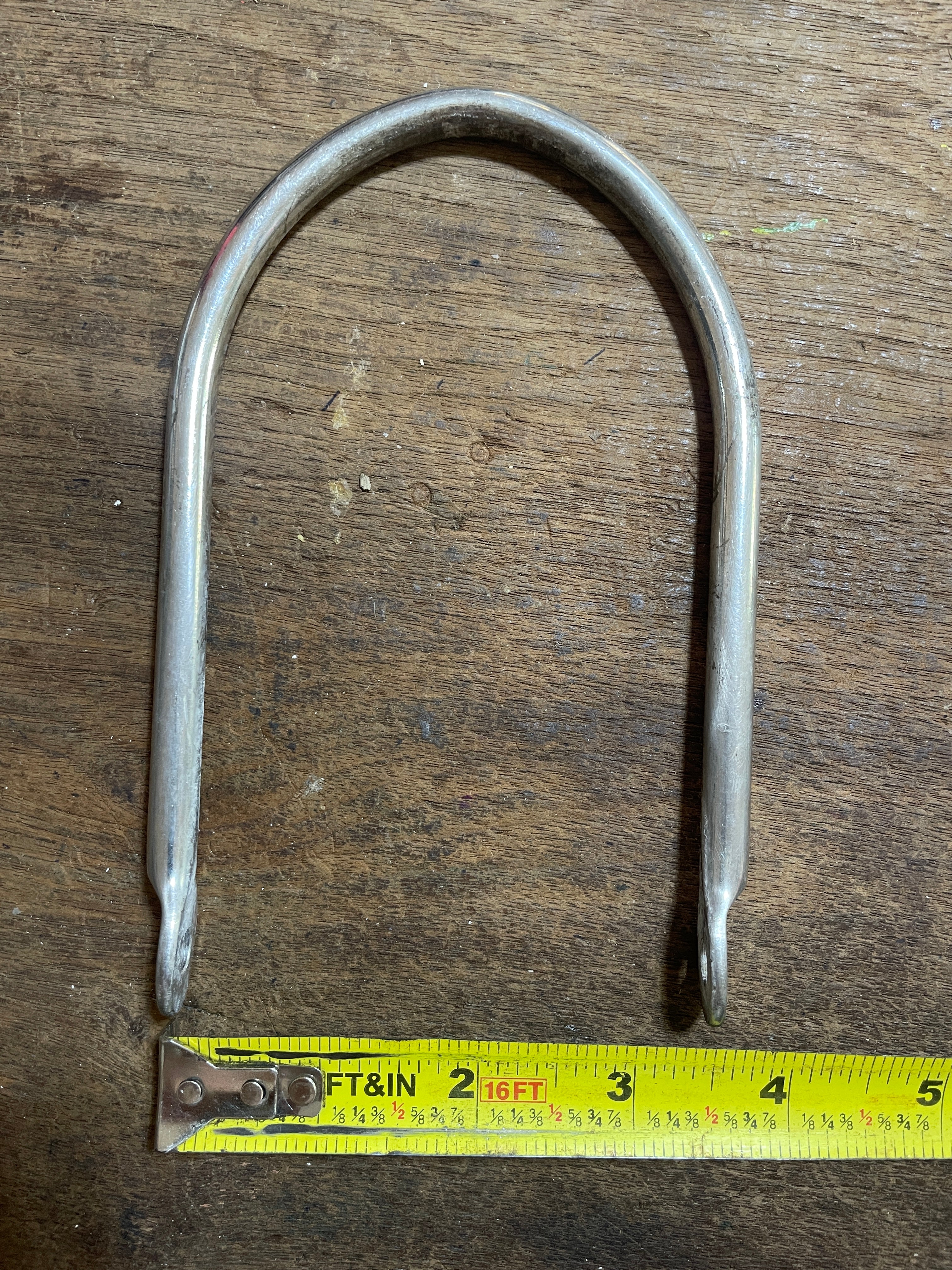 This stainless steel boom bail is in good condition. It does not have a bolt. the bolt needed is 3 1/2" long x 1/4" diameter. The boom bail is 6 1/4" total length. The inside diameter width is 3 5/16".