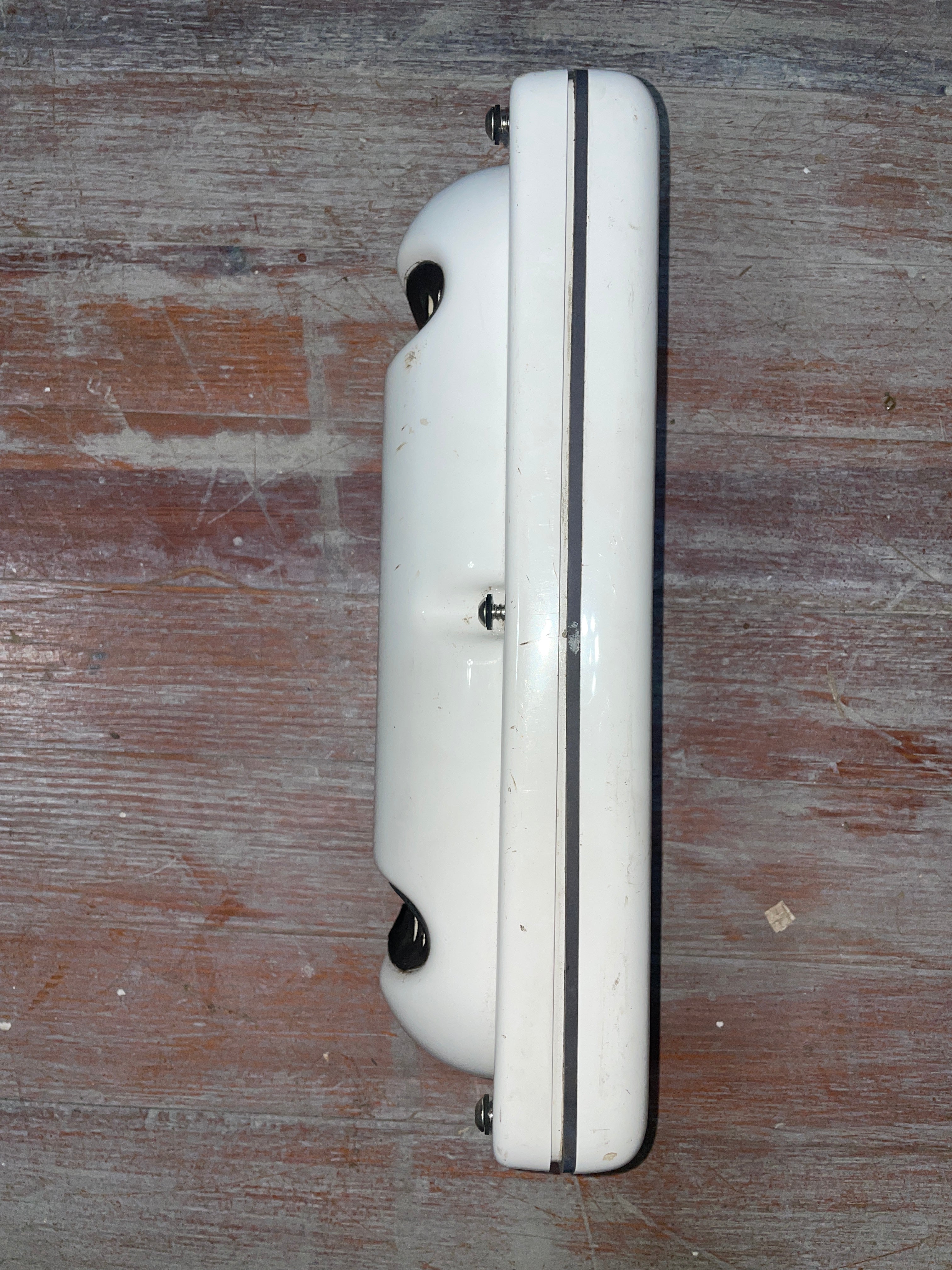 This 3 instrument navpod is in good condition. It fits on a 9.5" center to center pedestal guard width. It is 15" total length x 5 1/2" wide x 4" deep. The instrument holes are 3 1/2" diameter.