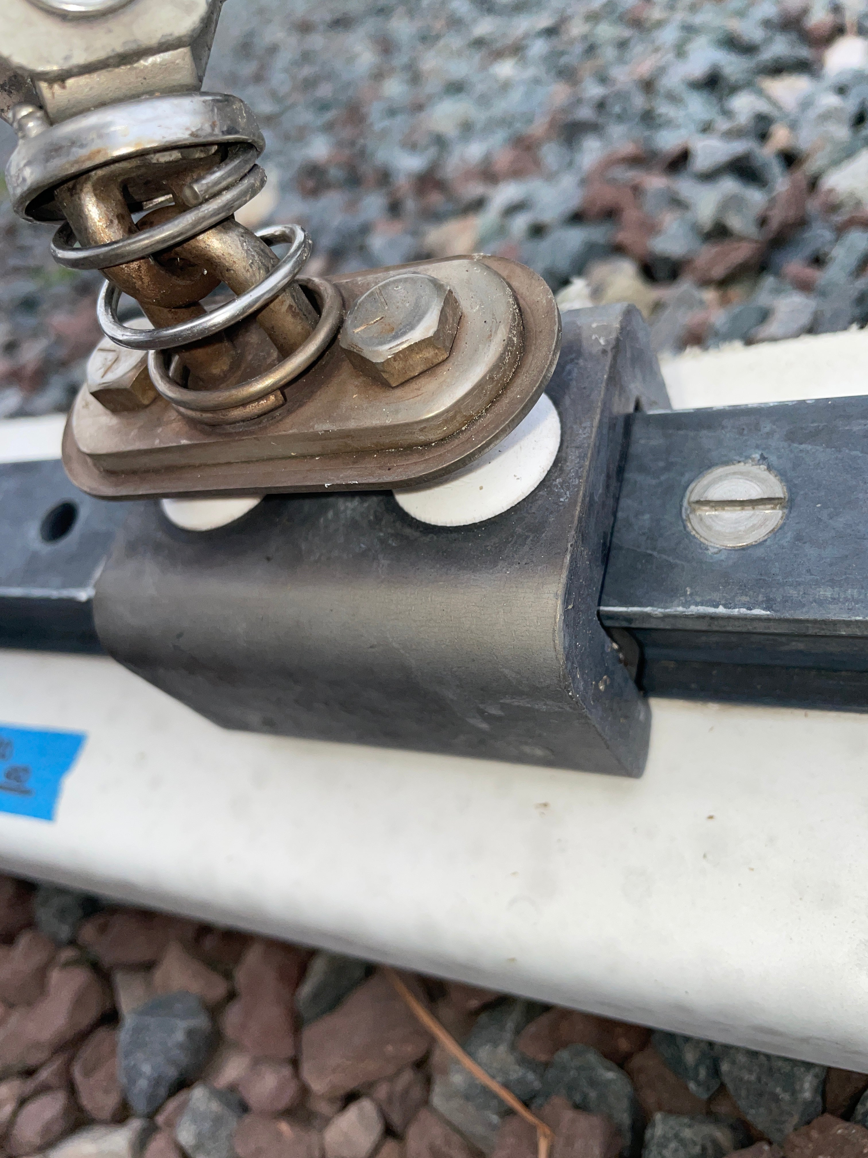 This Traveler is in great condition. The track is 1 1/4” and measures 36 1/2” long. Has A Schaefer fiddle block (1/2” line diameter) on the traveling car. Each end has a double cheek block that fits 1/4” line. We did remove this traveler off a Sabre 30 sailboat.