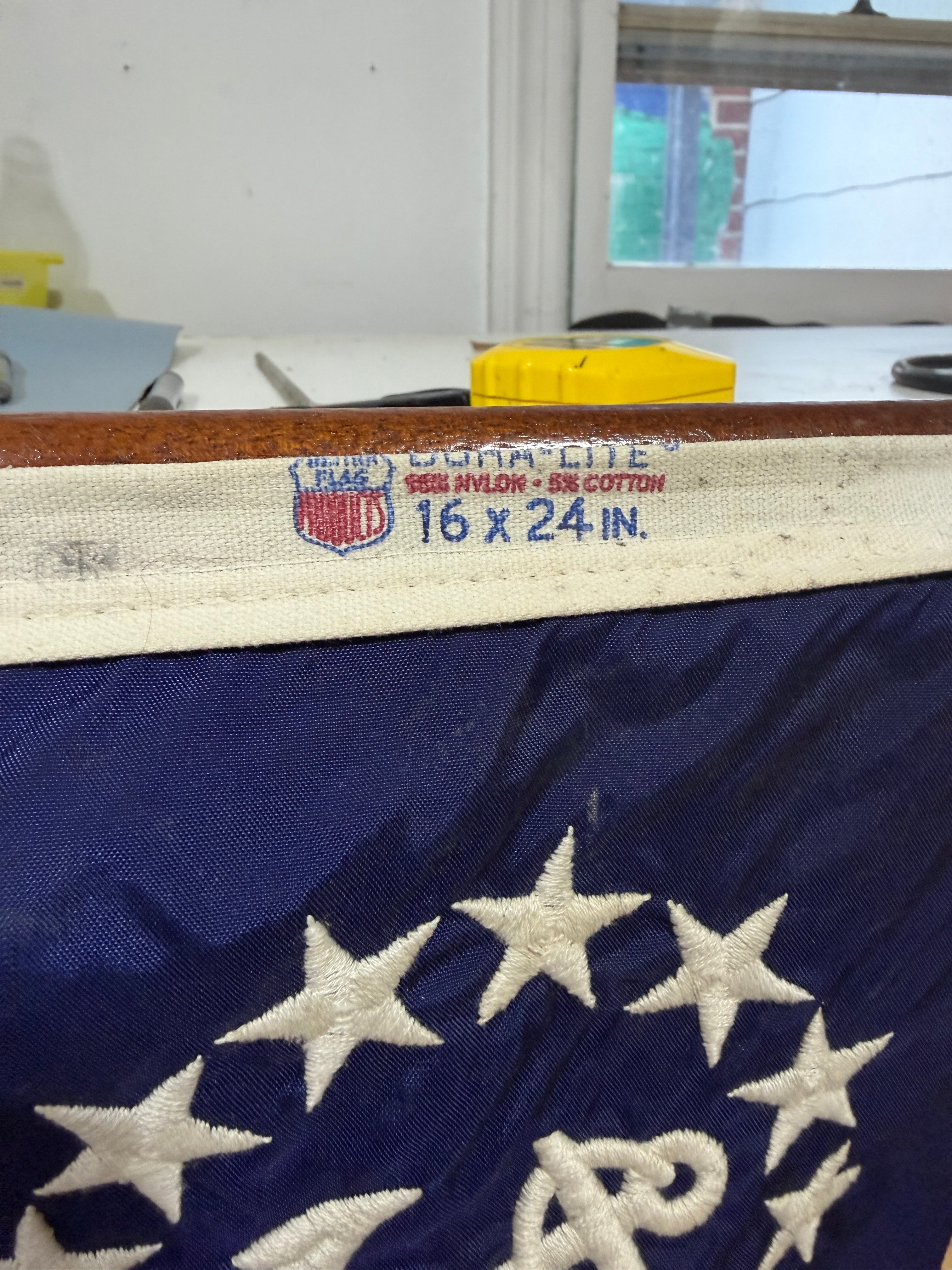 This 36" long flag pole is teak. Comes with a nautical American flag that is 16x24 inch. The pole insert is 1" diameter. Flag is overall very good condition, some minor staining.