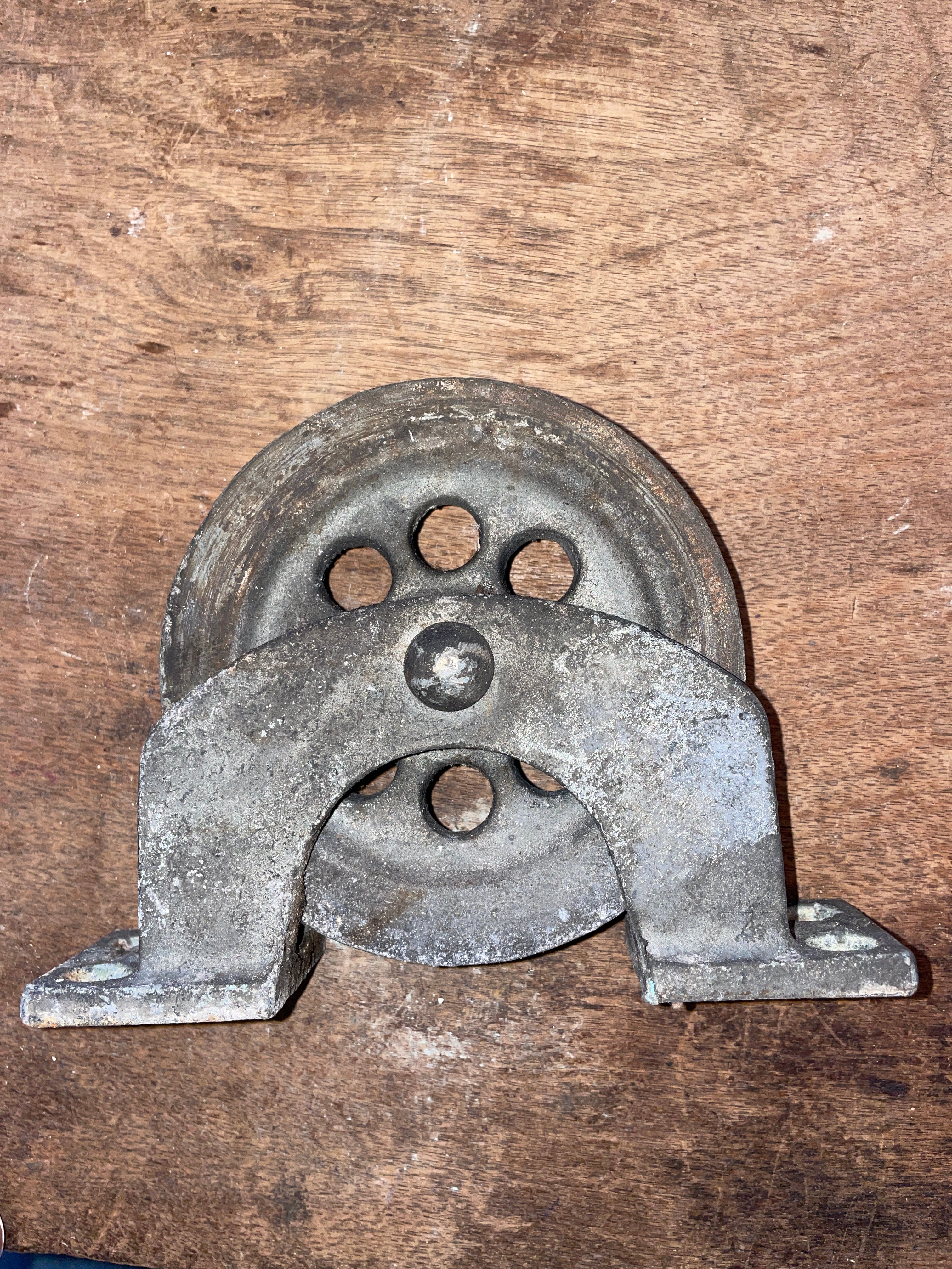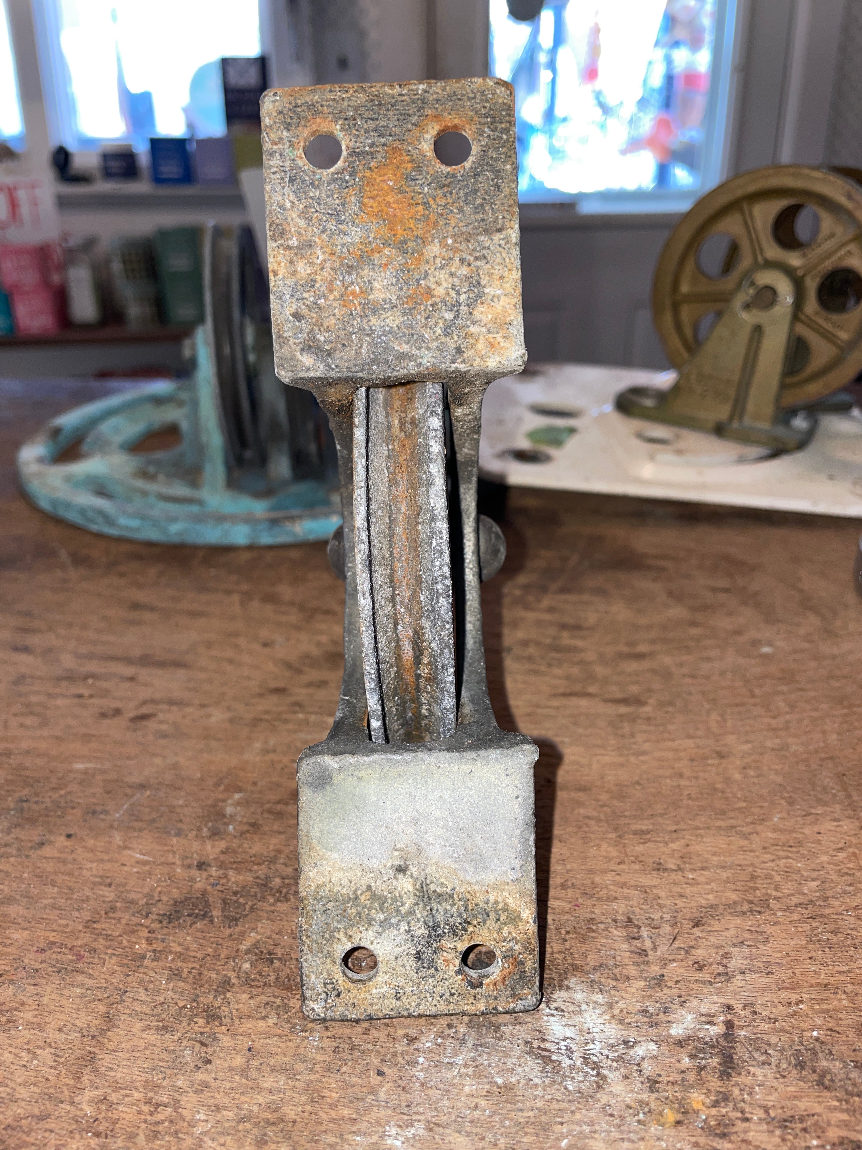 This single idler steering pedestal pulley is in good condition. The pulley is 4 1/2” diameter and can fit up to 7/16” line diameter. The base is 6 5/16” long x 1 5/8” wide. Has 4 total bolt install that is 7/8” apart (center to center). Stands 4 3/4” tall.