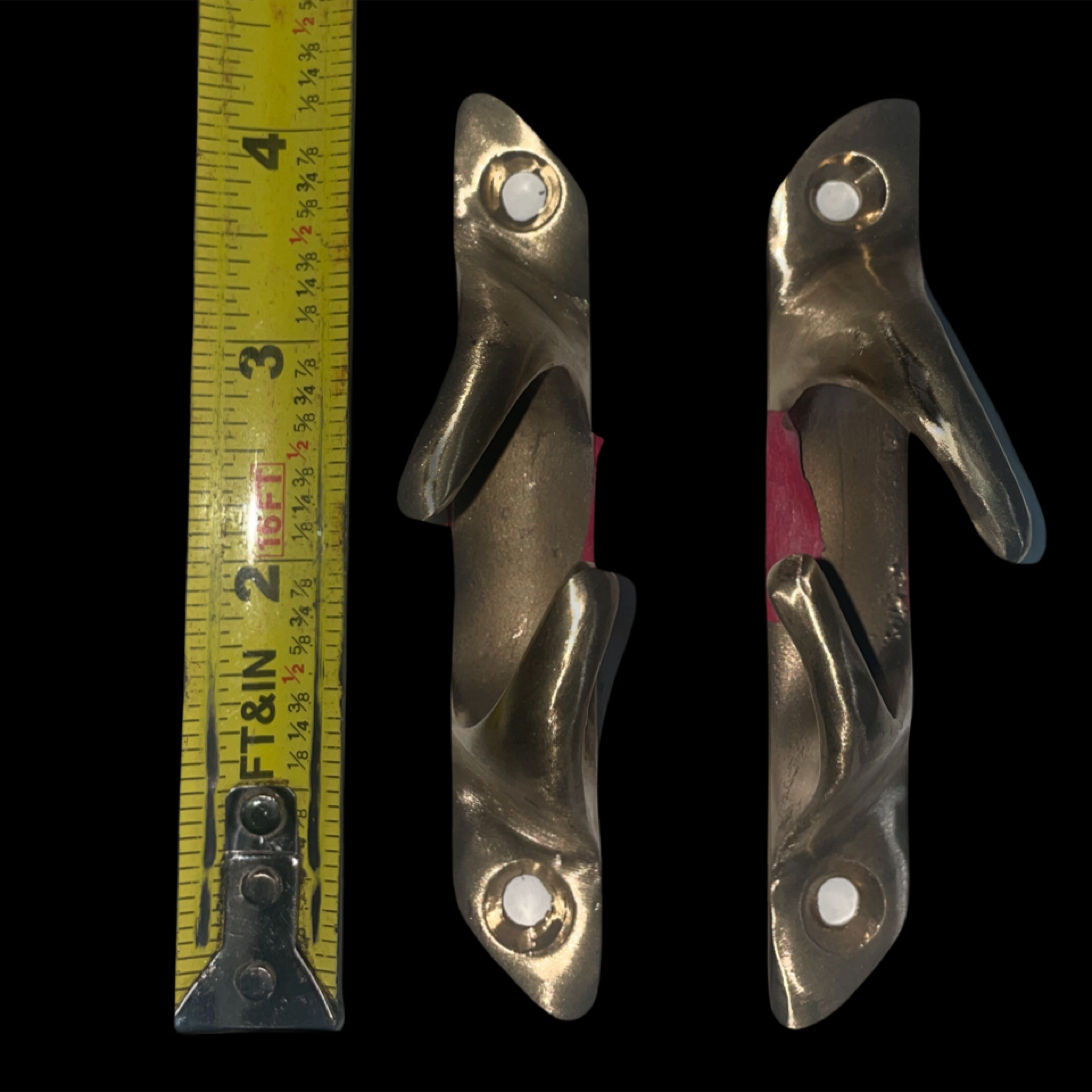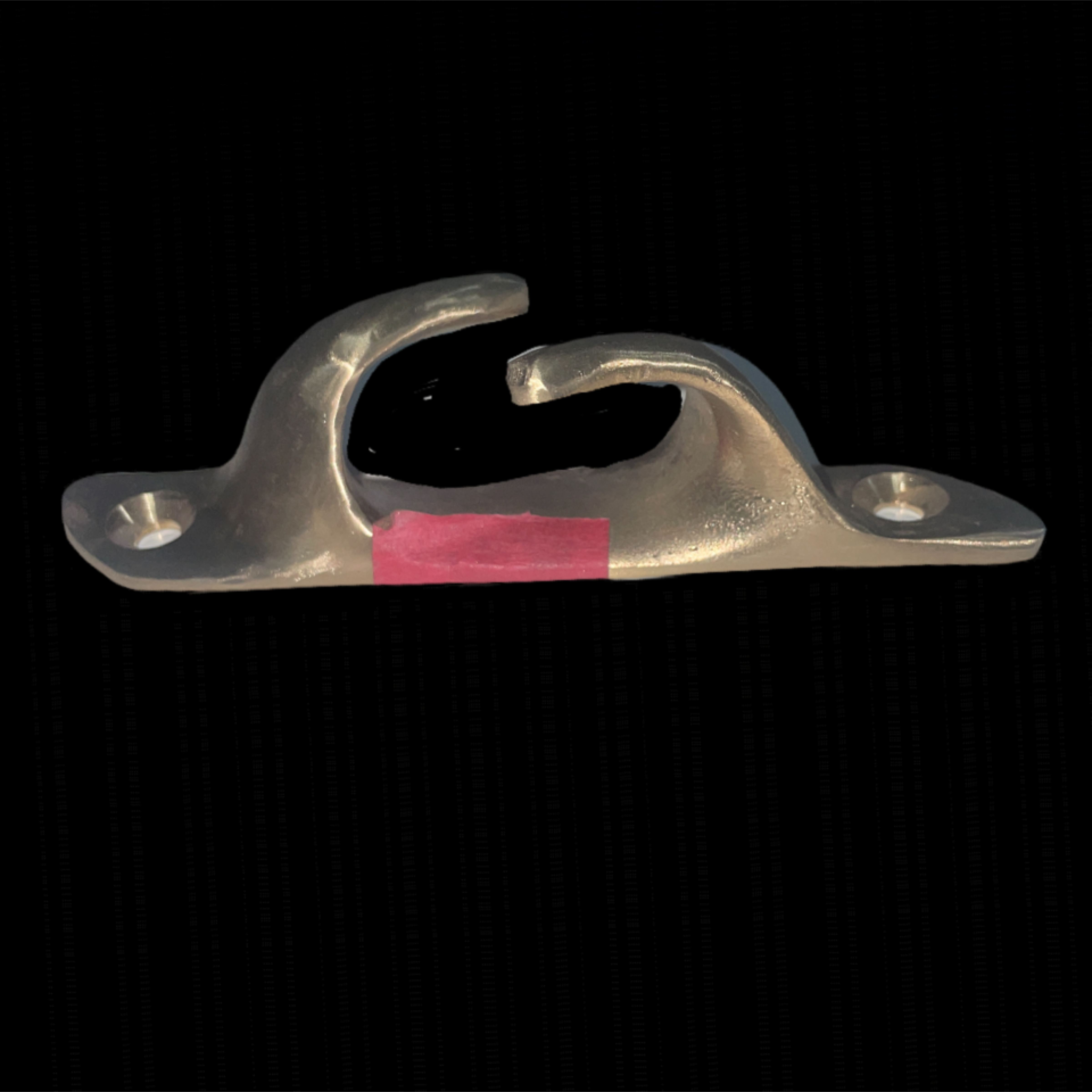 Bristol bronze, unknown part # for these cleats. This skinny skeene chock cleat is 4 1/2" long x 3/4" wide. Fits 1/2" line diameter. WILL COME AS A PAIR.