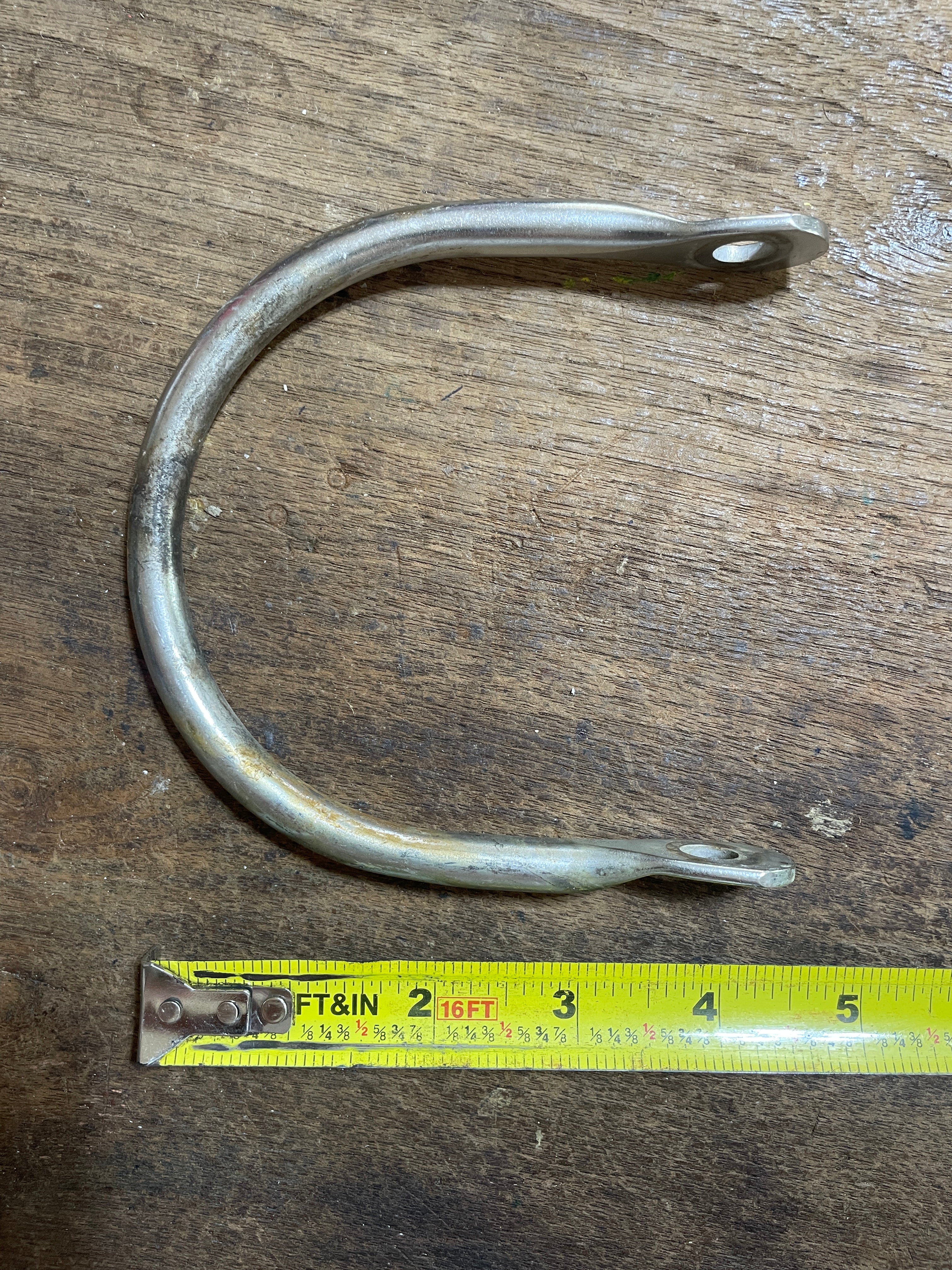 This stainless steel boom bail is in good condition. It does not have a bolt. The bolt needed is 4 3/8" long x 1/2" diameter. The boom bail is 5" total length. The inside diameter width is 4 1/8".