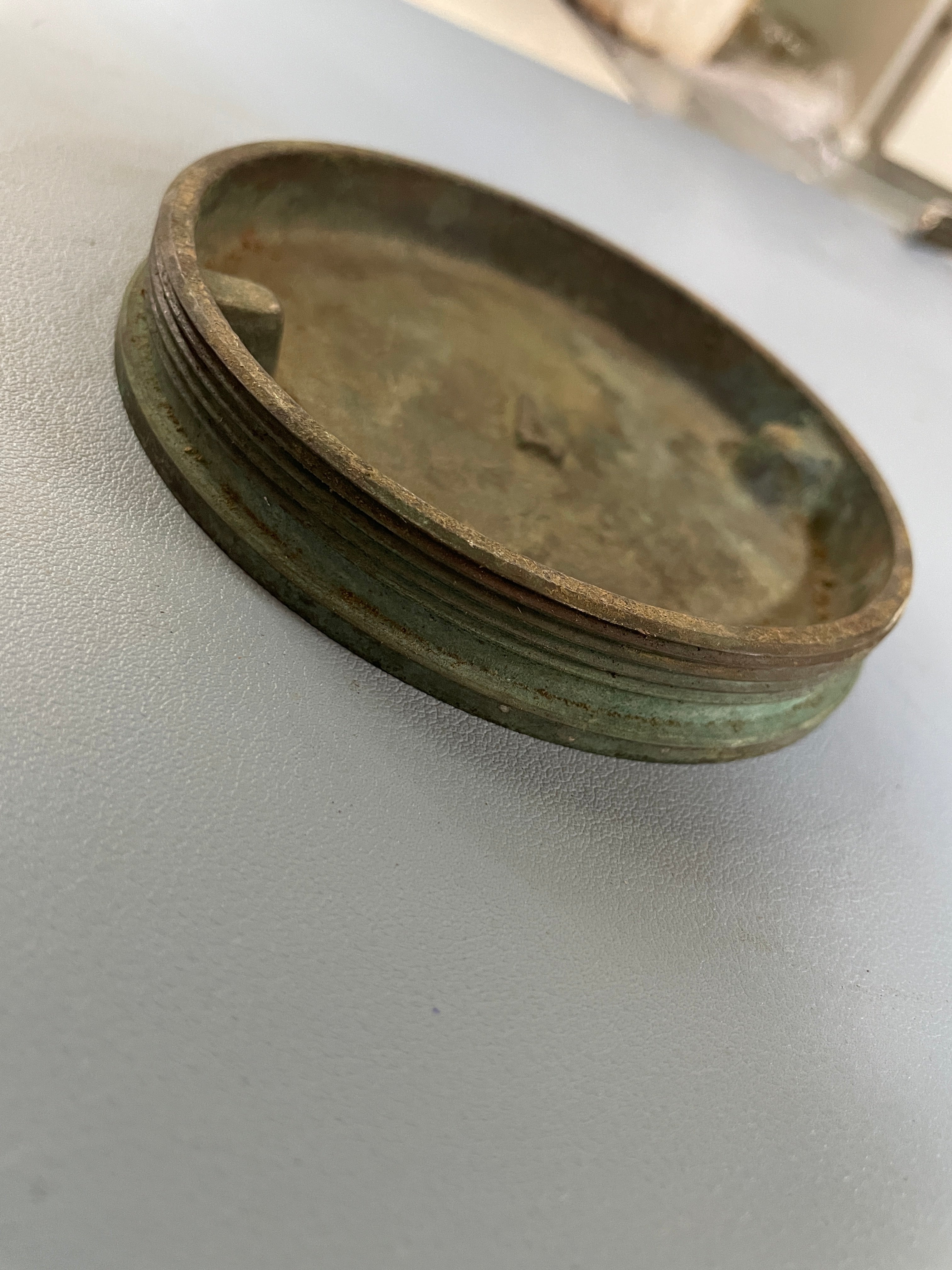 This 4" deck plate / vent cover is in good condition. Has some surface damage to the patina. The key holes are 1/4" diameter and are 3 7/16" apart.