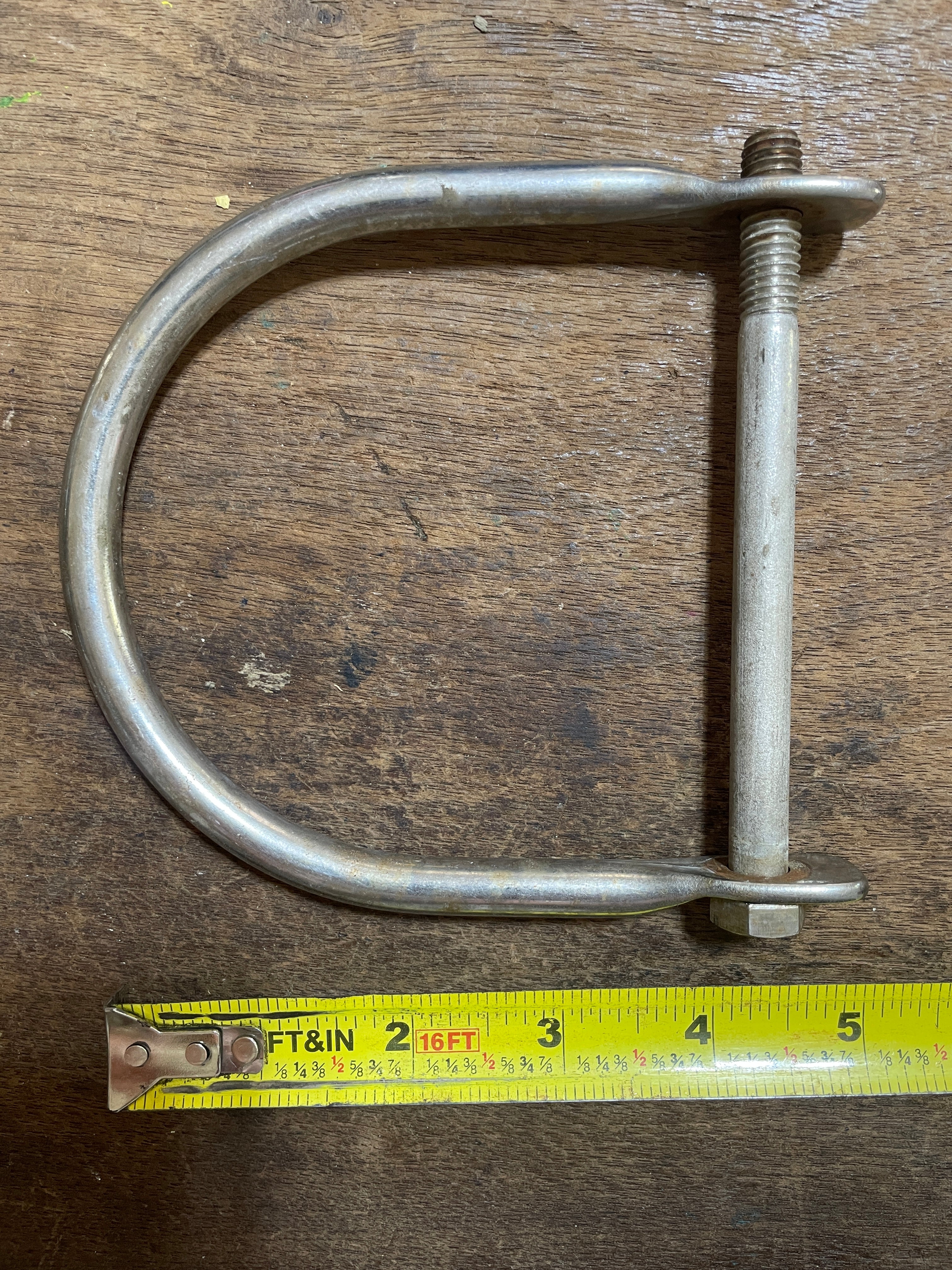 This stainless steel boom bail is in good condition. It has an inside diameter width of 4". The bolt is 5" long x 3/8" wide, it is missing the nut. The boom bail is 5 1/4" total length.