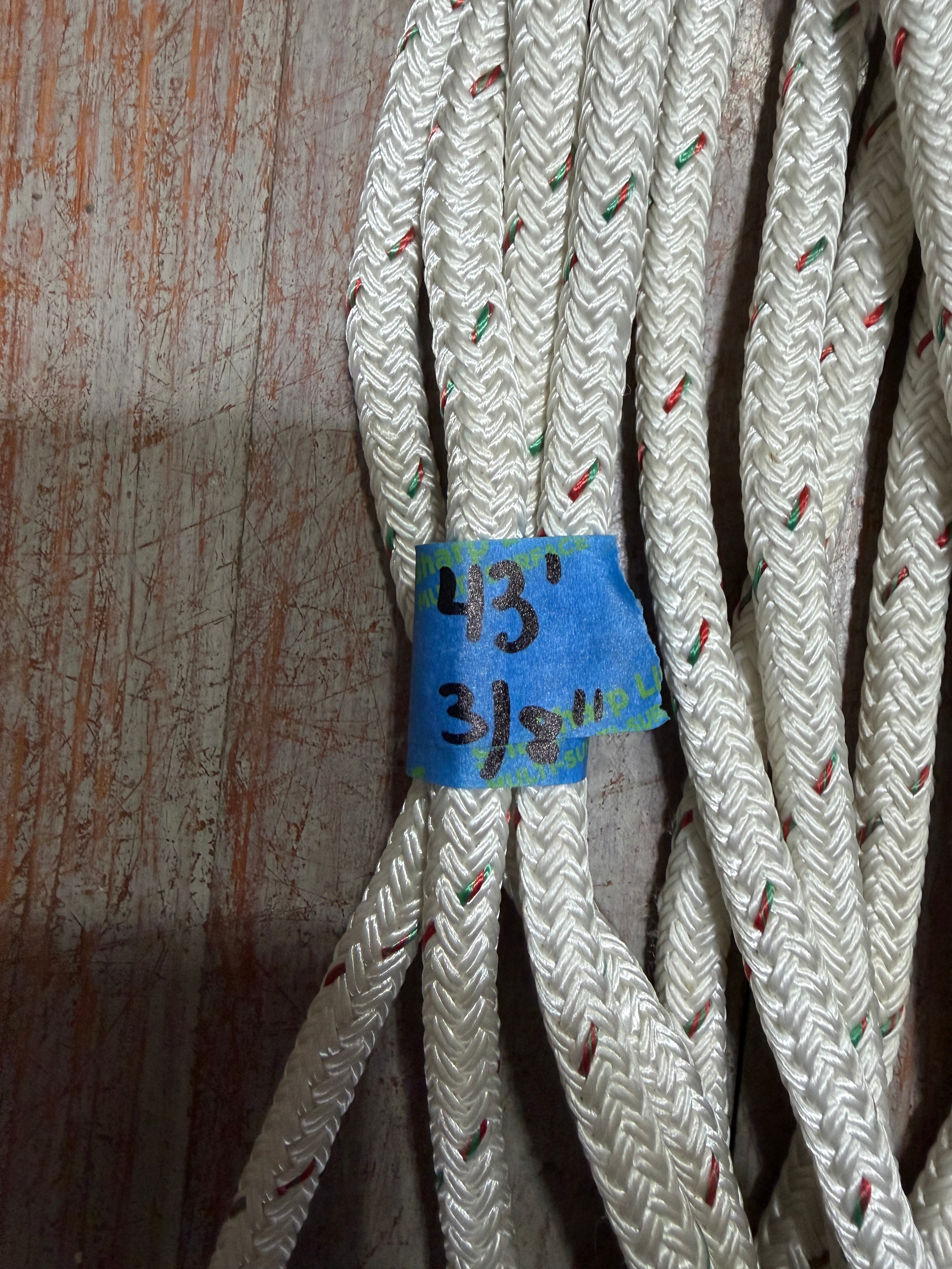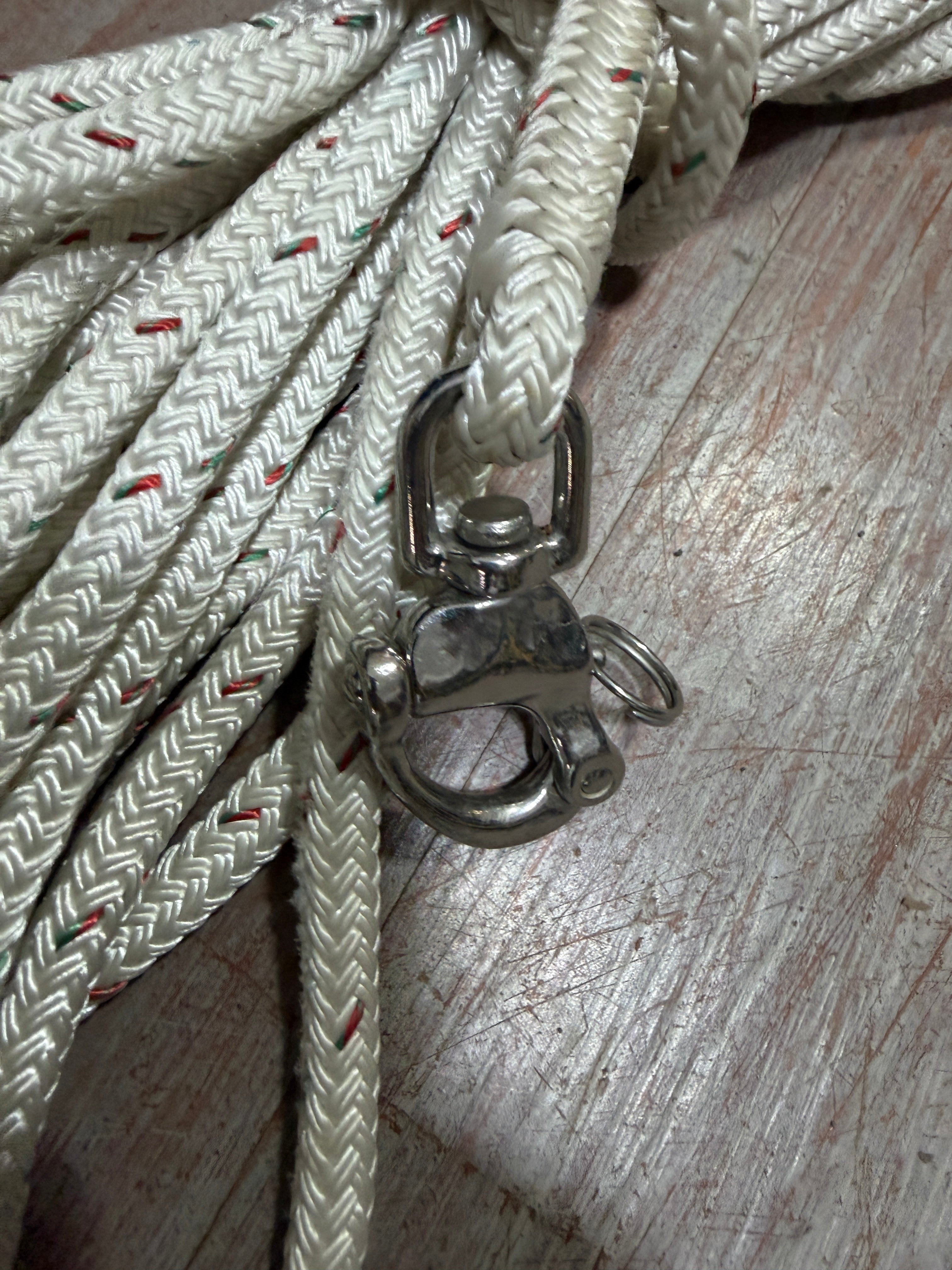 This bundle of line is in great condition. It is 43 feet total length x 3/8" diameter. Comes with an attached stainless steel swivel bails shackle. White line with green and red intertwined.