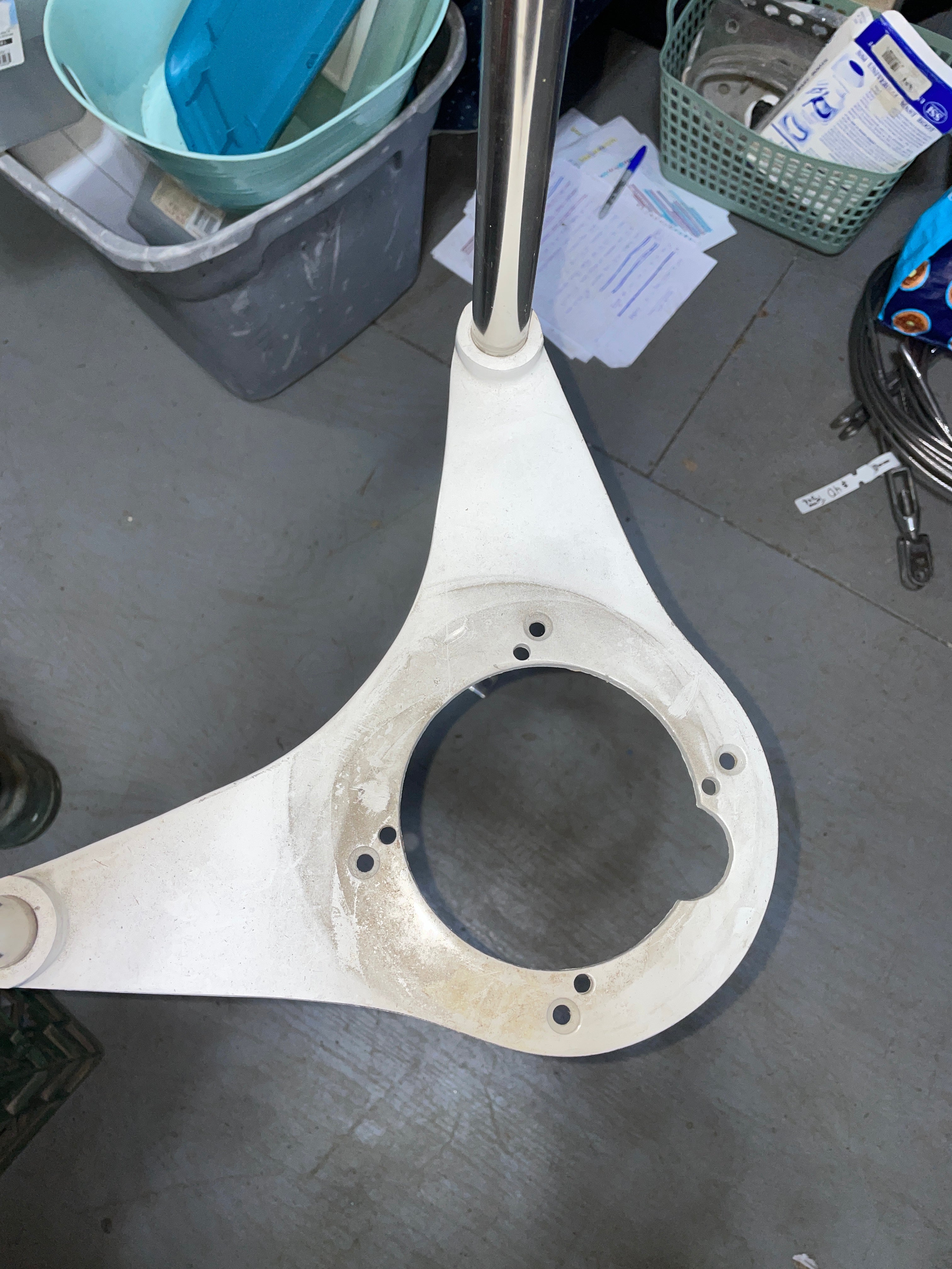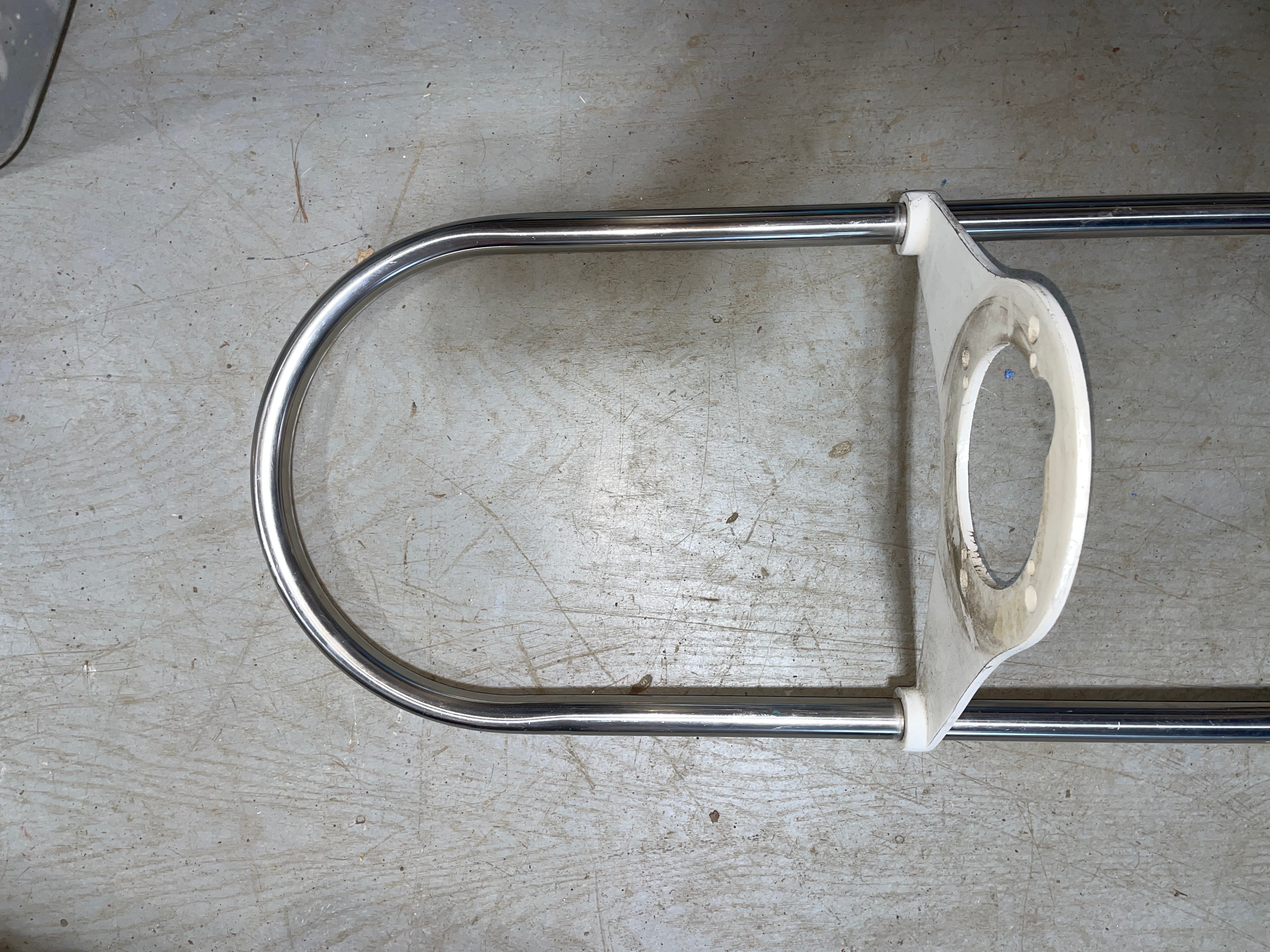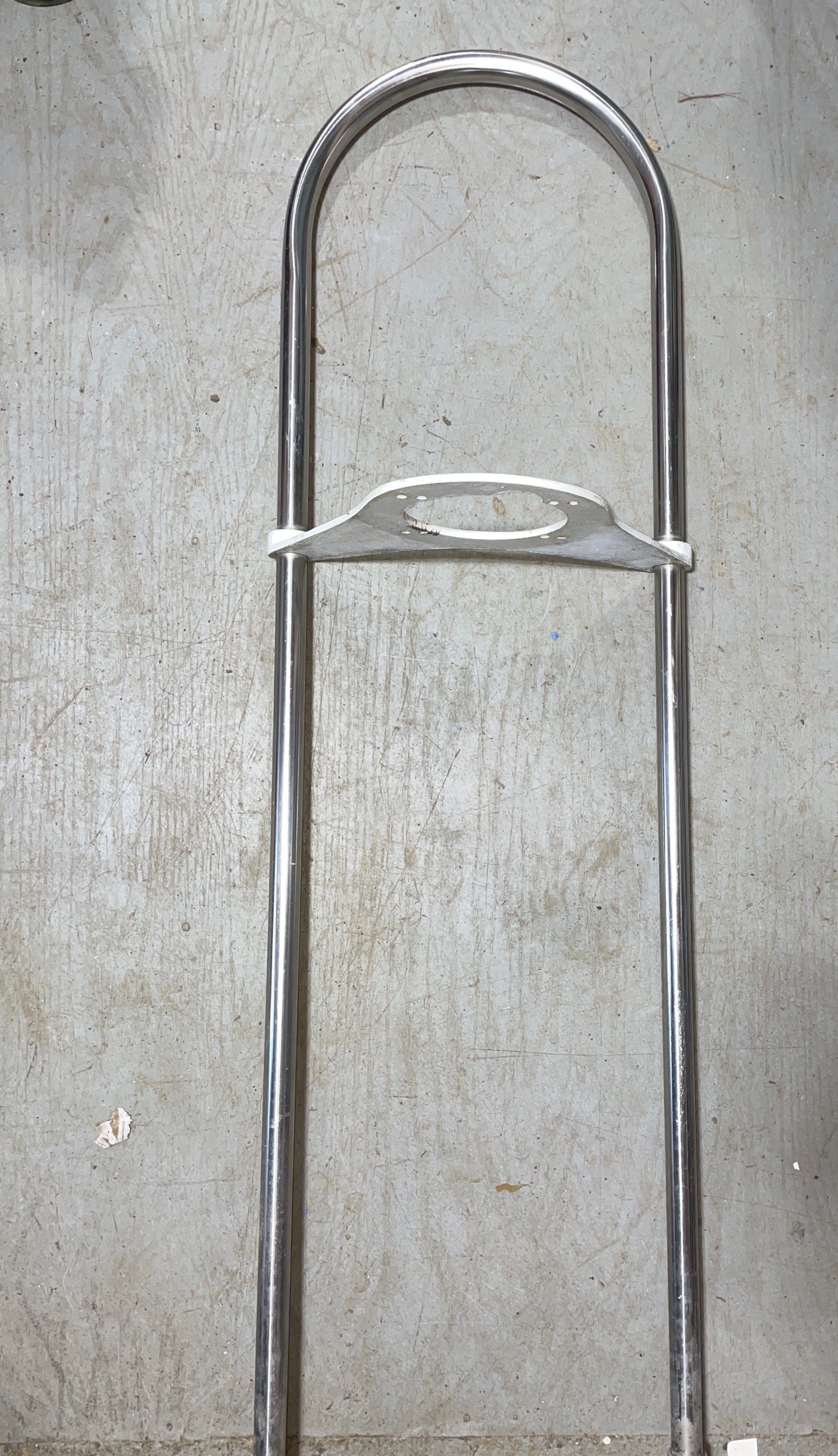 This stainless steel pedestal guard is in great condition. The guard is 1” tubing and stands 45.5” total height. The rail tubing is 9.5” apart center to center. NO FEET INCLUDED. The top plate center hole for a compass is 4 5/8” diameter. With it mounted to the pedestal it sticks out 7 3/4”. The bolt pattern is 4 3/4” long x 3 3/4” wide. Will be taken apart for easier cheaper shipping