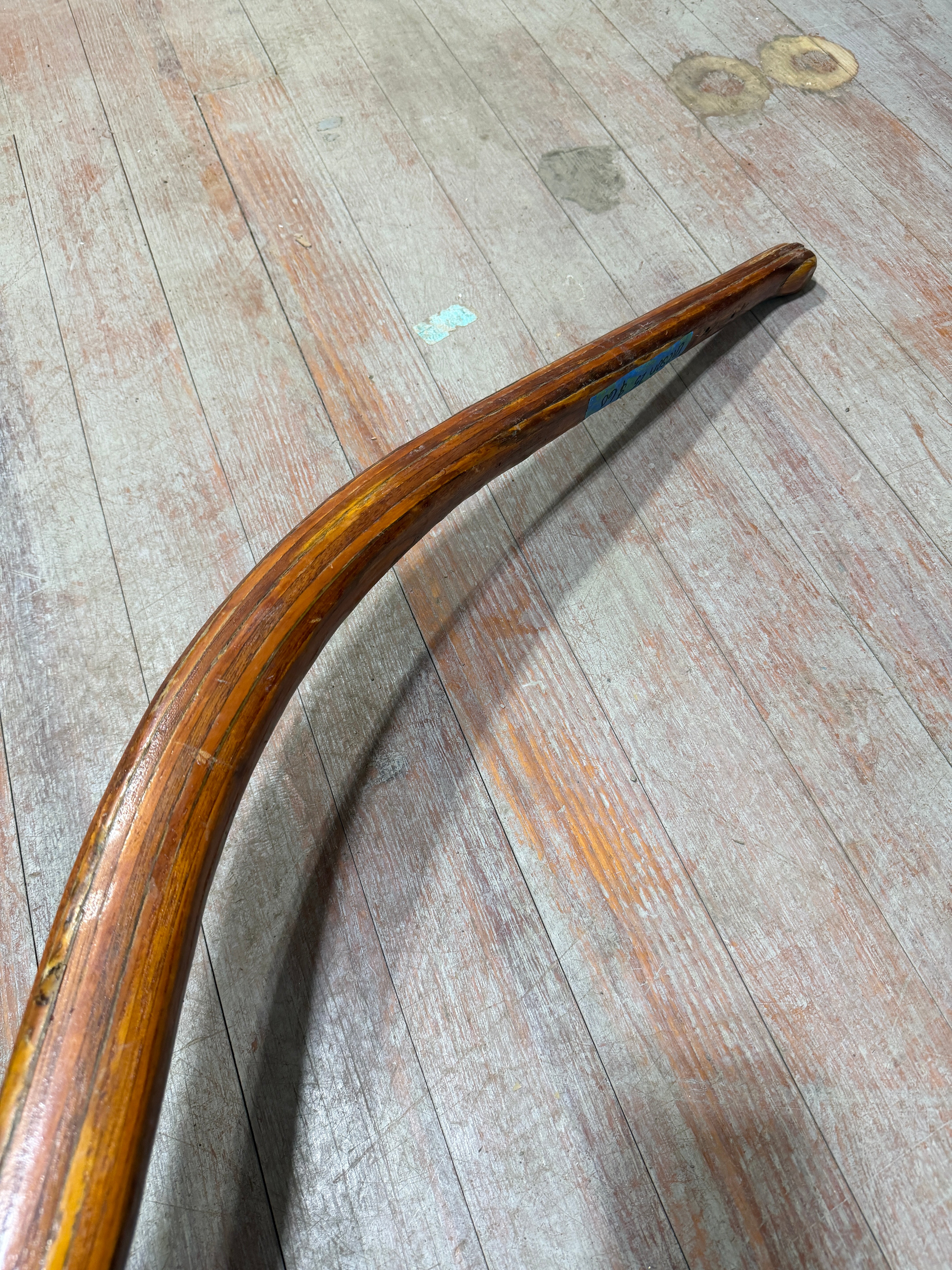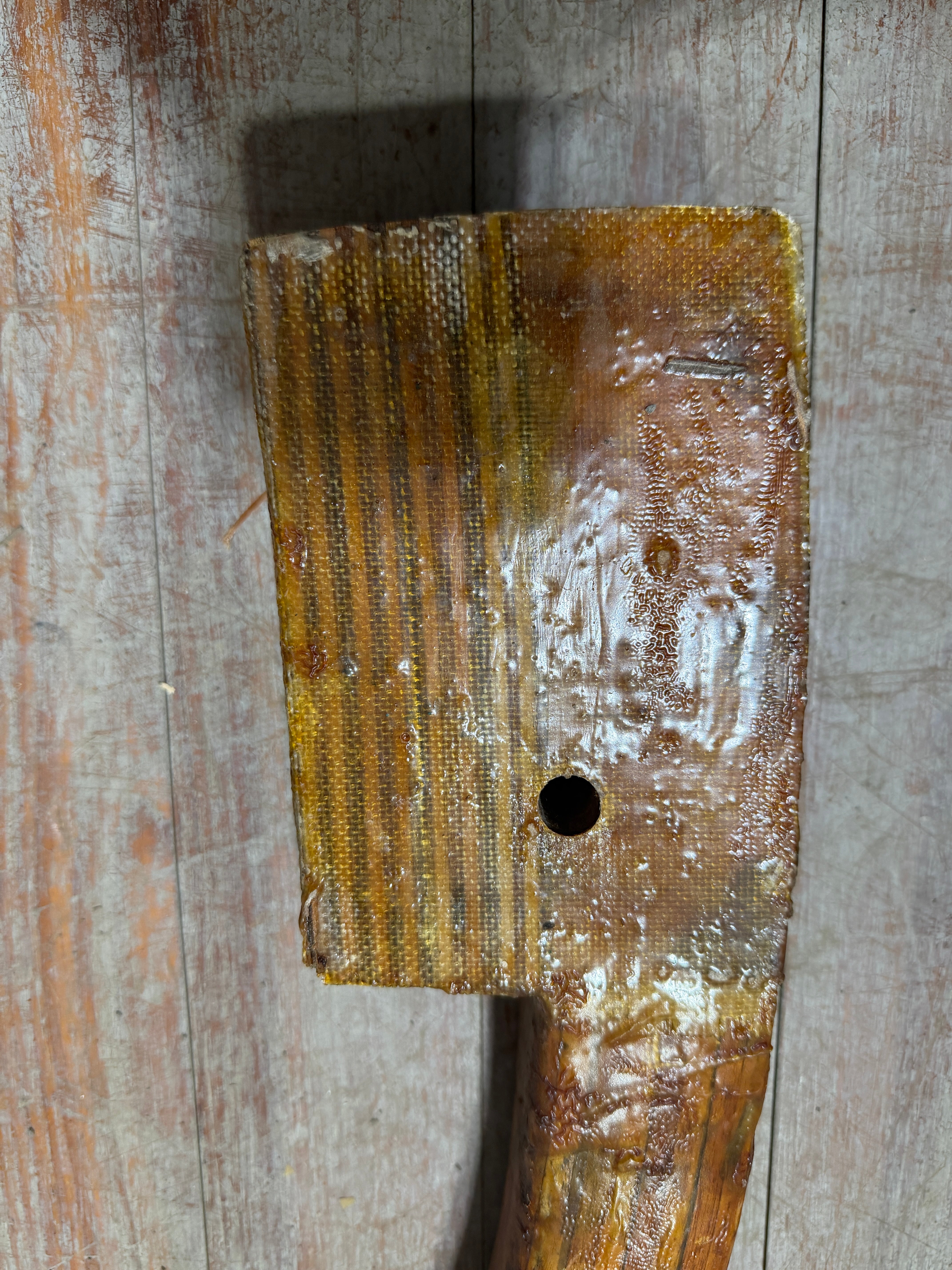 48" Curved Tiller Handle. Pretty good condition - the very top has some signs of use. The end has been resined. The base is 6 3/8" long x 4 3/8" wide x 2" thick. Removed off a pearson 25.