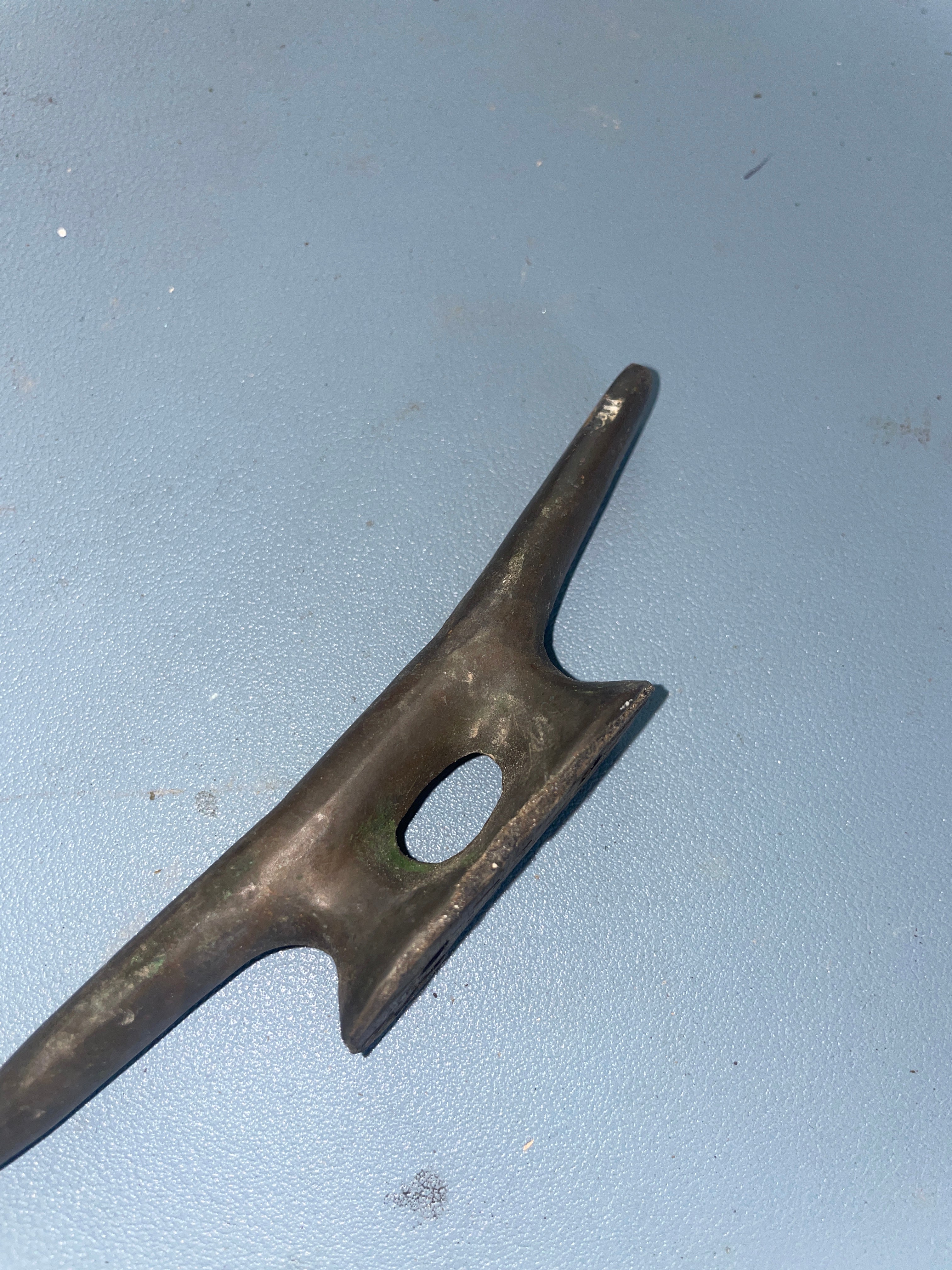This small bronze cleat is in great condition. It is 5" total length. The base is 2" long x 7/8" at the widest. The 2 through mounting is 1" apart. This cleat stands 1" tall. Fits 1/2" line diameter.