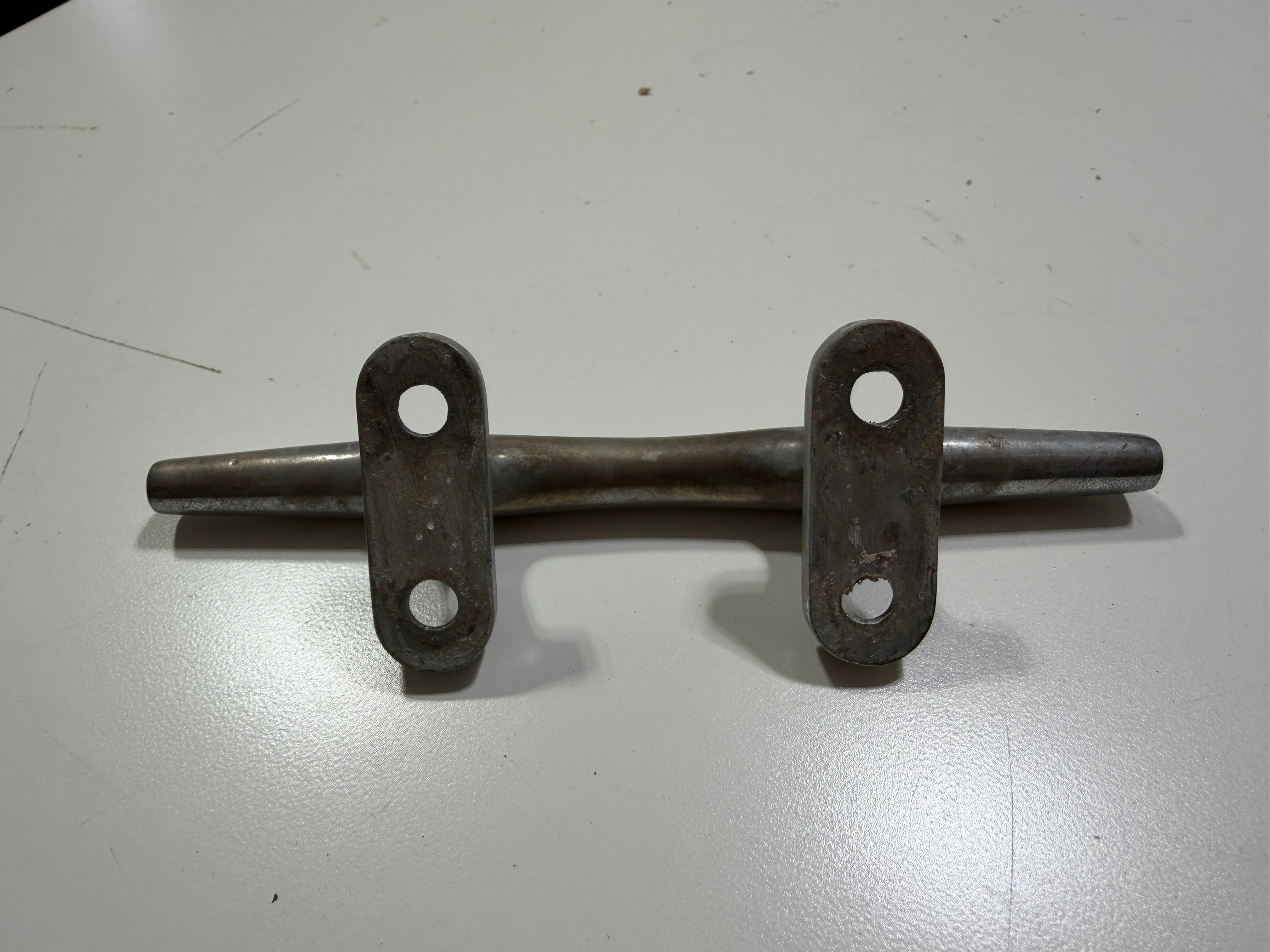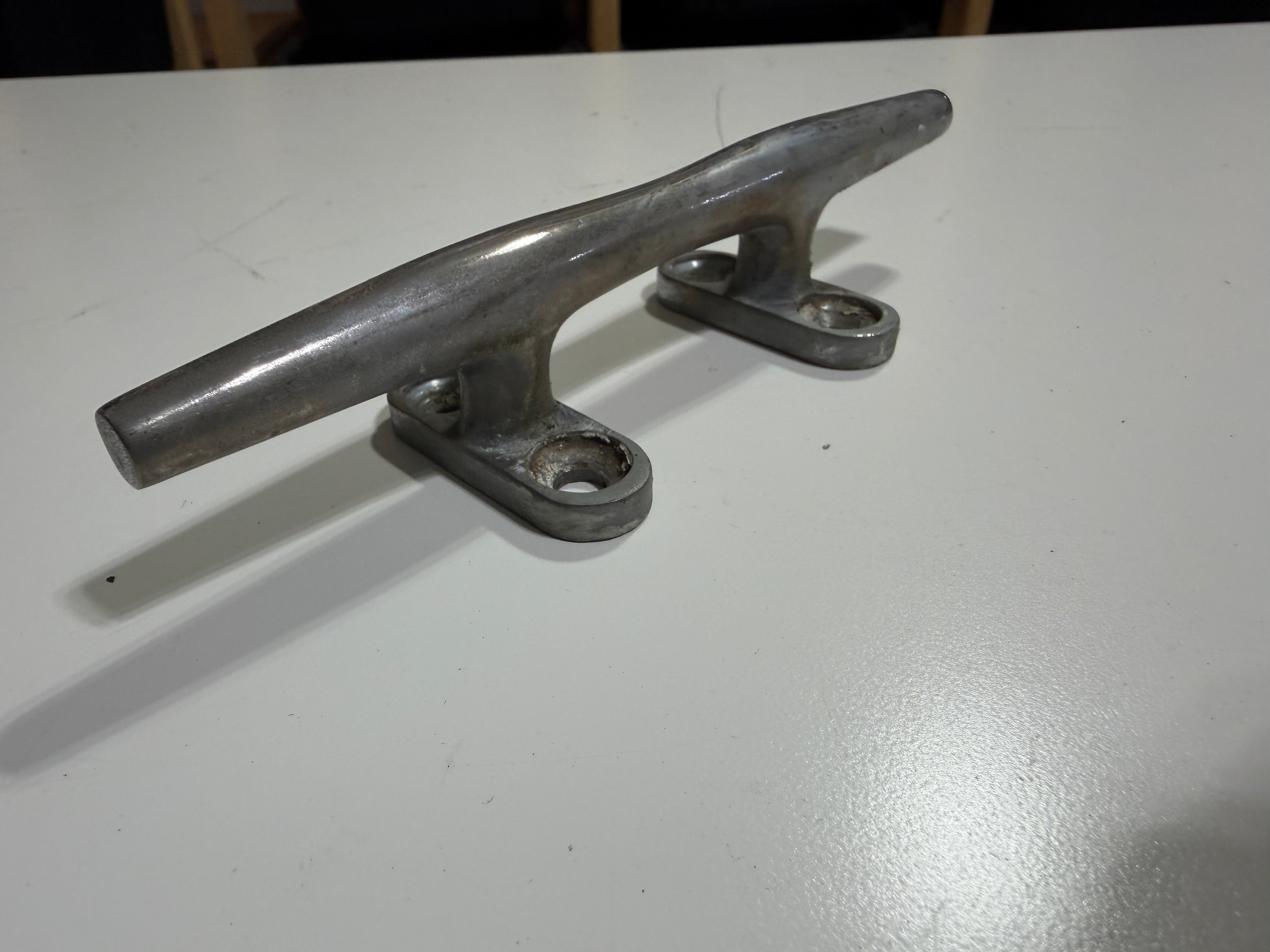 6" in length. 2 feet mounting. The feet measure 1 7/8" long x 5/8" wide each. The mounting holes are 1/4" diameter. They are 1" wide (same foot) x 2 1/4" wide (to the other foot). Width at the feet is 1 5/8" and the cleat stands 1 1/4" tall.