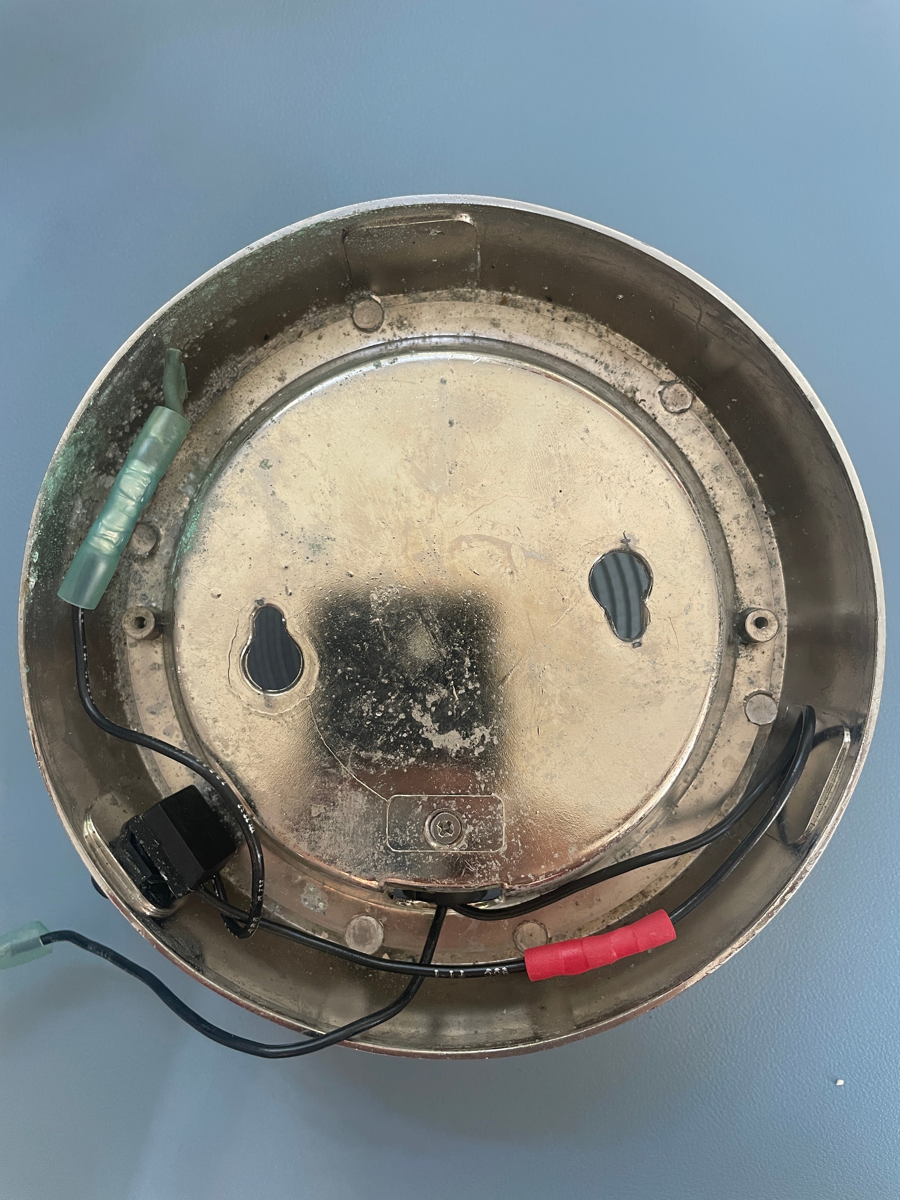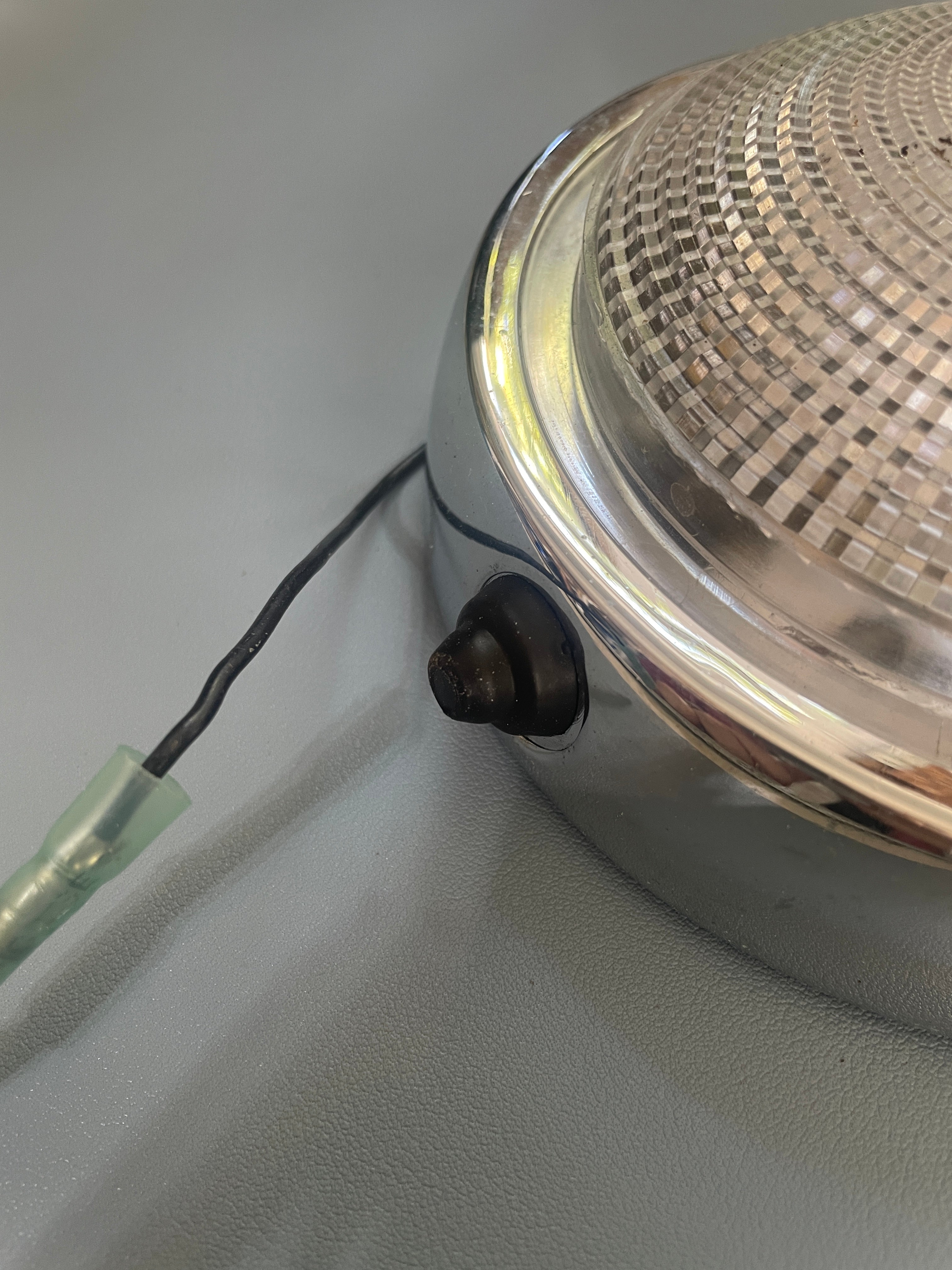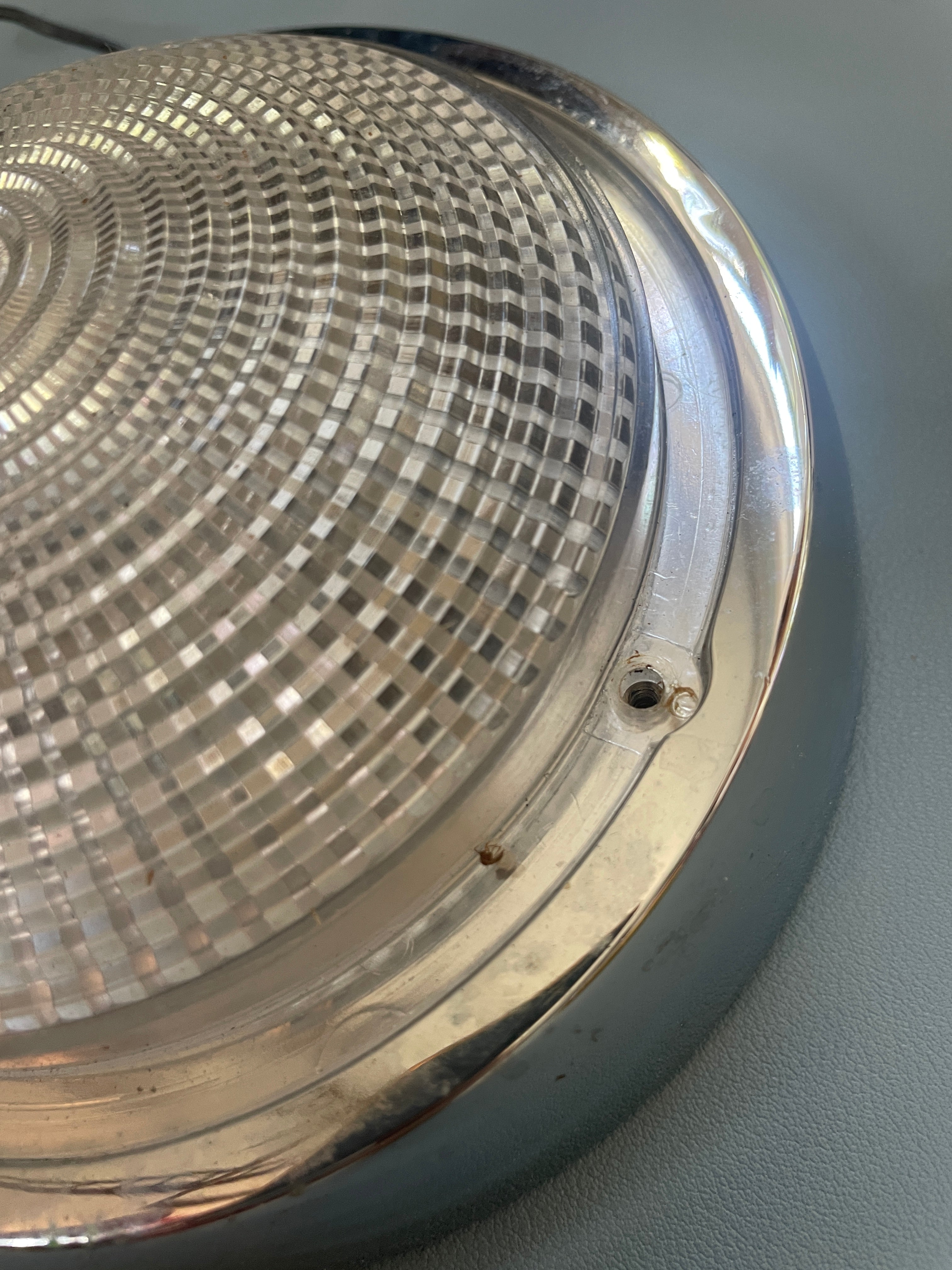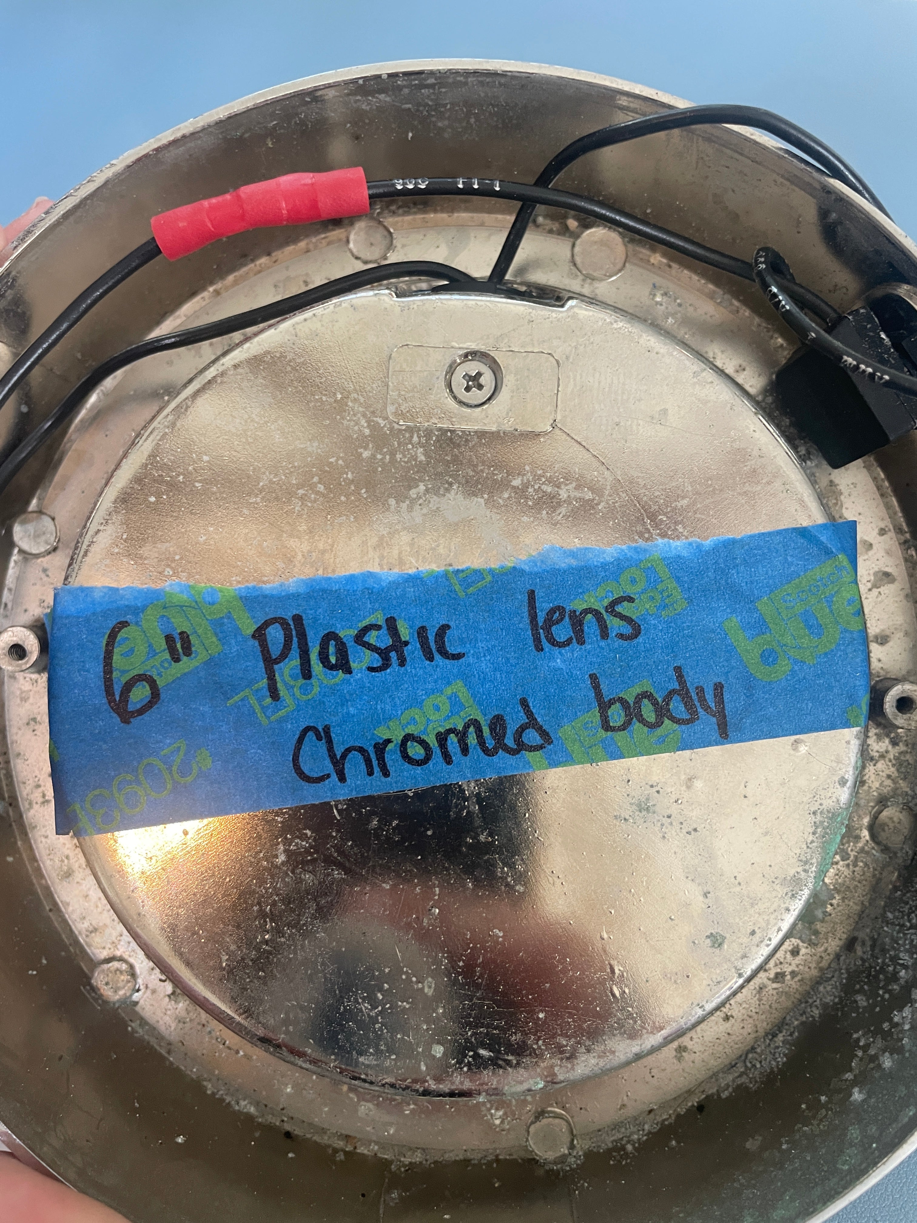 This is a chromed body (might be stainless and just pitting weird) and the lens is plastic. This light is 6" diameter with a push button. 2 wire install. Might be missing some screws.