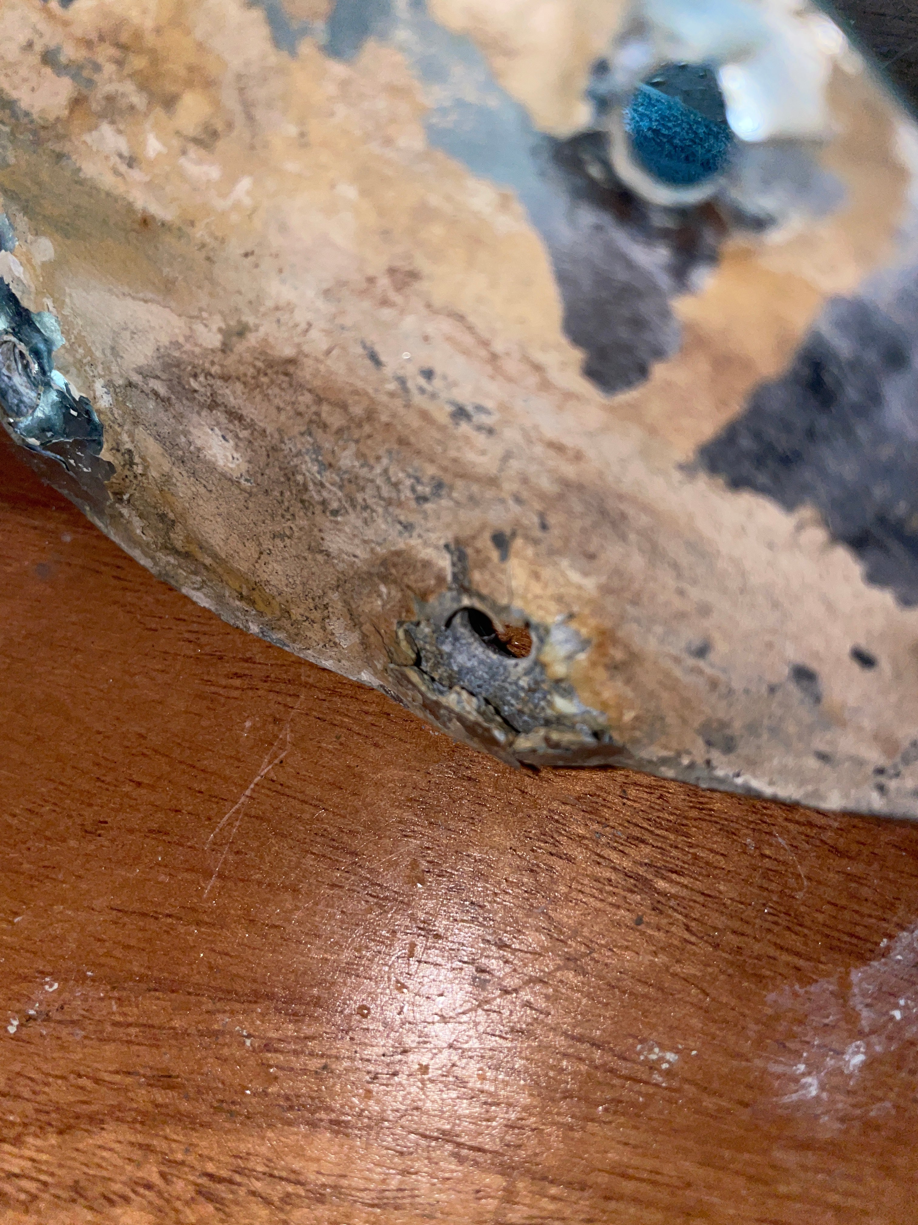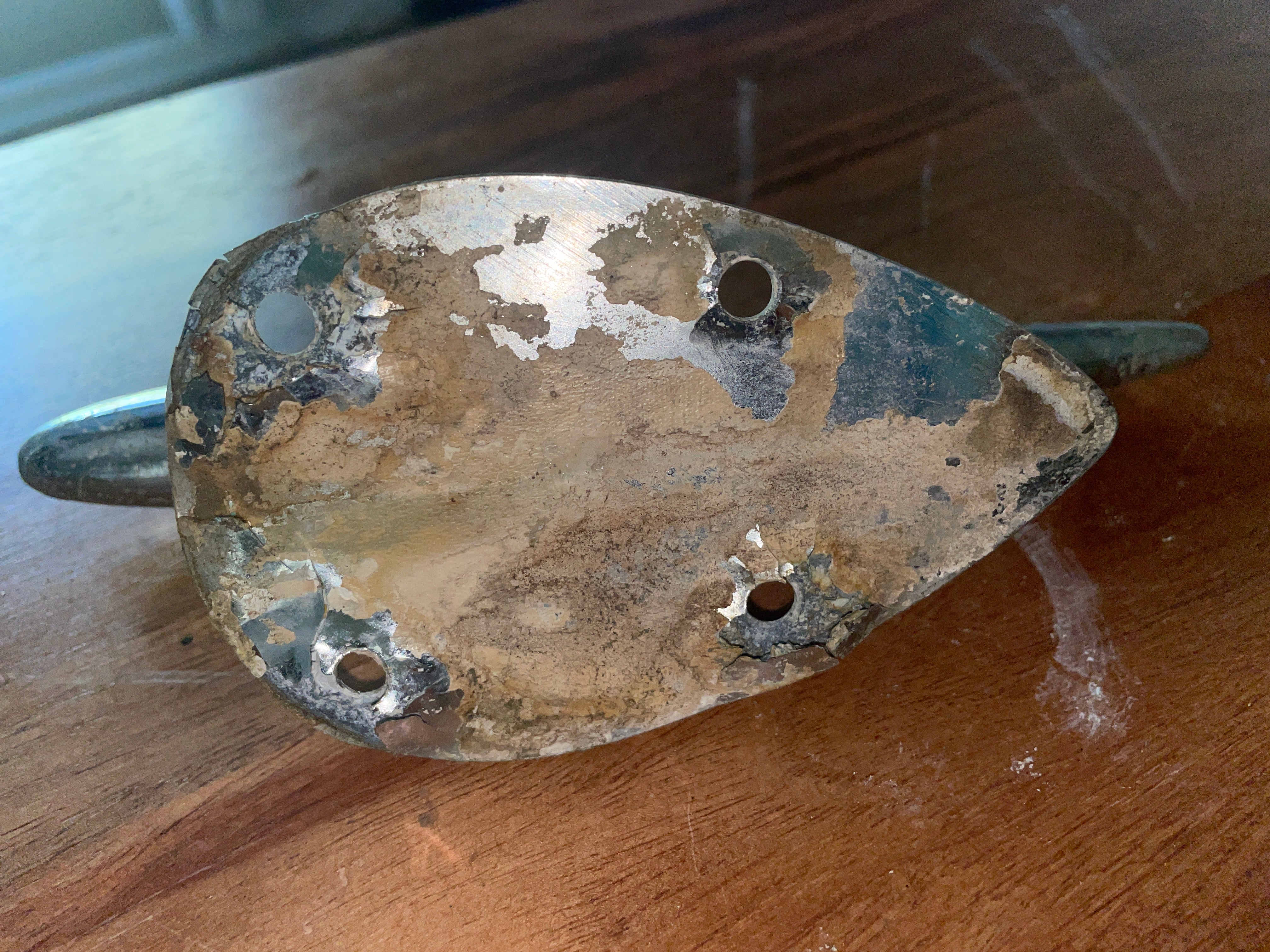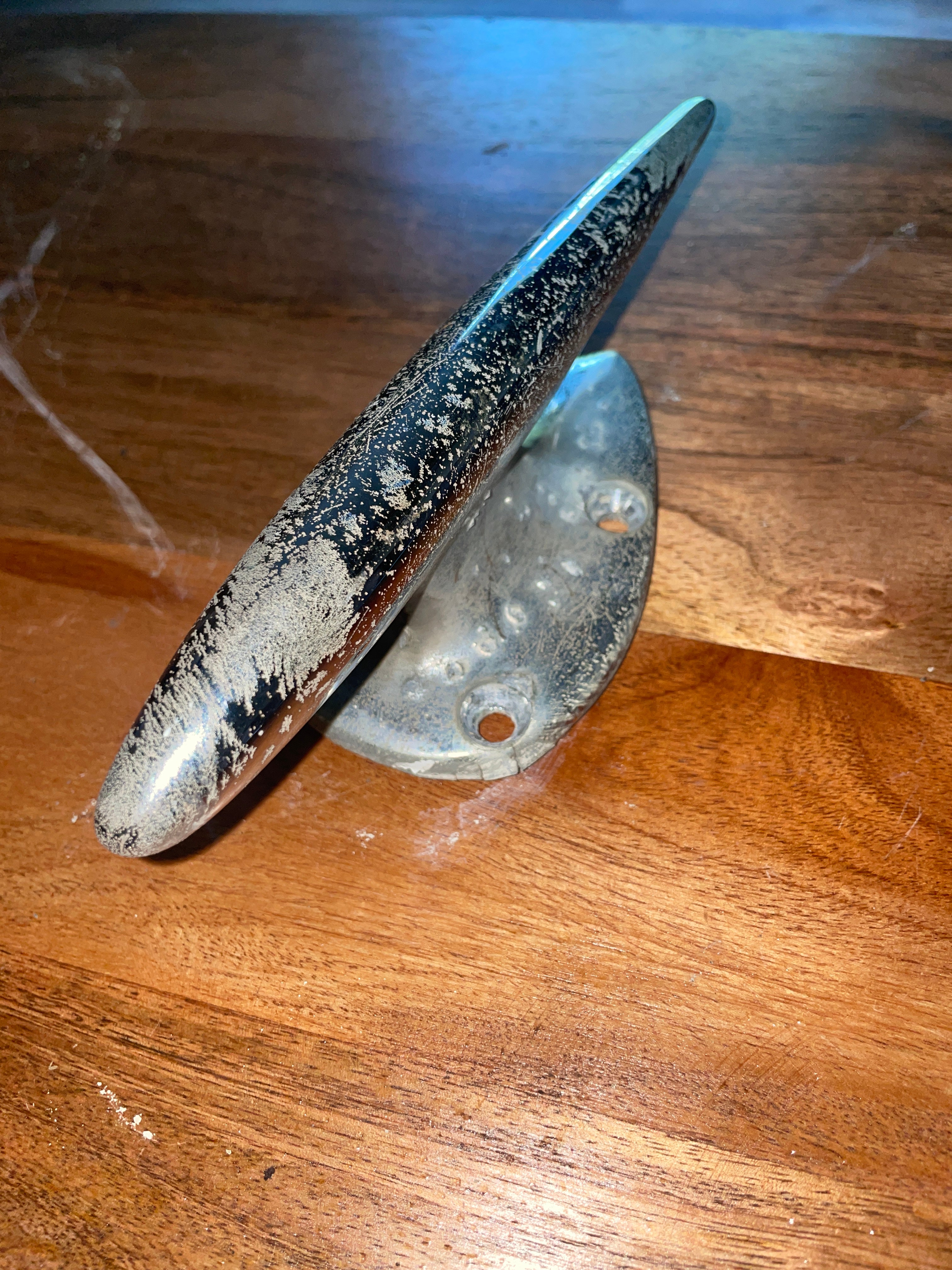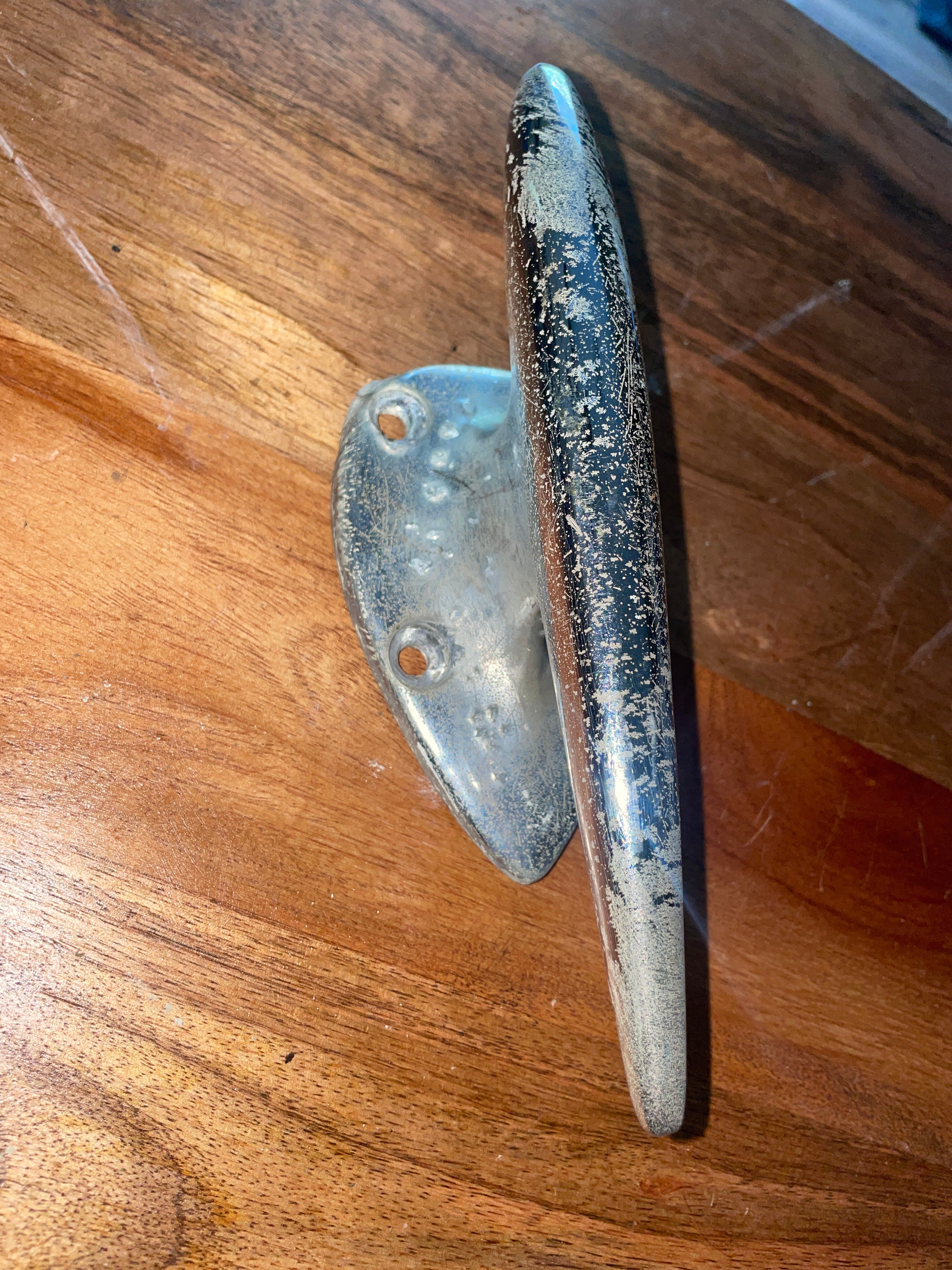 This chromed bronze torpedo cleat is in fair condition. The chrome is starting to pit rather badly, would highly recommend removing and it would be a beautiful bronze! This cleat is 7 1/2” total length. The base is 4 1/2” long x 2 3/4” wide. 4 screw install that is 2” long x 1 1/2” wide. Stands 2 1/2” tall.