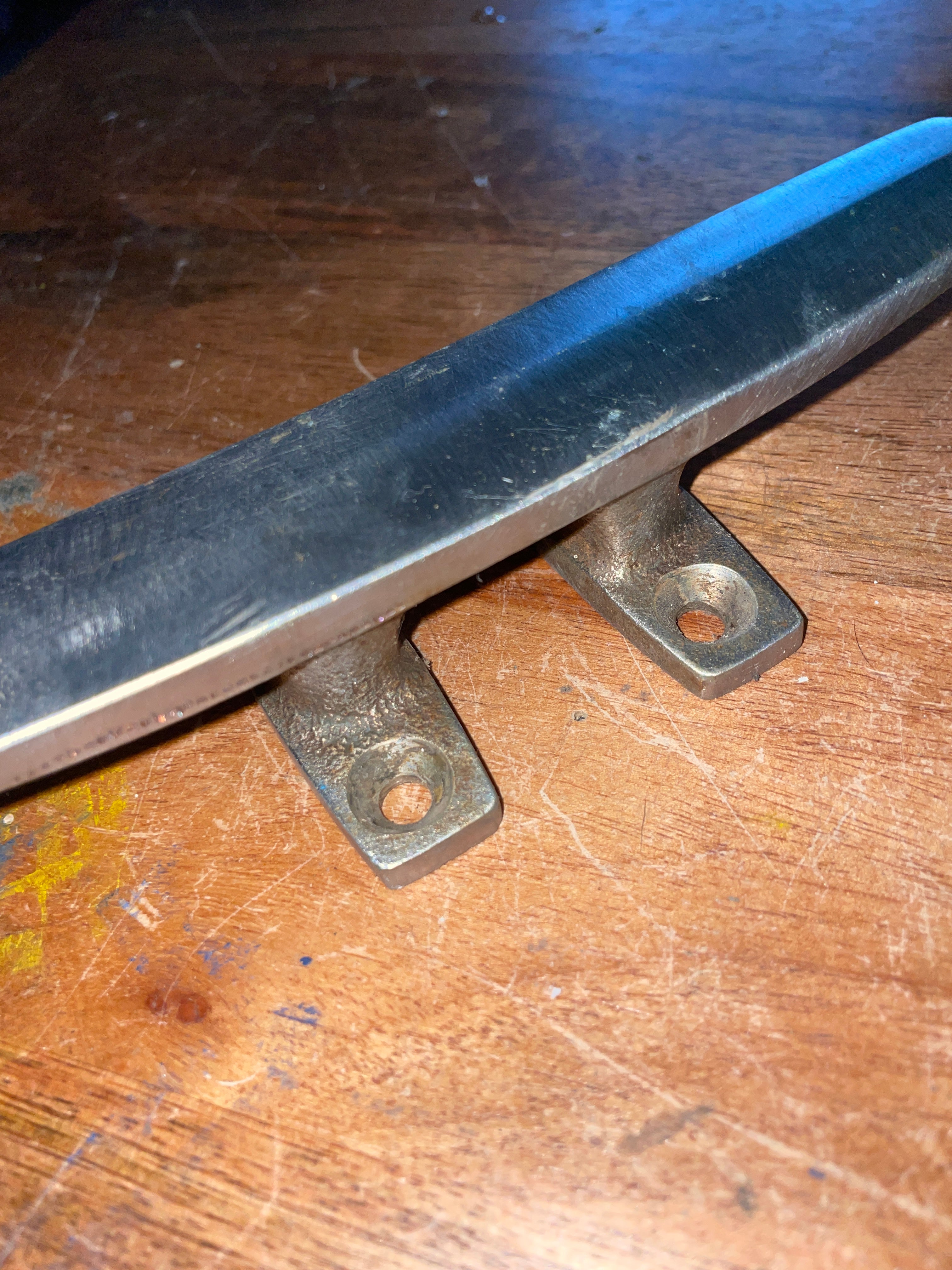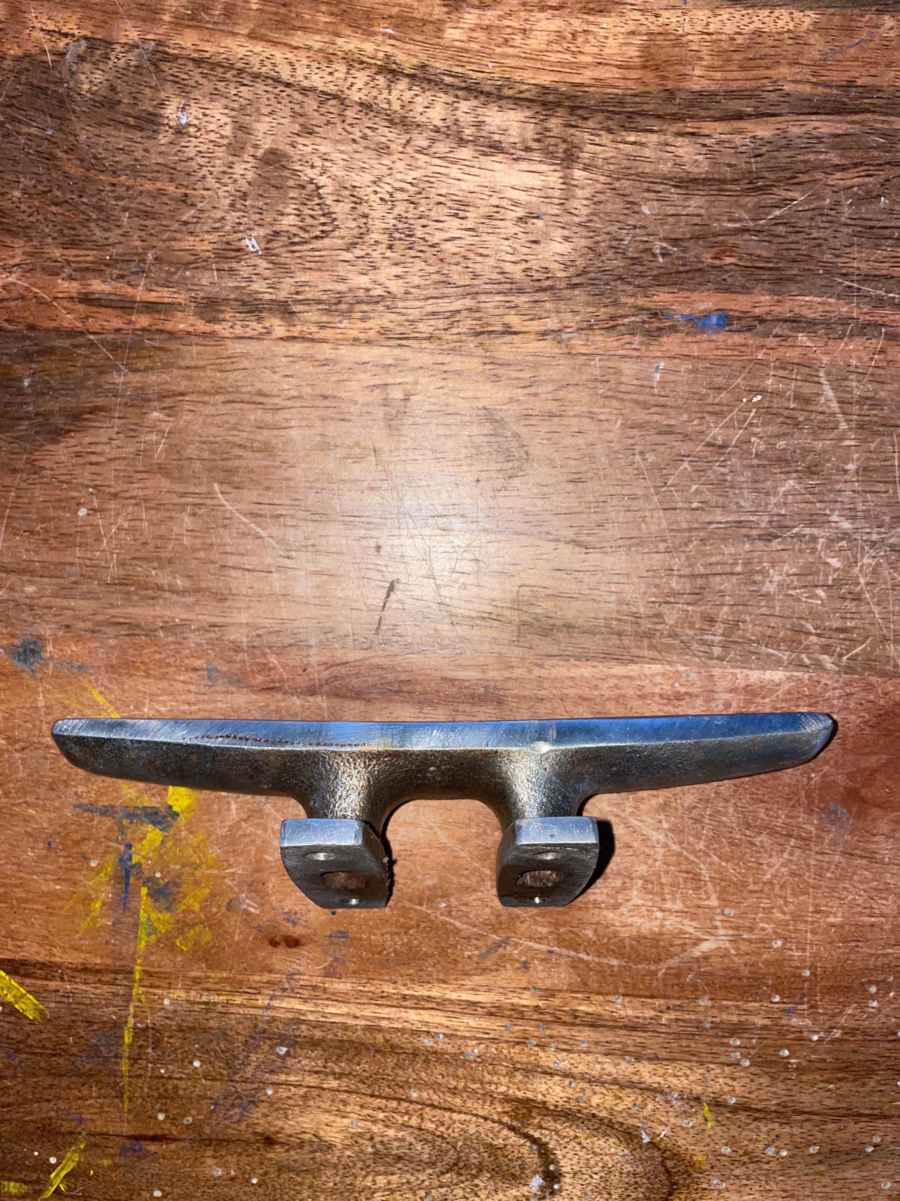 This 7” cast stainless hollow cleat is in great condition. The cleat is 7” total length. It has 2 feet, each foot has 2 screw install. The feet measures 2 1/2” long x 7/8” wide. The mounting is 1 3/4” apart. This cleat stands 1 1/4” tall. Width for line is 7/8” diameter. It does not look to be solid stainless steel, has odd riveting bottom so I do think it is cast stainless.
