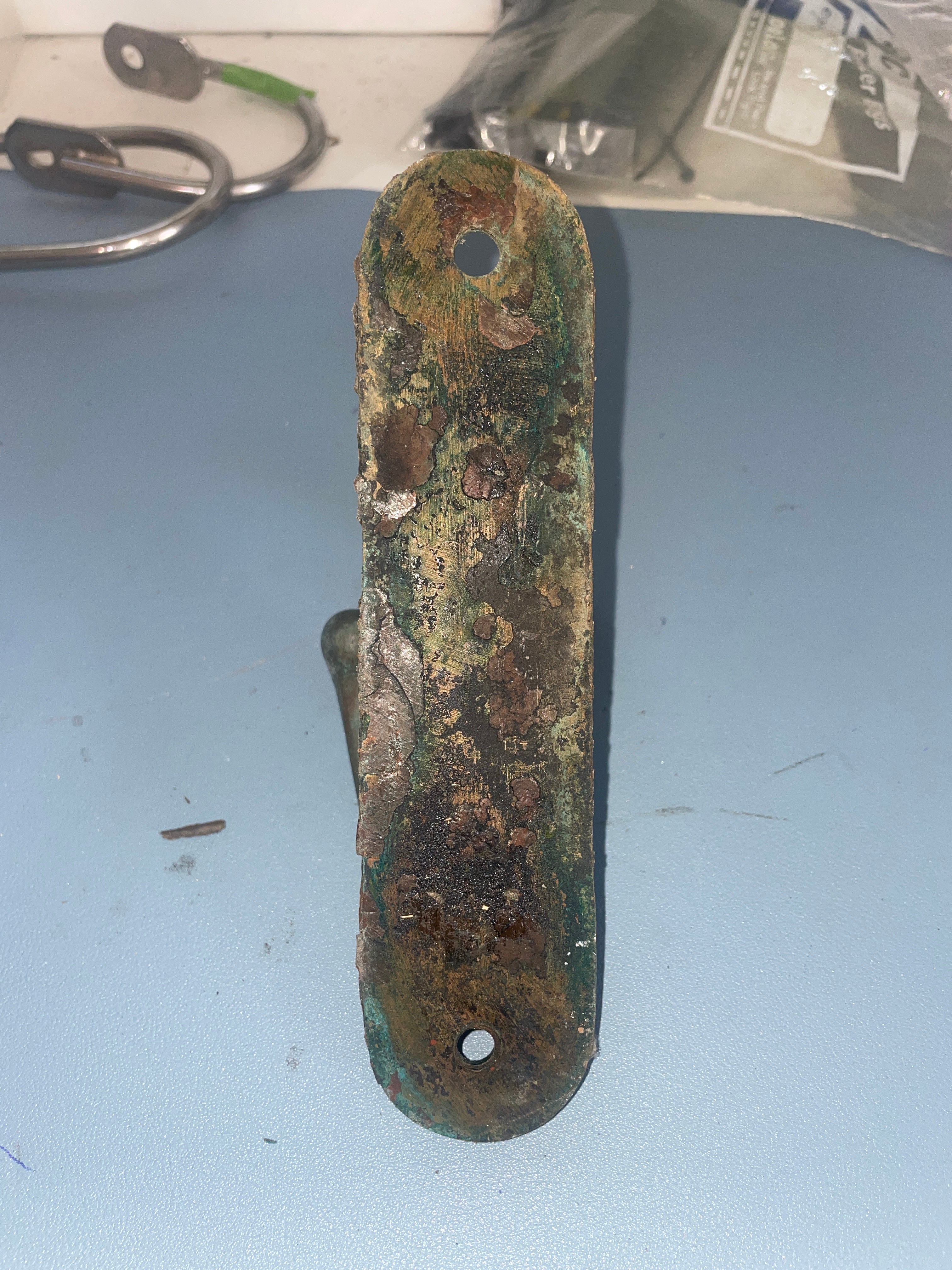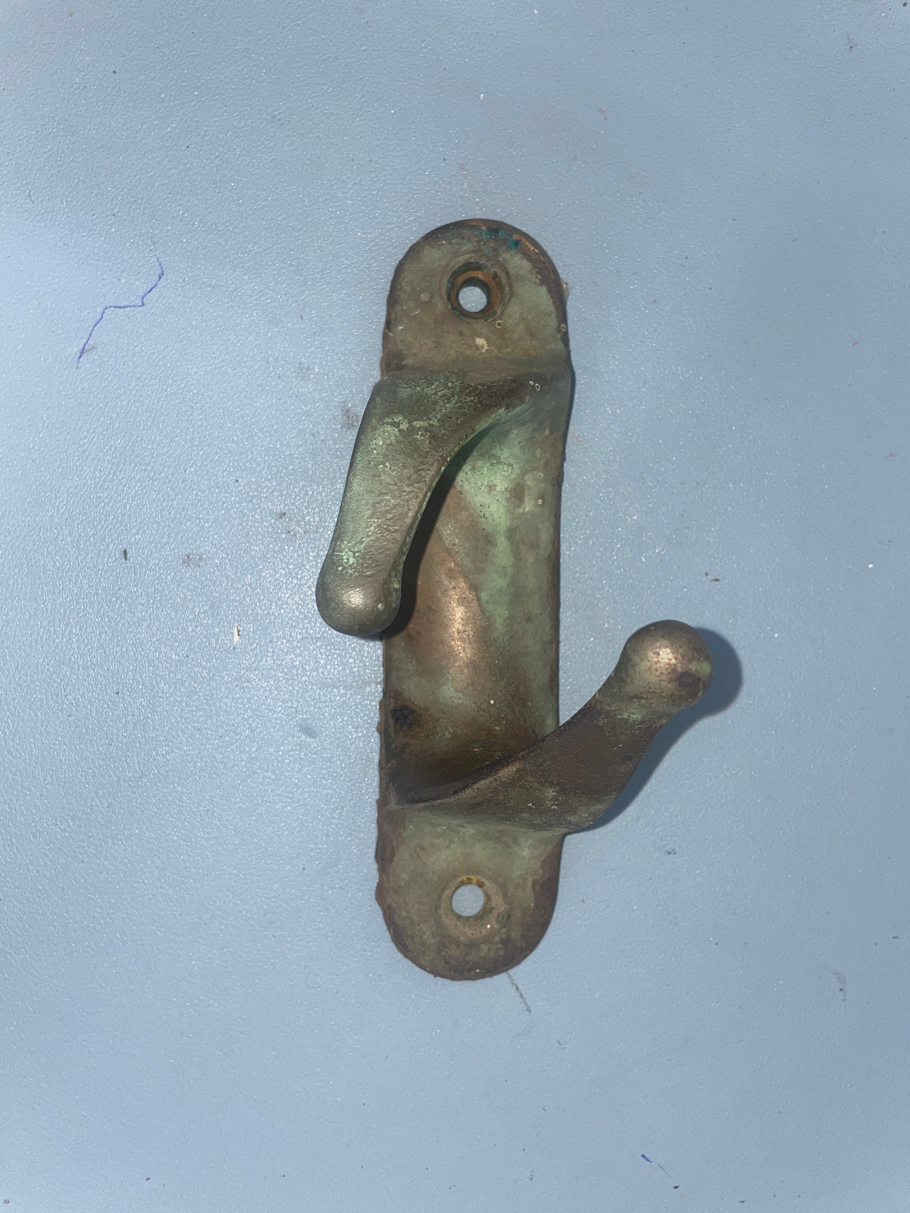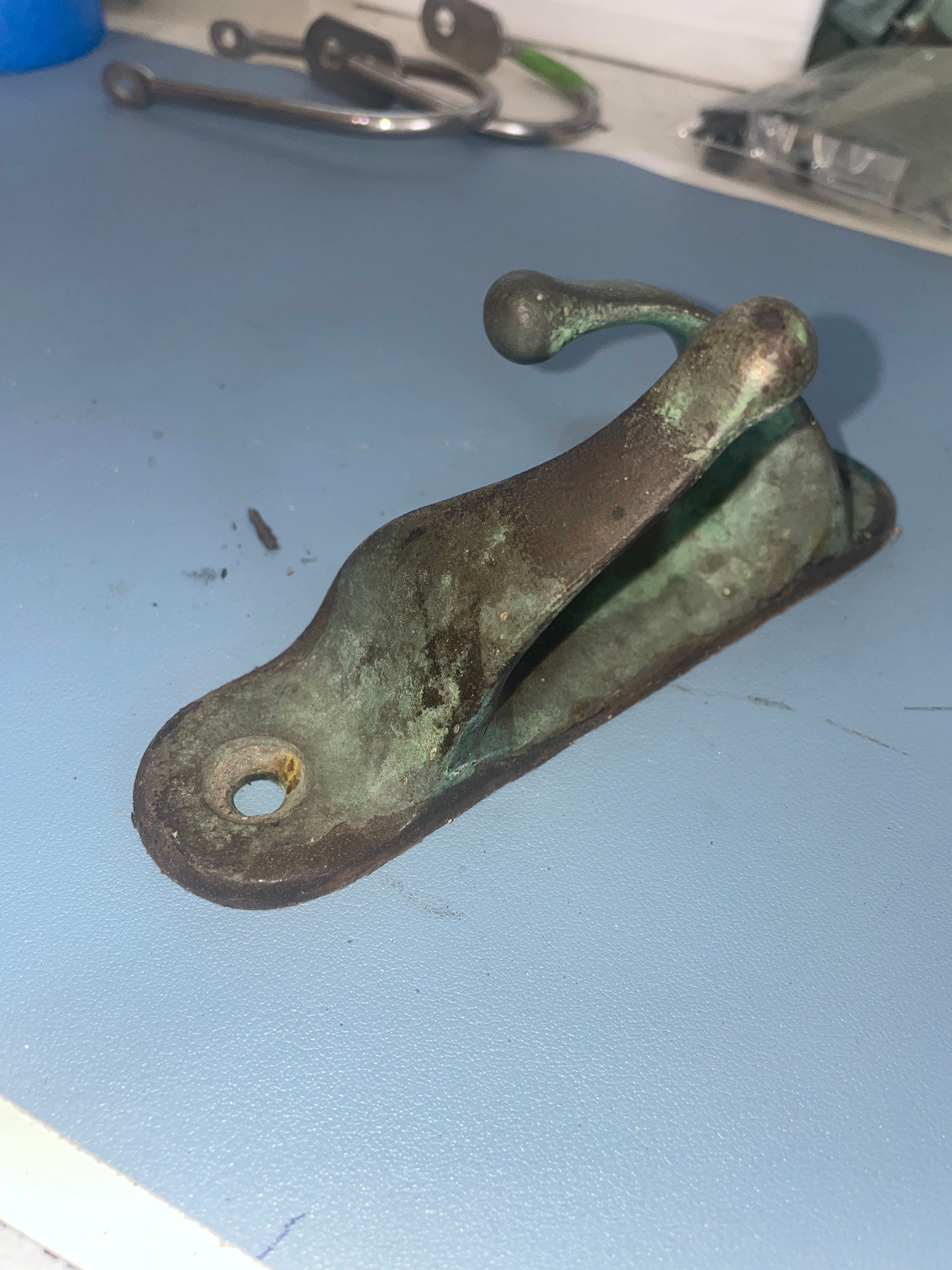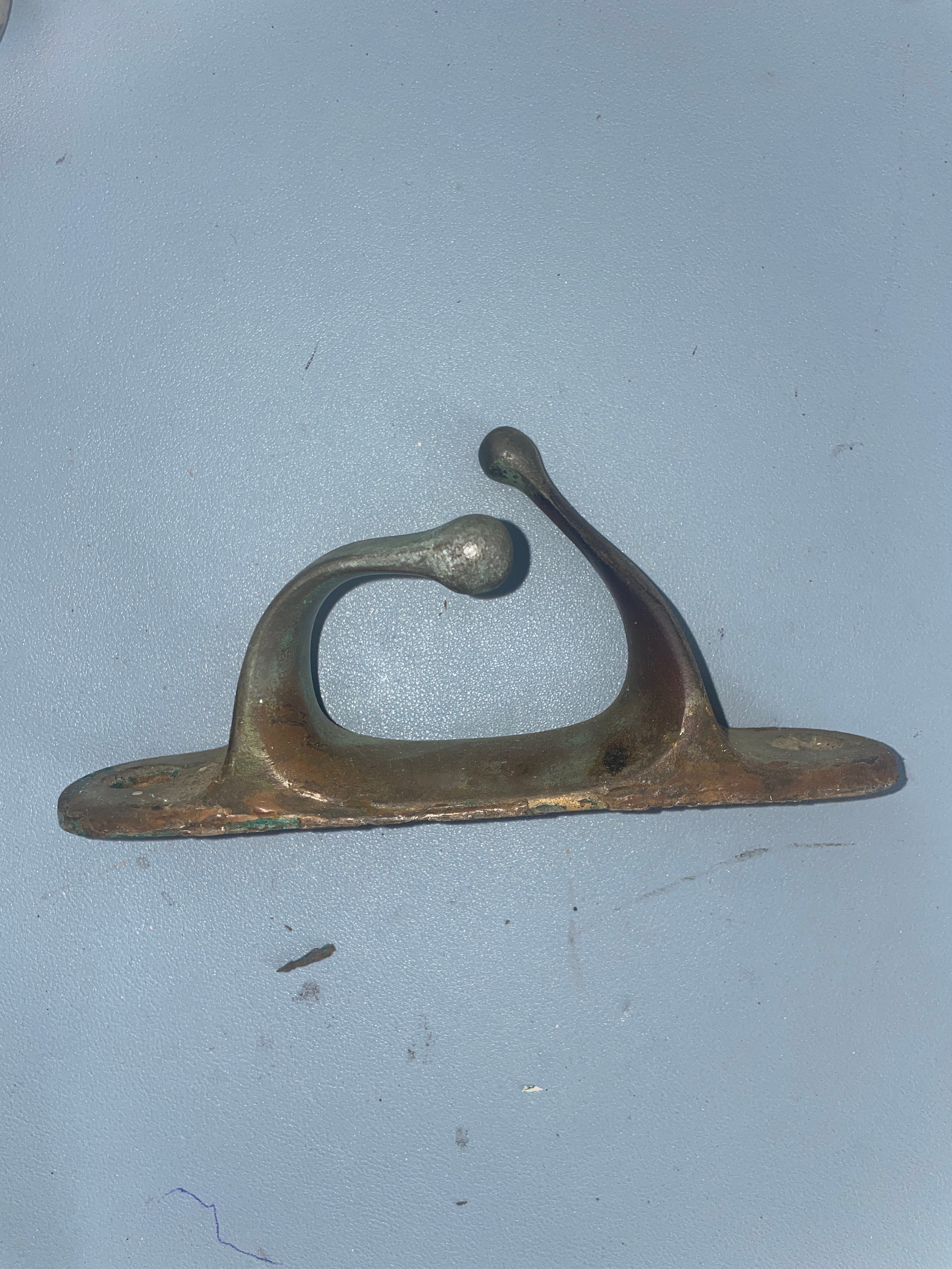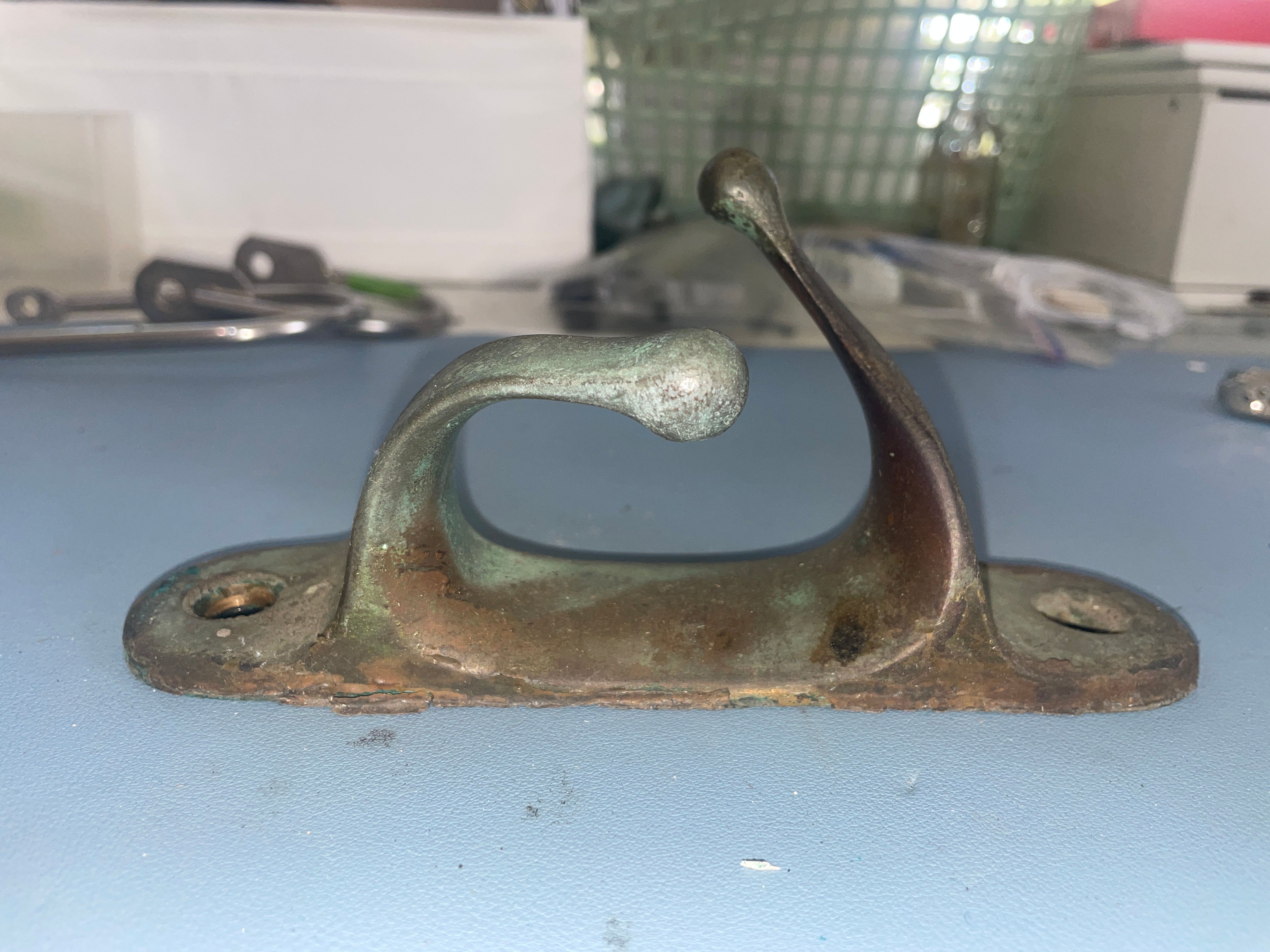 This 7" starboard side skeene cleat is in good condition. It was removed off the 1934 Eisenhower 50'. This cleat has a rather large opening for line - 1 1/2". The one side looks "bent" but both cleats available are identical in that look. The base of the cleat is 1 5/8". Stands 3" tall.