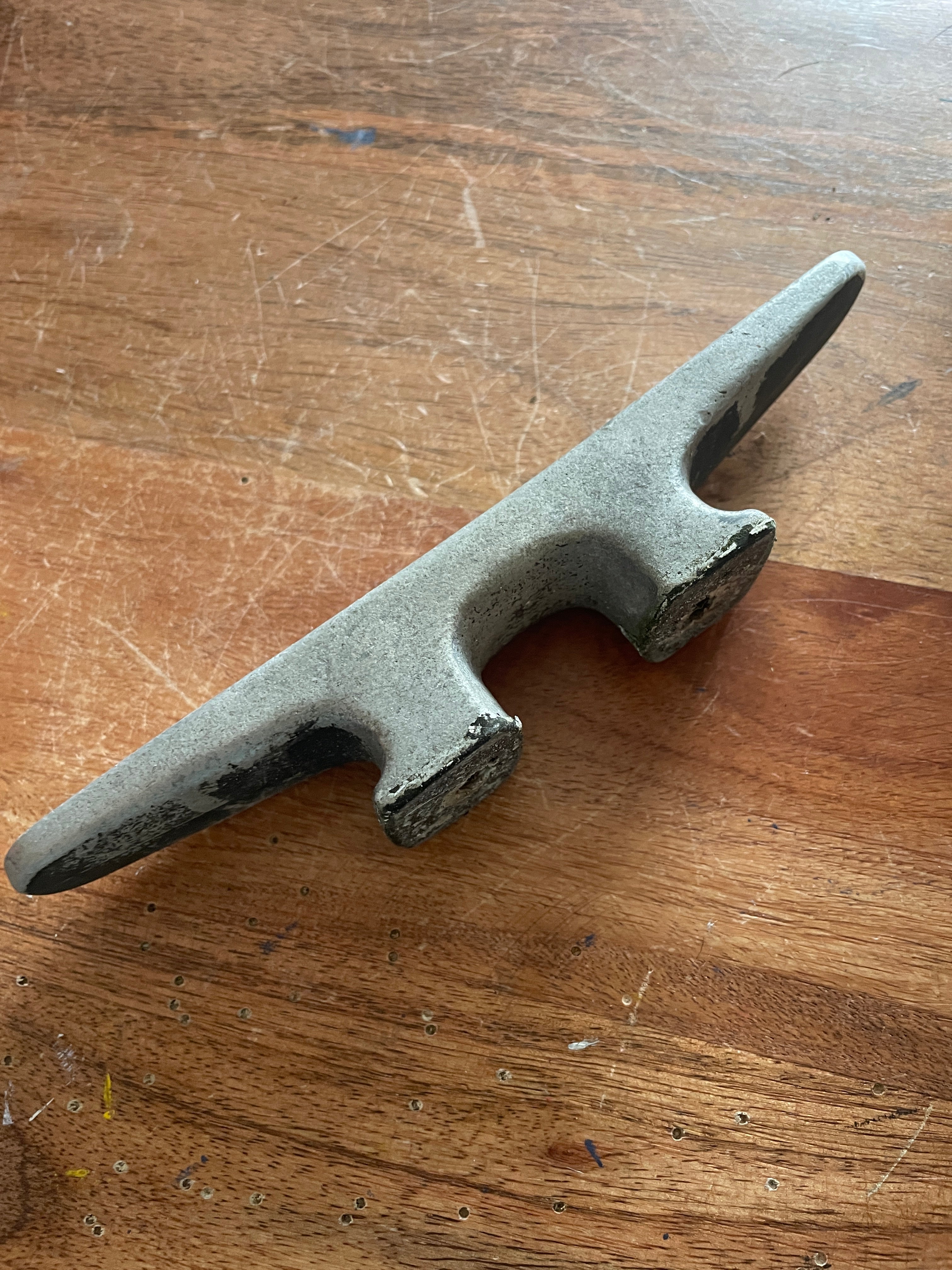 This aluminum cleat is in good condition. Has the usual scratching from use. It is 7” total length. 2 through bolt install that is 1 7/8” apart. Stands 1 1/4” tall.