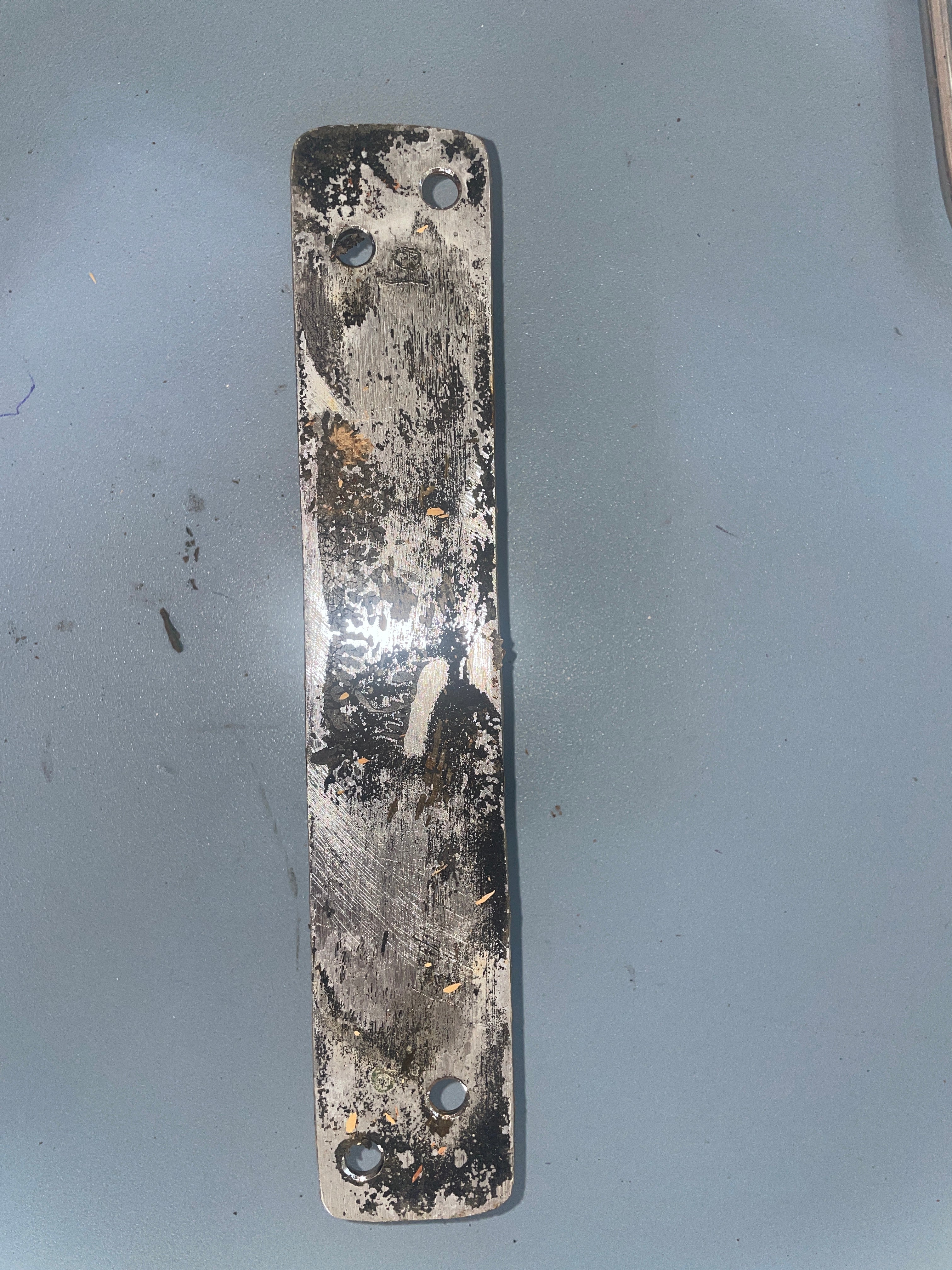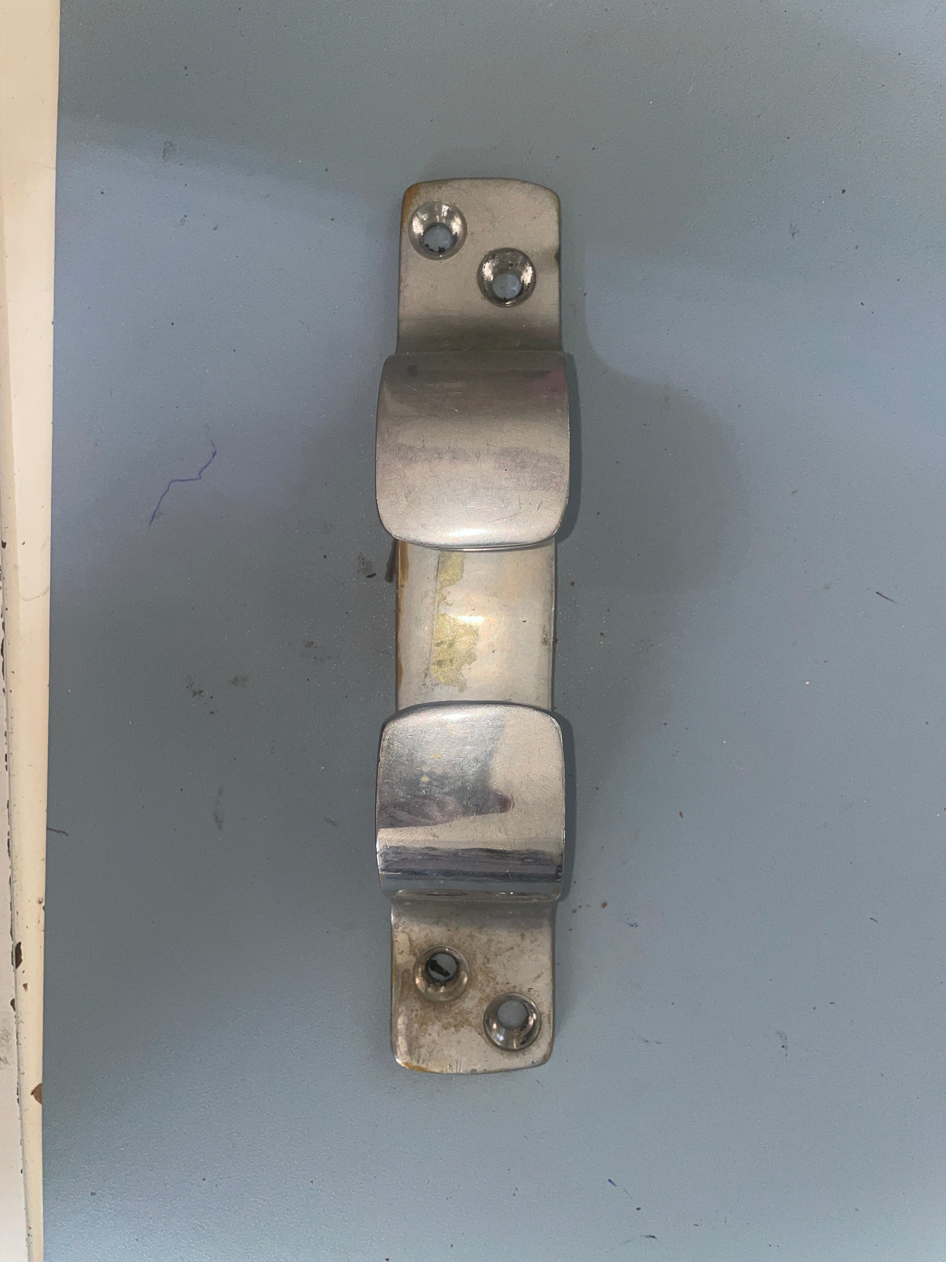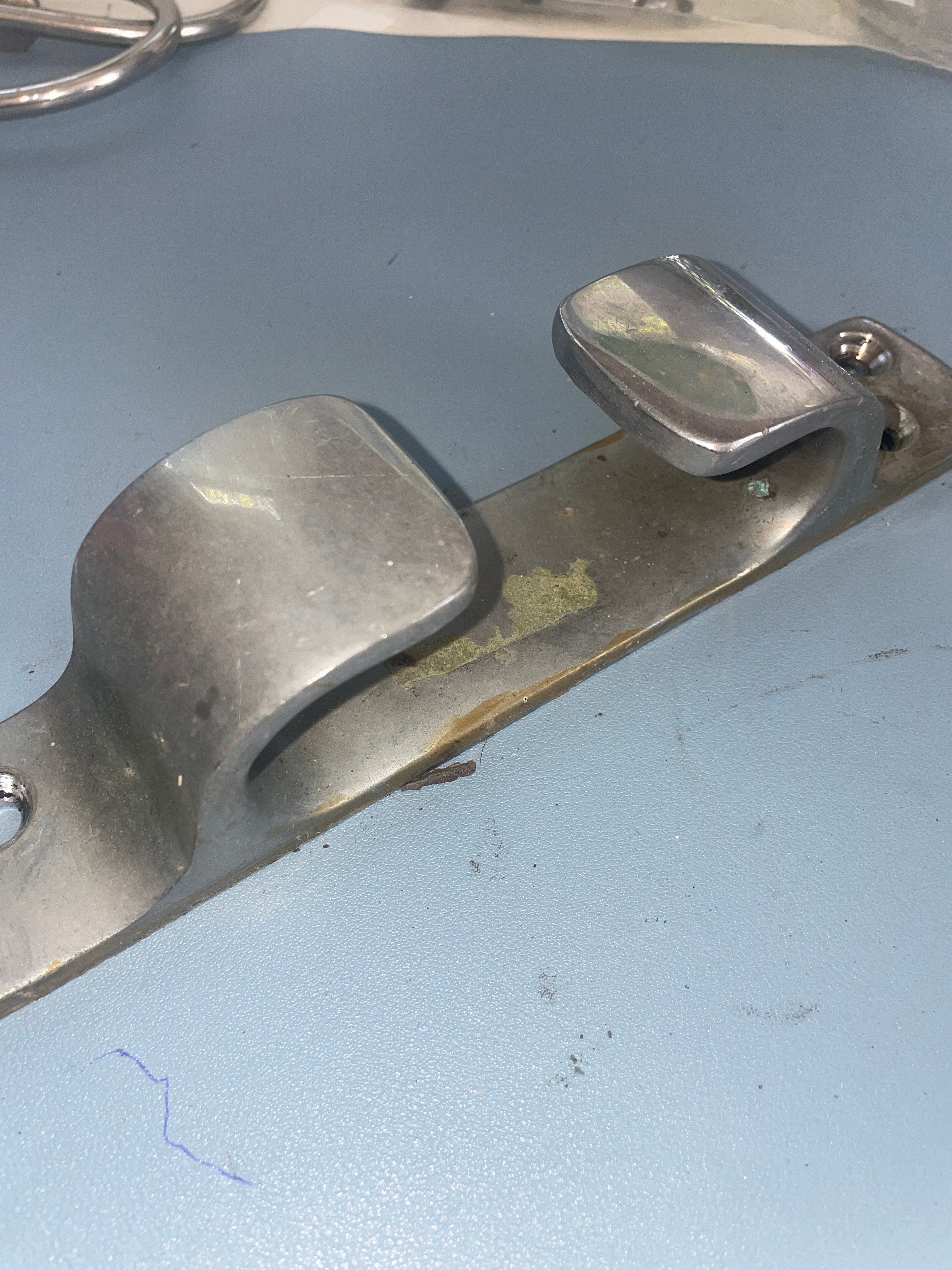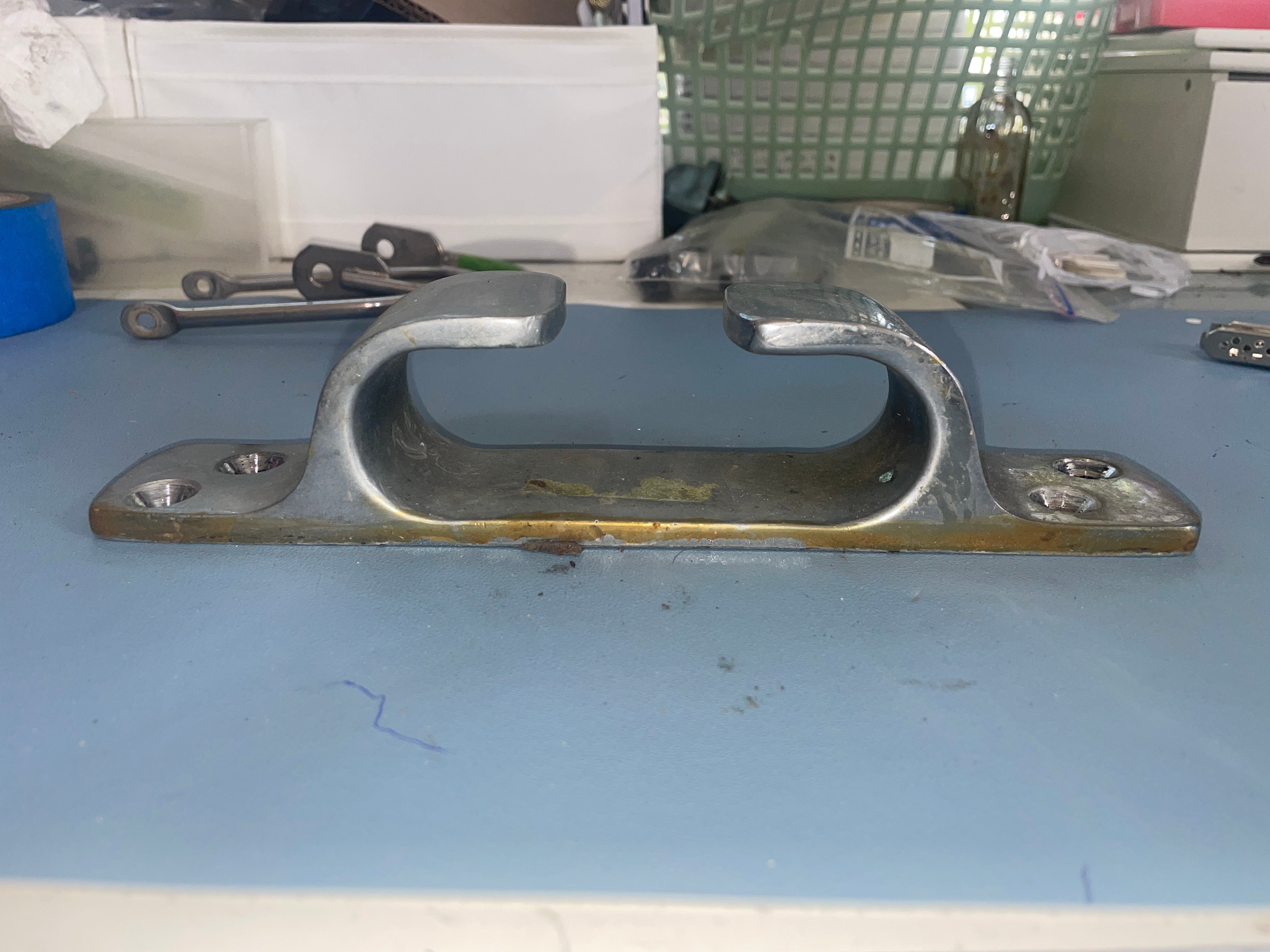 This chromed bronze open clock cleat is in great condition. It measures 9 3/4" total length. The cleat has a 1 3/8" width for line. The base of the cleat is 1 3/4" wide with 4 total holes for mounting. Stands 2 1/8" tall.