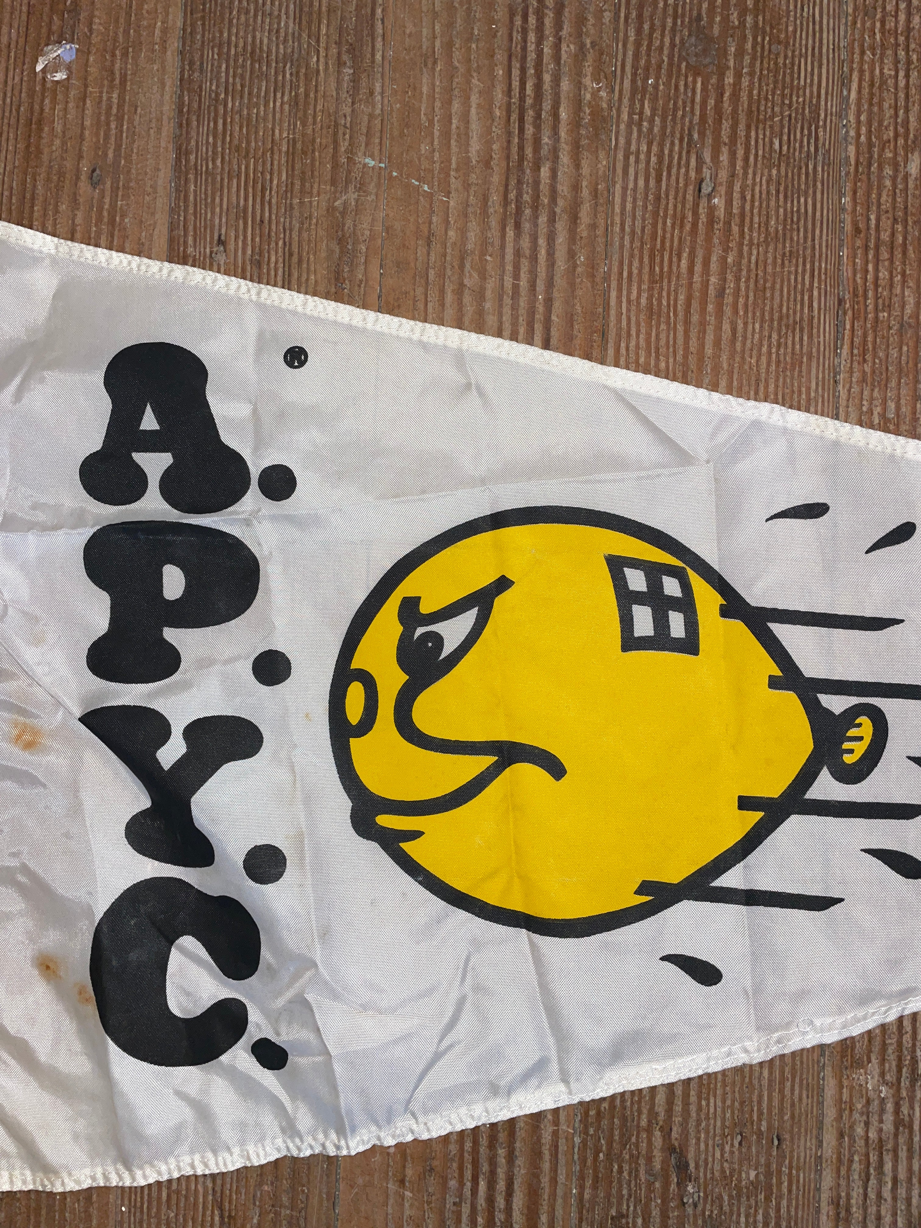 Good Condition A.P.Y.C. Flag. Has Small Rust Spots Shown In Photo But Other That It’s In Good Shape. It Measures 26” Long x 15” Widest x 3” Smallest Width.