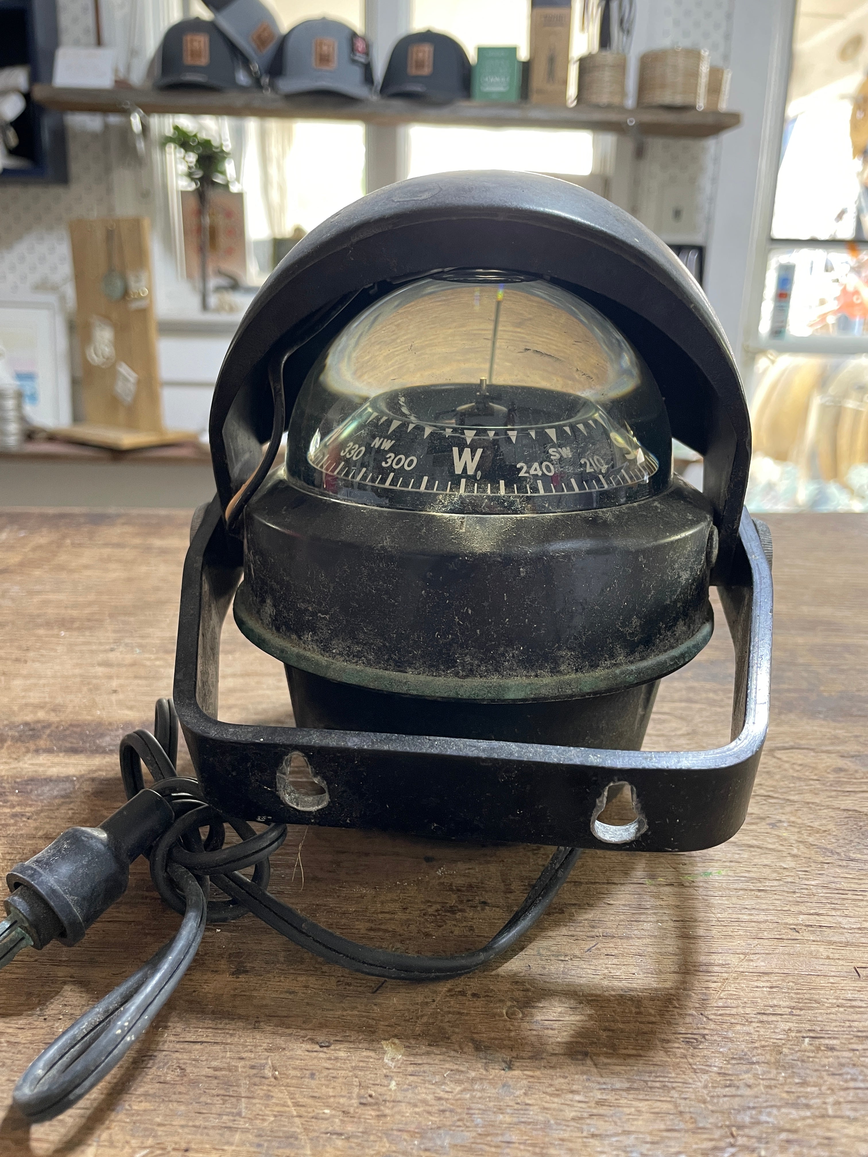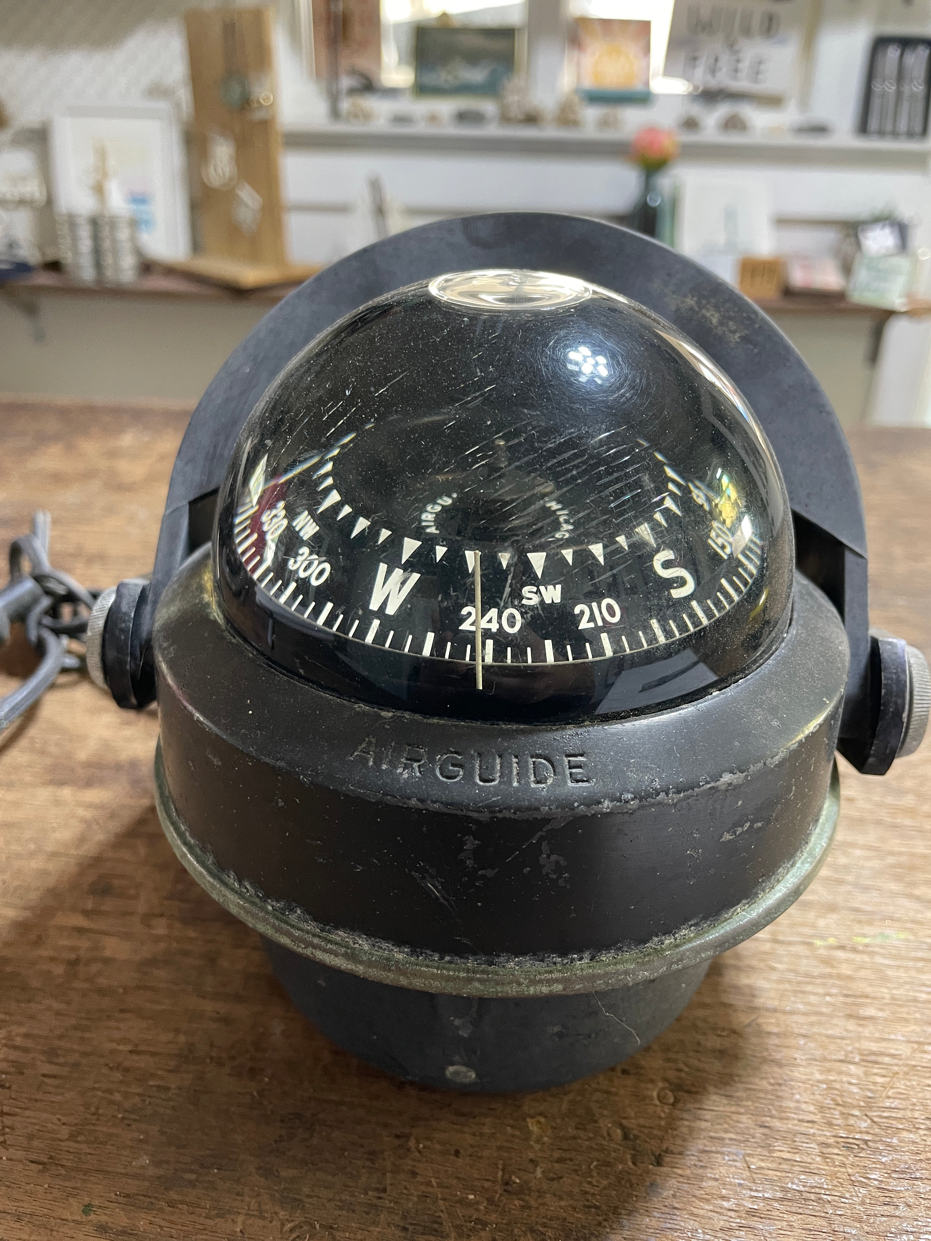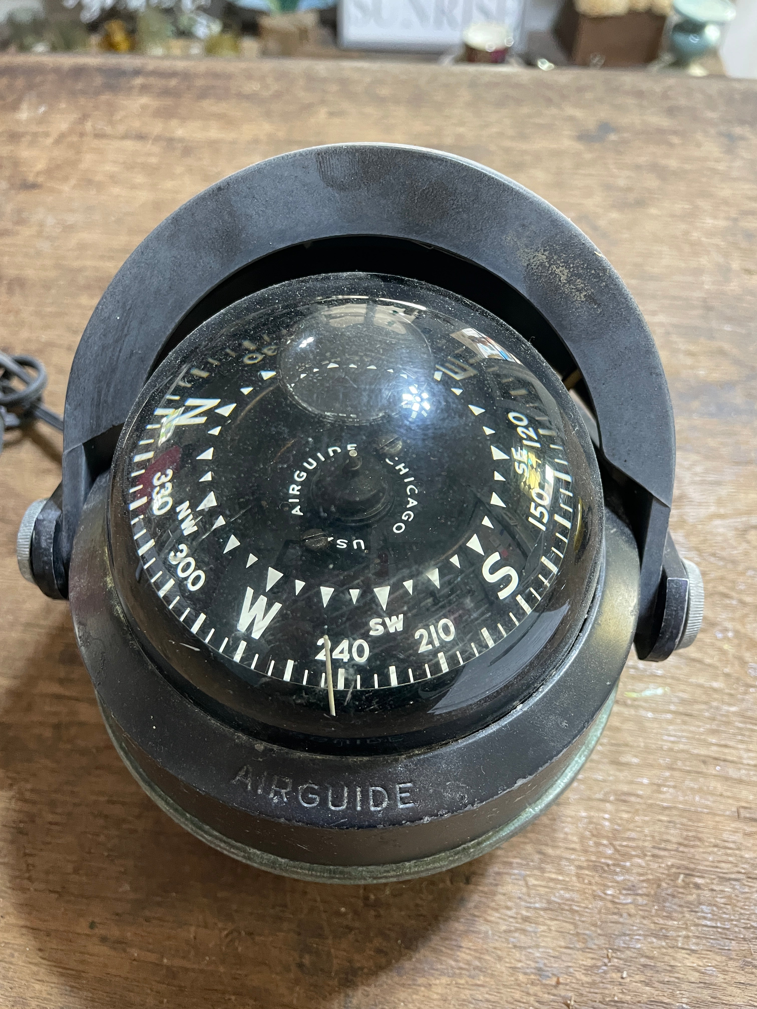 This is an air guide compass, unsure the exact model. The compass overall diameter is 5". The compass base is 3 7/8" diameter. It has the light attached with the plug - it is untested. The mounting bracket is steel, the 2 mounting holes are 2 1/2" apart. This compass Stands 5 1/2" tall. There is 1 small bubble at the very top of the compass liquid and there are scratches to the plastic dome.