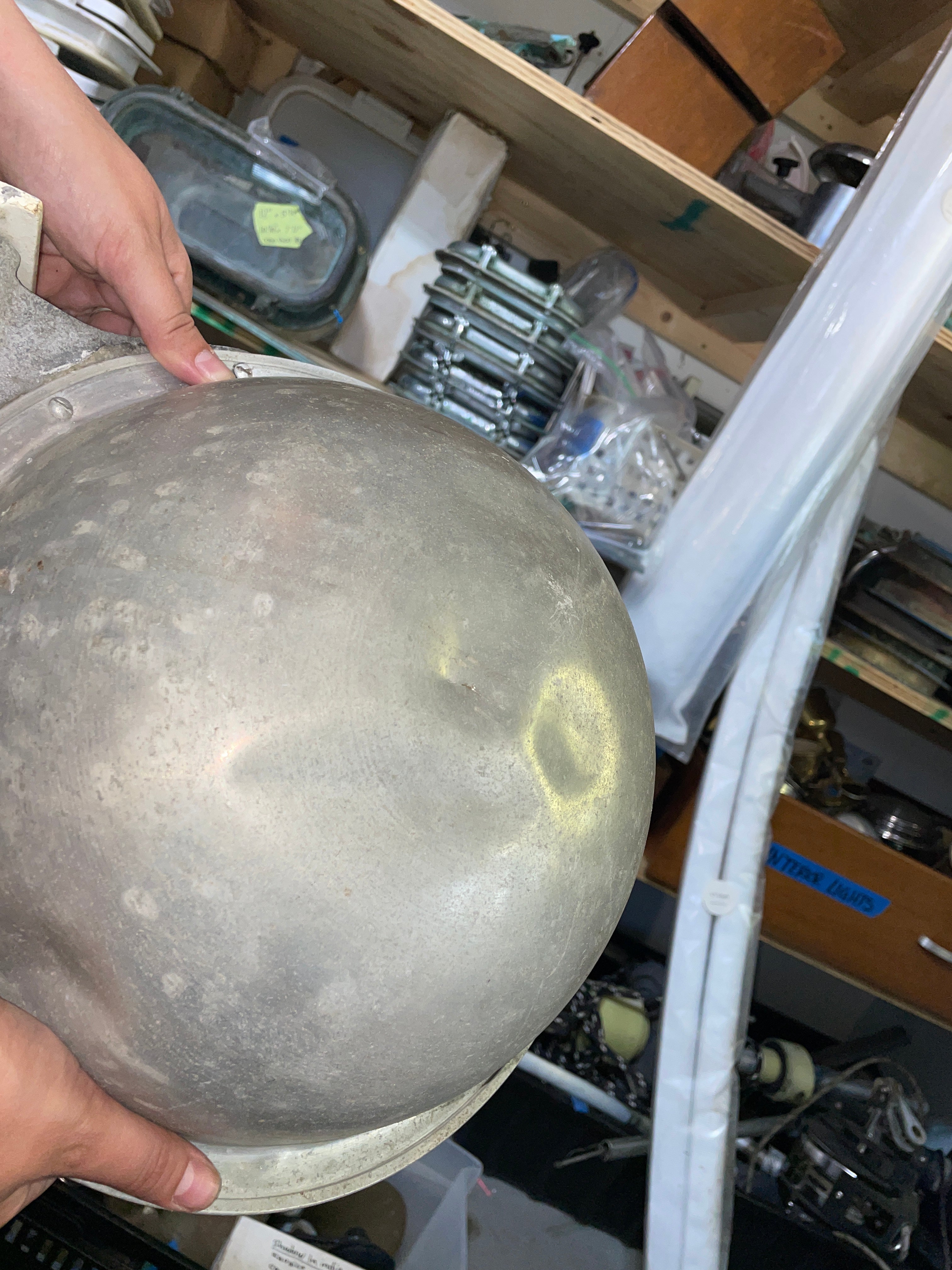 This aluminum folding sink is in excellent condition. It is 12” diameter. The backing is 9 3/8” long x 6 1/2” wide. Has 3 screws in the back that are 3 5/8” apart. Sink has very minimal dents and dings. Would clean up nicely. When mounted the sink will stick out 14 1/2”. This sink is great because it will fold up and out of the way.