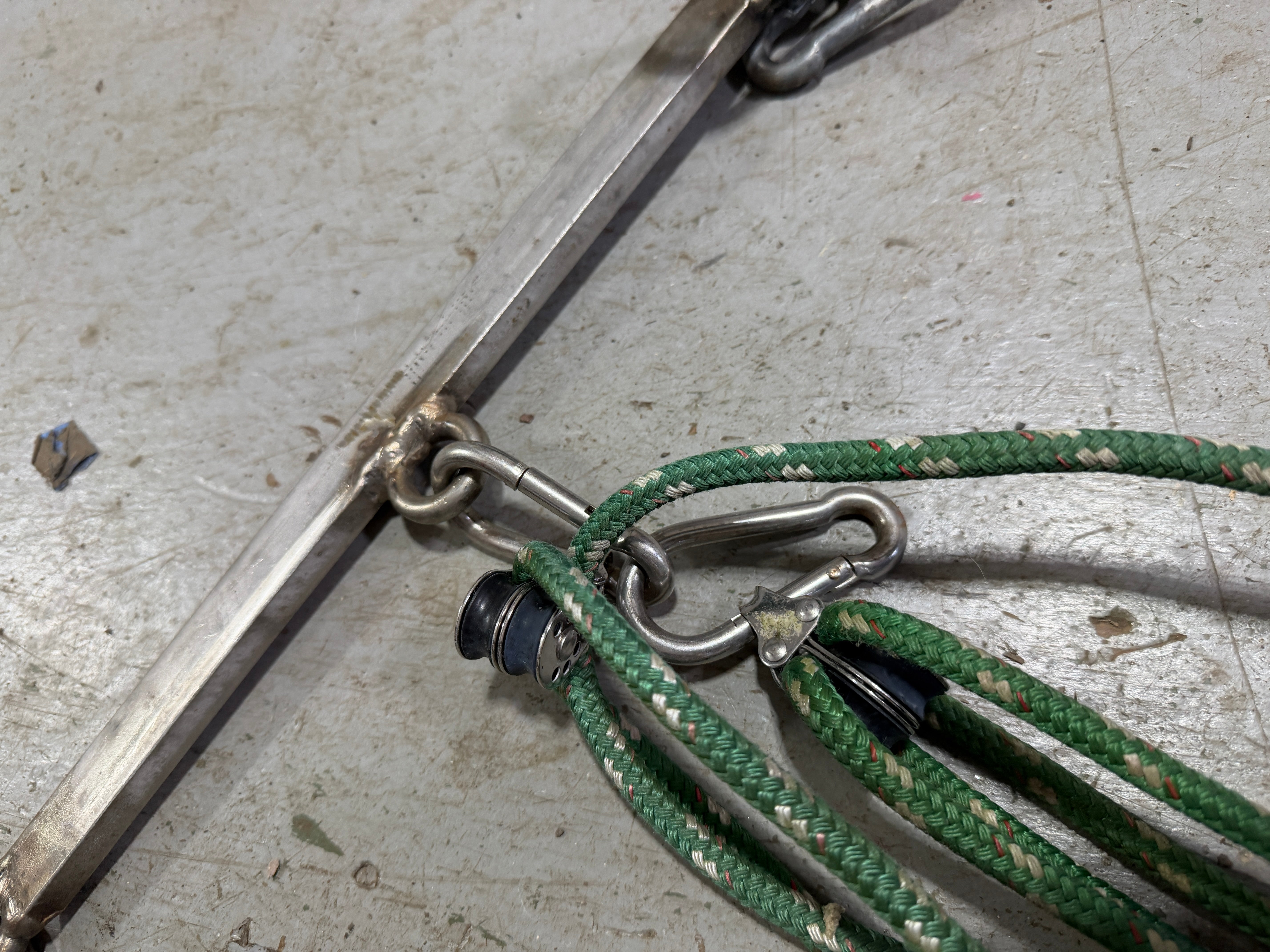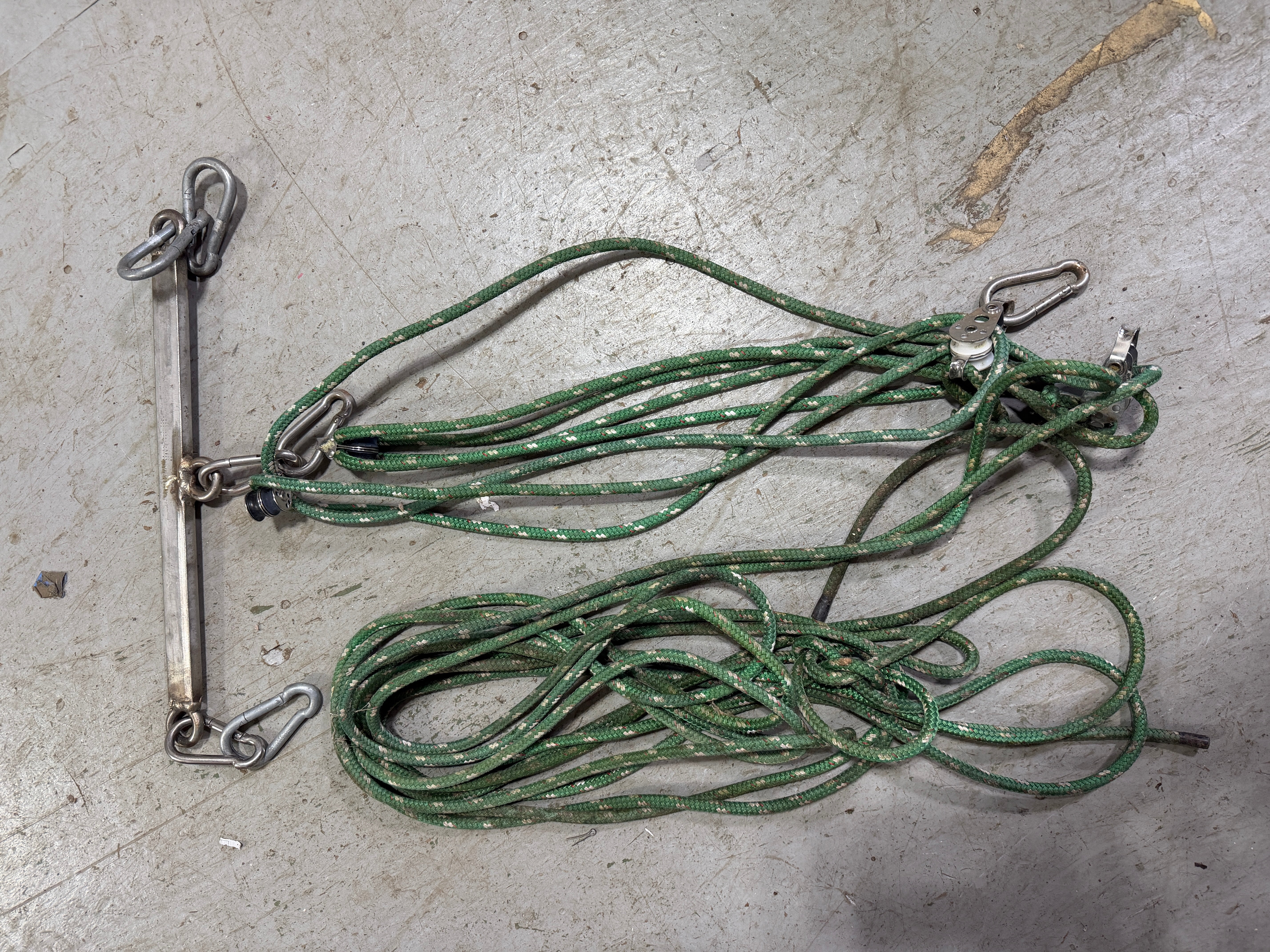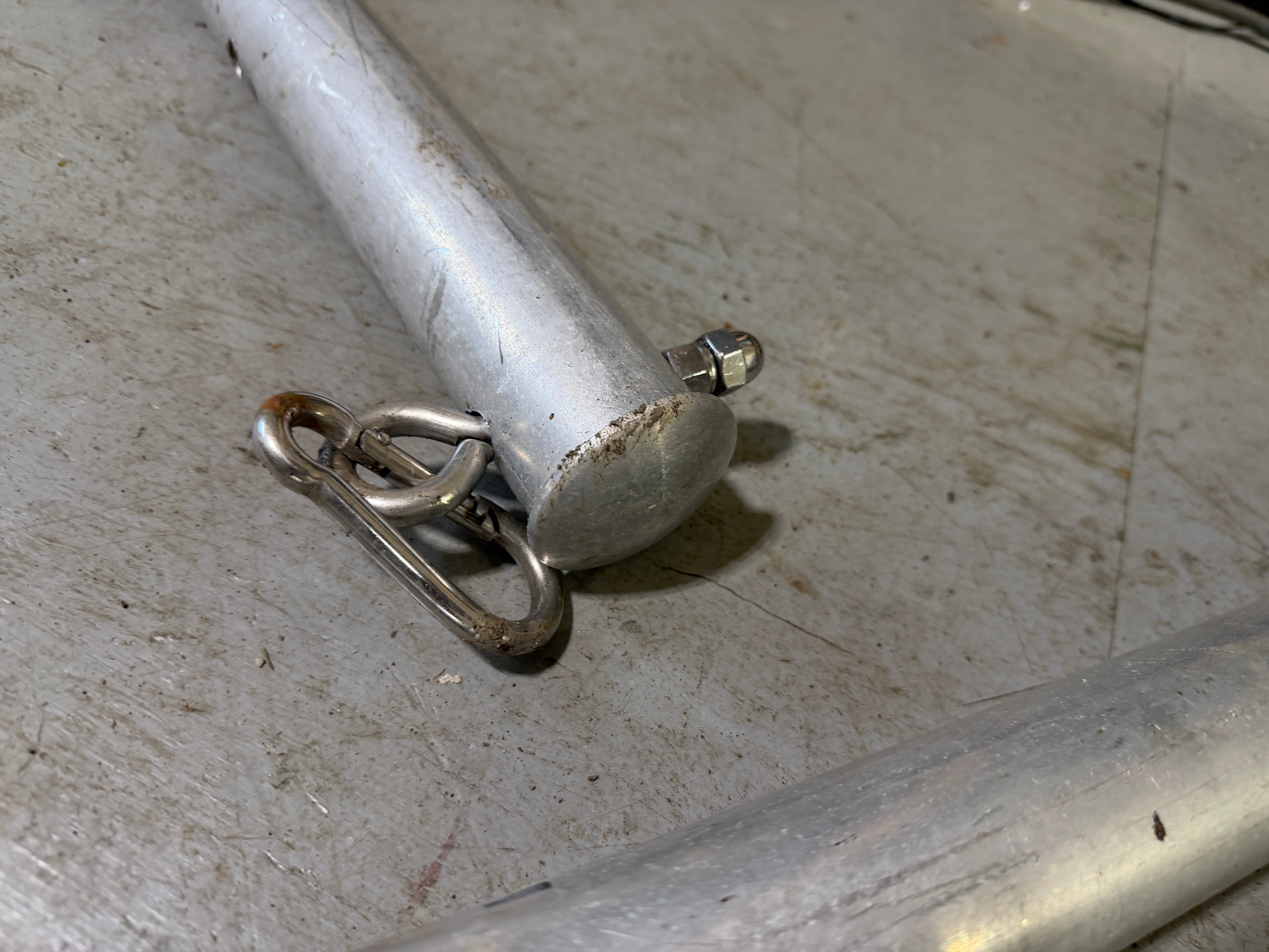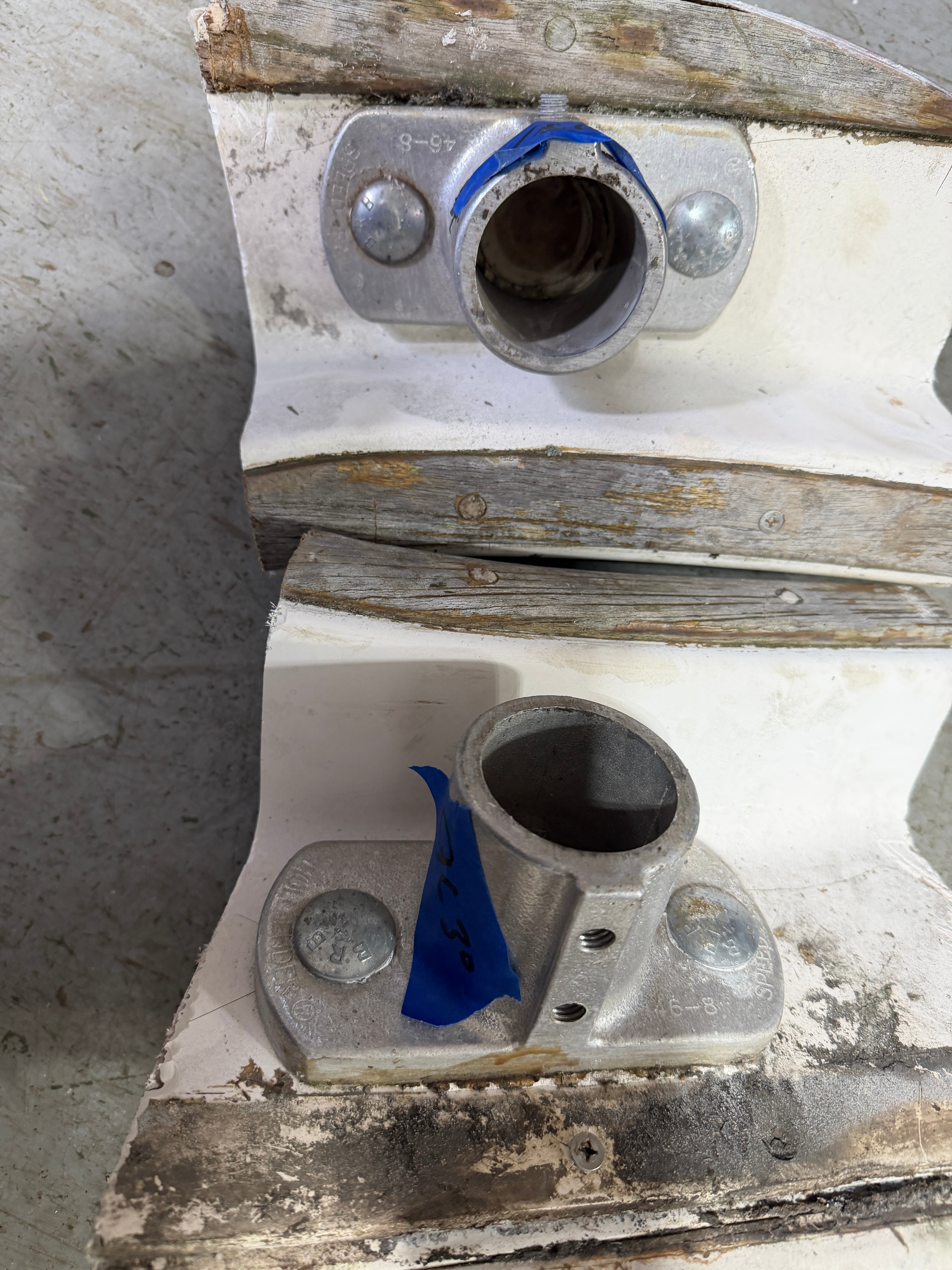 Aluminum davits removed off a CNC 30. The davits include the feet, both davits, and the rigging system that they used. Will include it with purchase but might replace the line. The davits are 1 7/8" diameter tubing. The side that sits straight from out of the mount is 35" tall. The arm out is 42" in length. The feet for mounting are labeled speed rail model 46-8. The feet are 6" in length x 2 3/4" wide.