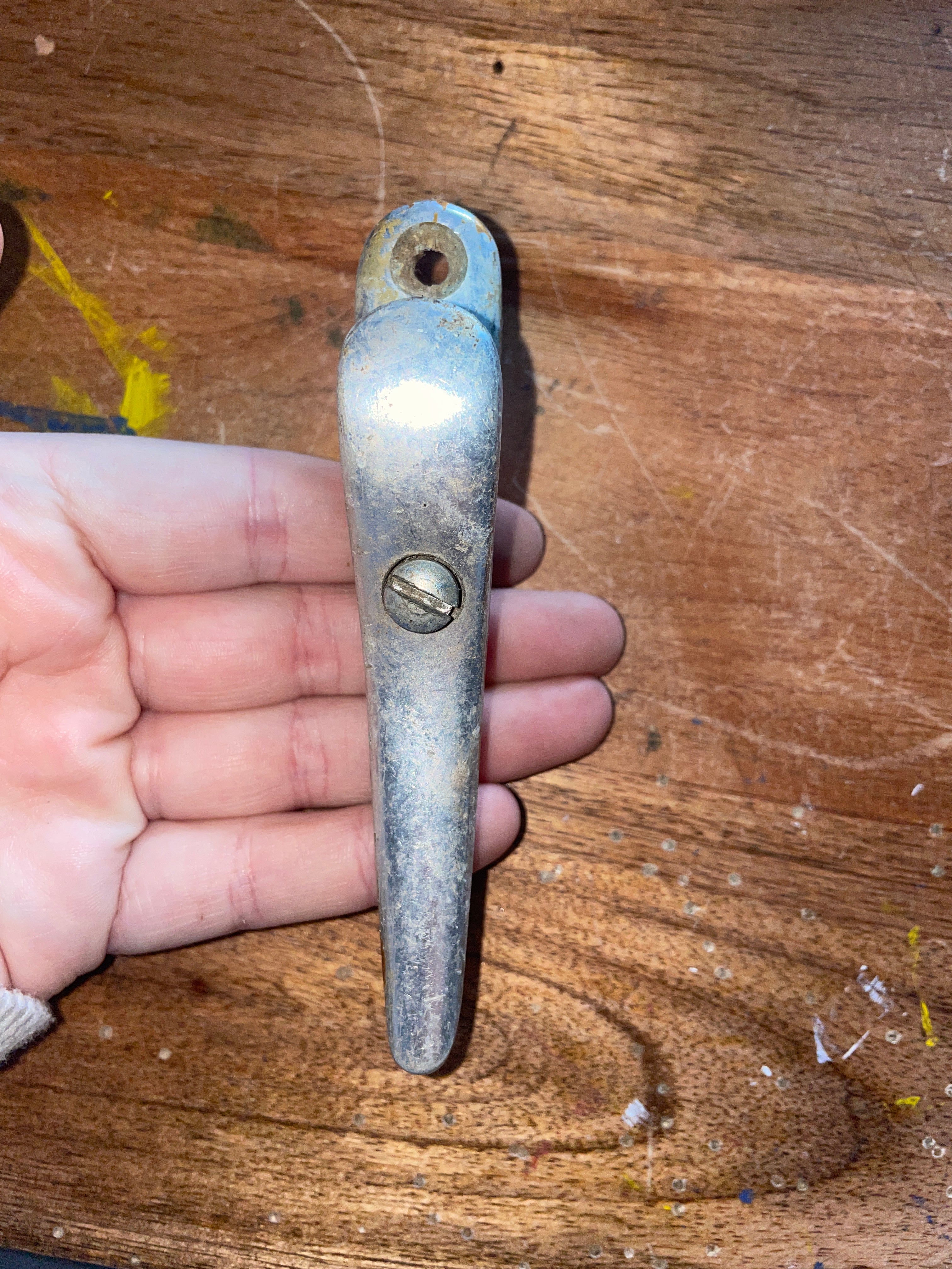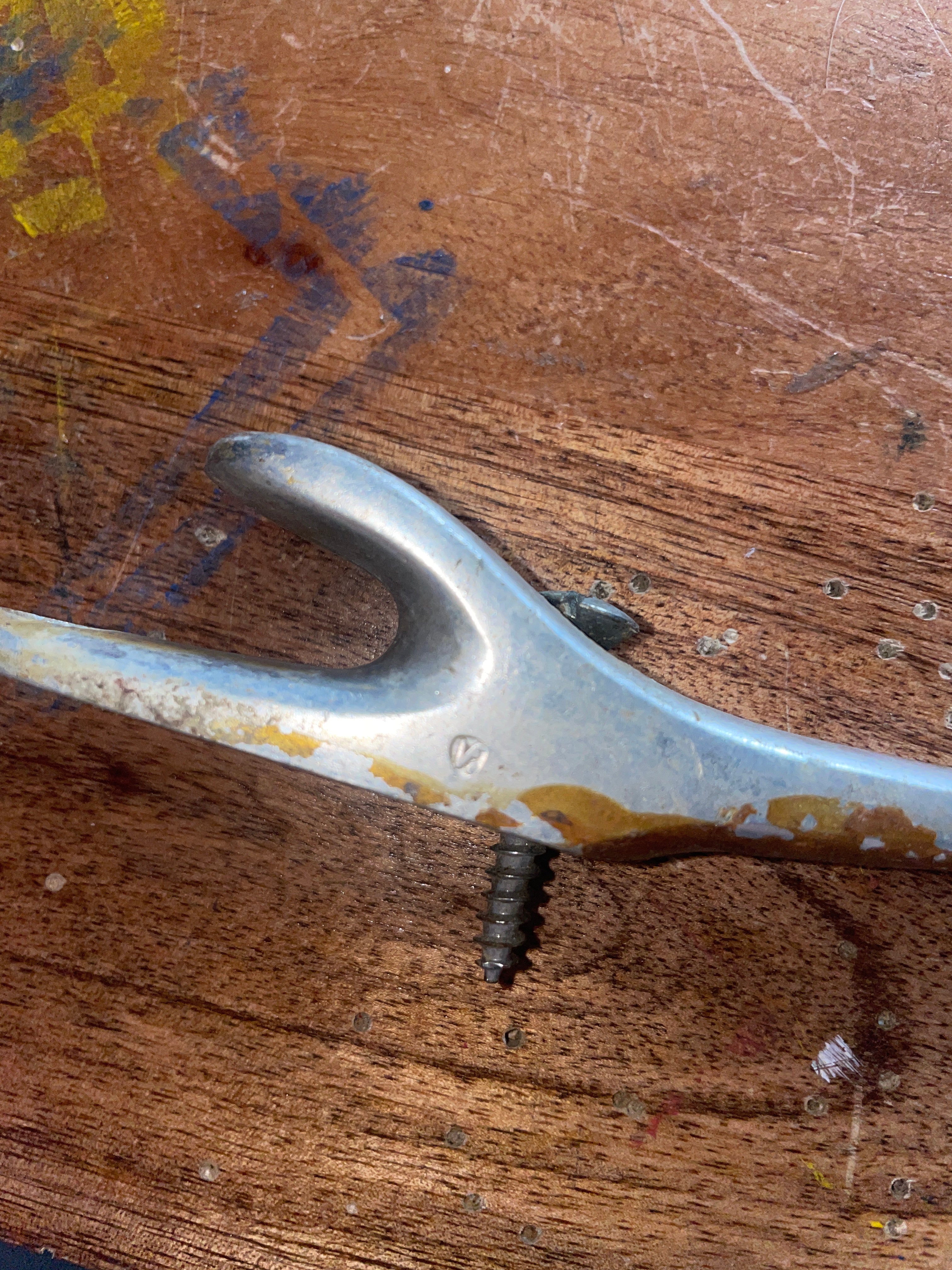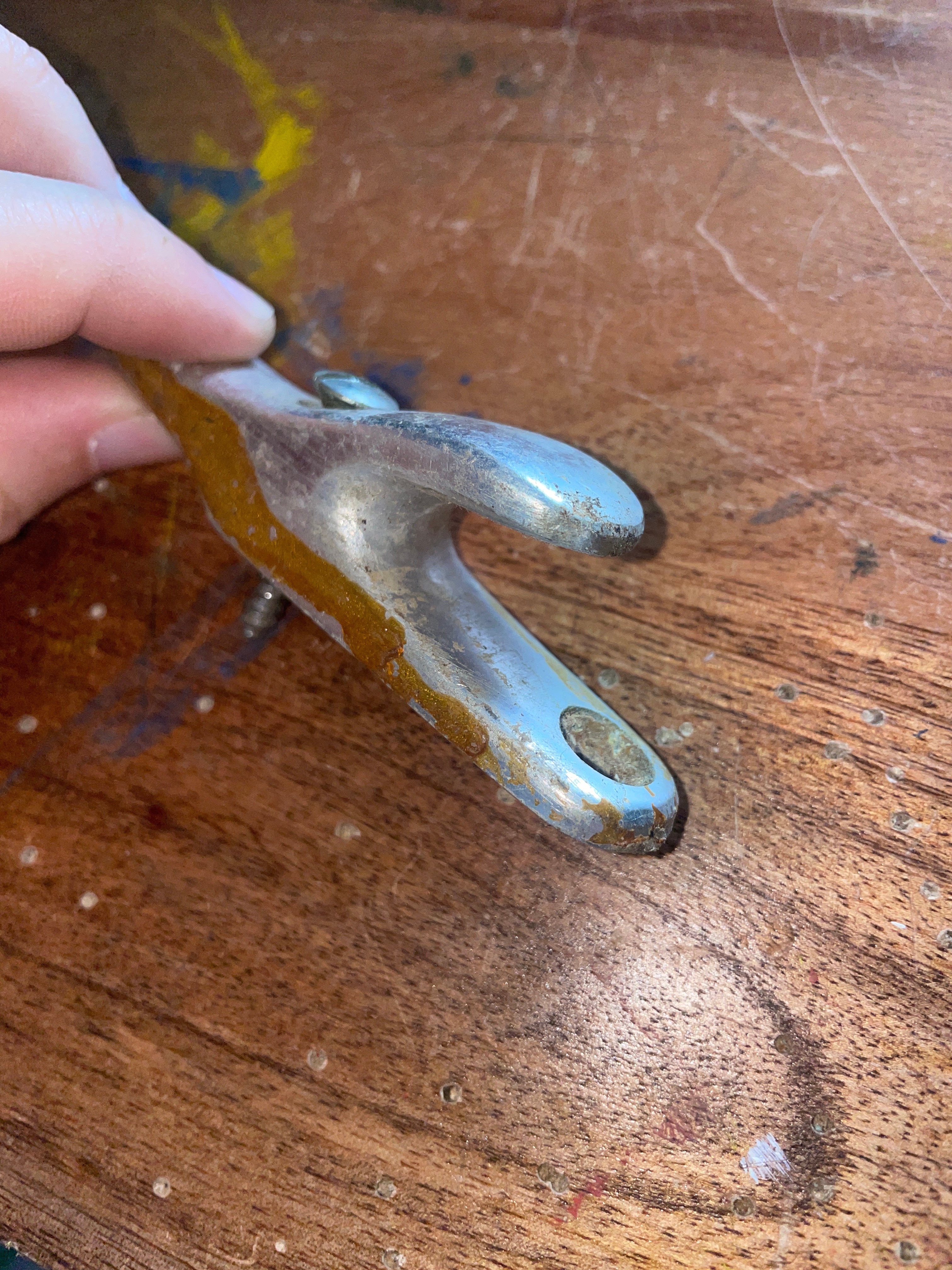 This aluminum jam cleat is in fair condition. Has some tarnished area, looks like something was spilled on it. Could probably be cleaned up. Overall length is 4 1/2”. The space or line is 1/2” diameter. Singular screw hole in middle.
