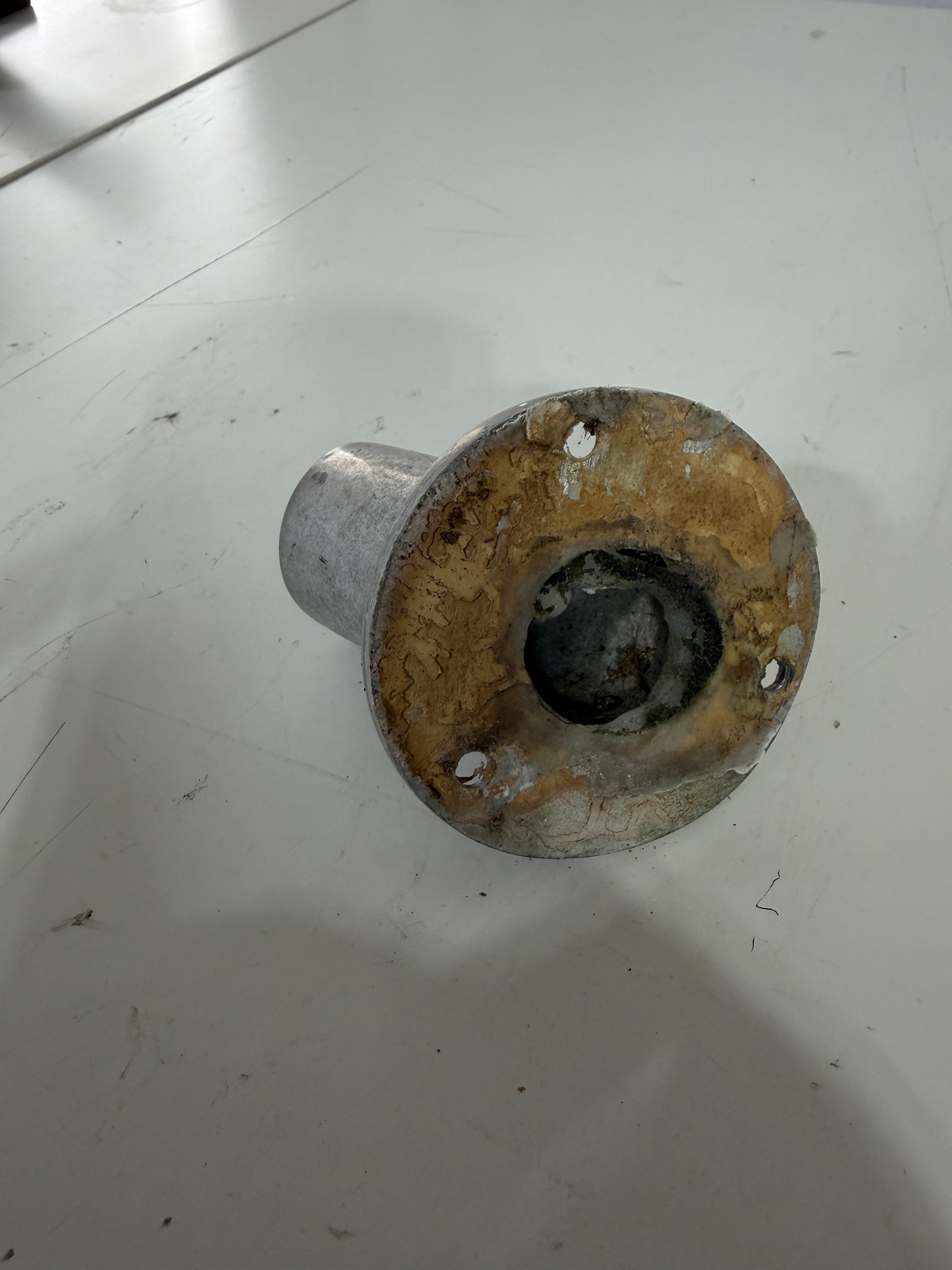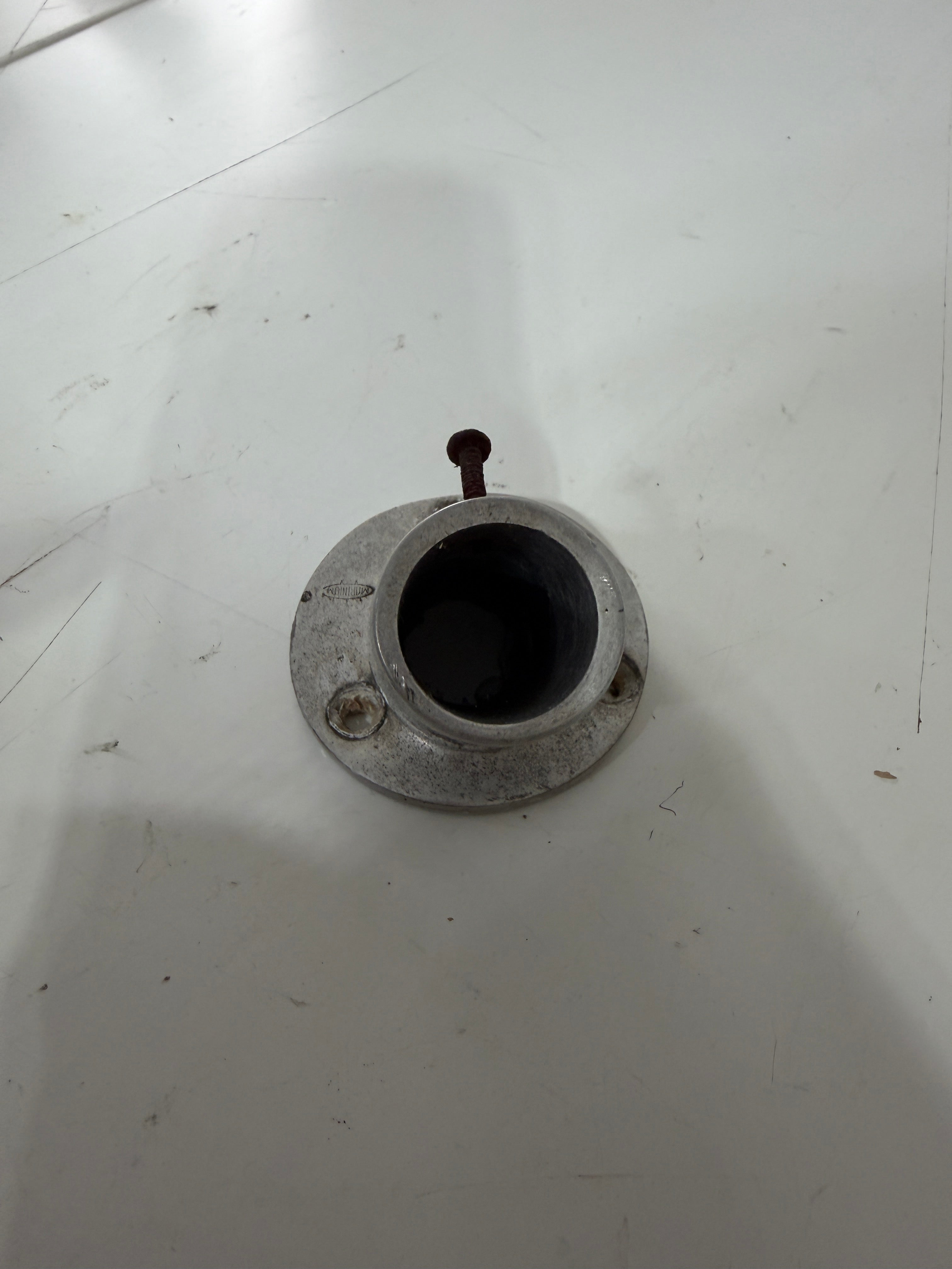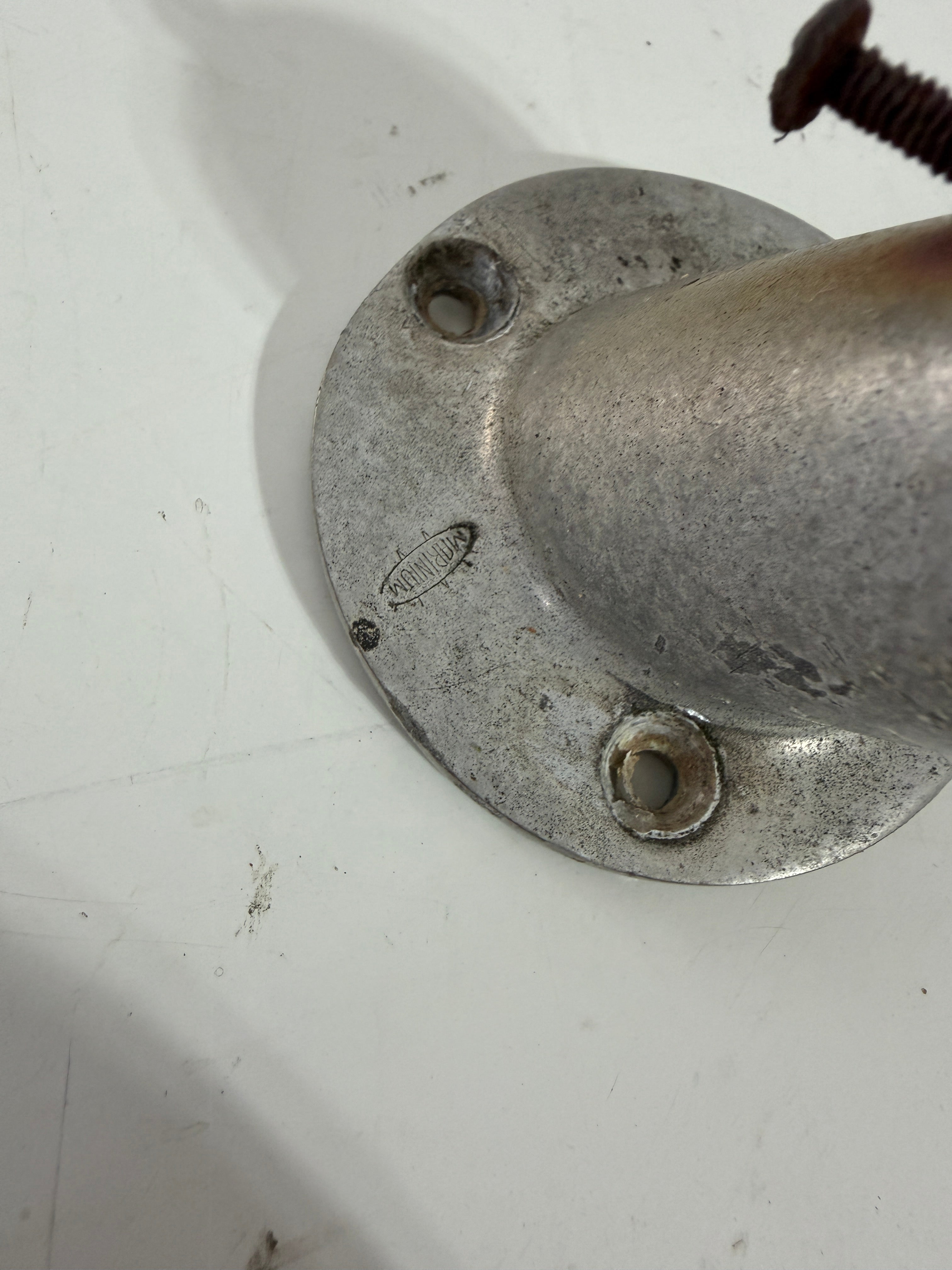 This aluminum marinium flag pole hole is in decent condition. It fits a 1" pole diameter. The base diameter is 2 5/8". Stands 2 1/2" tall. The setting bolt is rusted.